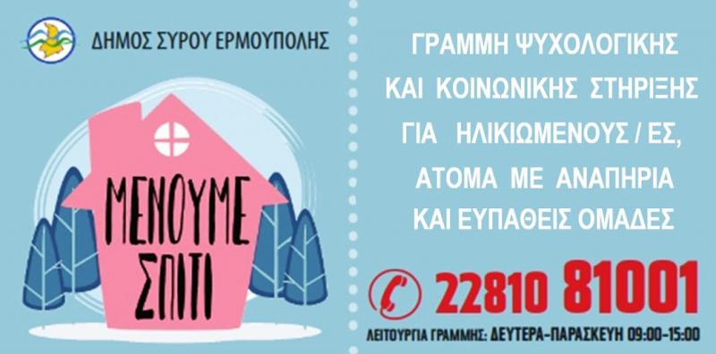 Η Κοινωνική Υπηρεσία του Δήμου Σύρου – Ερμούπολης ενημερώνει ότι, στο πλαίσιο της παροχής στήριξης, συμπαράστασης και αλληλεγγύης προς τους συμπολίτες μας, ιδιαίτερα κατά το τρέχον διάστημα της υγειονομικής κρίσης και των προληπτικών μέτρων που έχουν πλήξει οικονομικά μεγάλο μέρος του πληθυσμού, λειτουργεί Γραμμή Κοινωνικής Στήριξης στο τηλέφωνο 22810 81001 από Δευτέρα έως και Παρασκευή κατά τις ώρες 09:00-15:00.