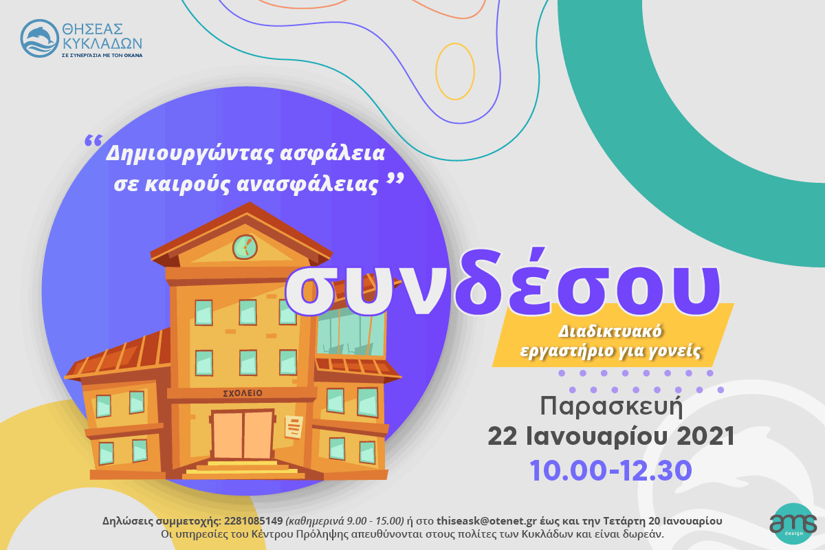 Το Κέντρο Πρόληψης των Εξαρτήσεων και Προαγωγής της Ψυχοκοινωνικής Υγείας «ΘΗΣΕΑΣ ΚΥΚΛΑΔΩΝ» στην προσπάθεια του να υποστηρίξει τους γονείς και σε αυτές τις ιδιαίτερες συνθήκες, διοργανώνει –παράλληλα με τη συστηματική εκπαίδευση γονέων σε ομάδες– διαδικτυακά εργαστήρια συγκεκριμένης θεματολογίας. Η θεματολογία διαμορφώνεται με βάση τις ανάγκες και τις προκλήσεις, που αντιμετωπίζουν οι γονείς αυτή την περίοδο.