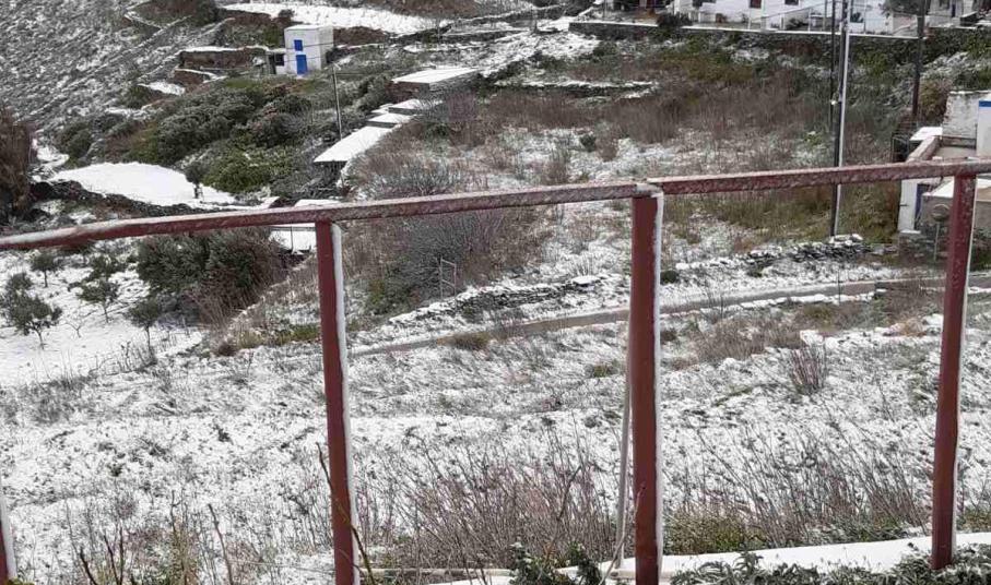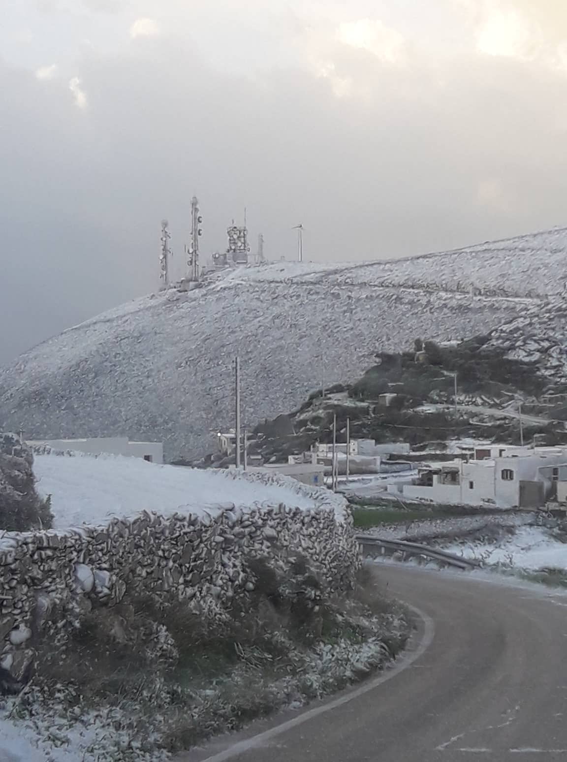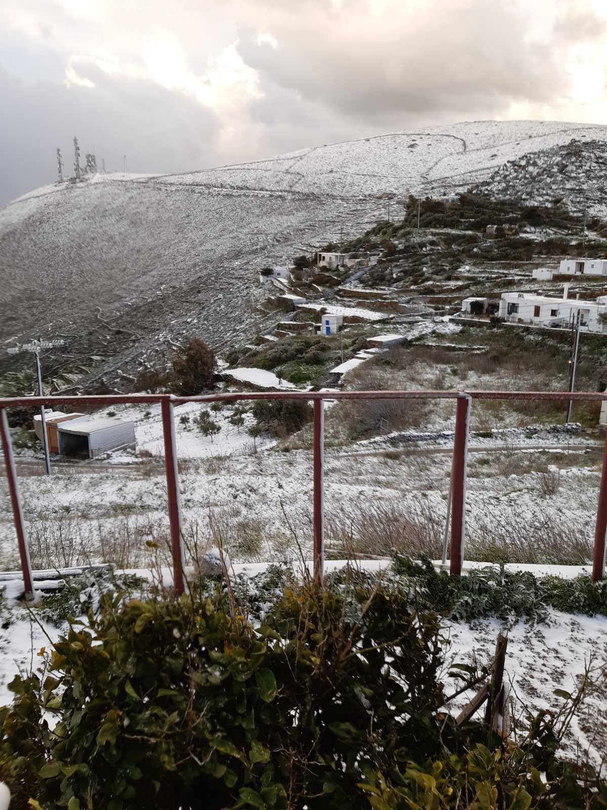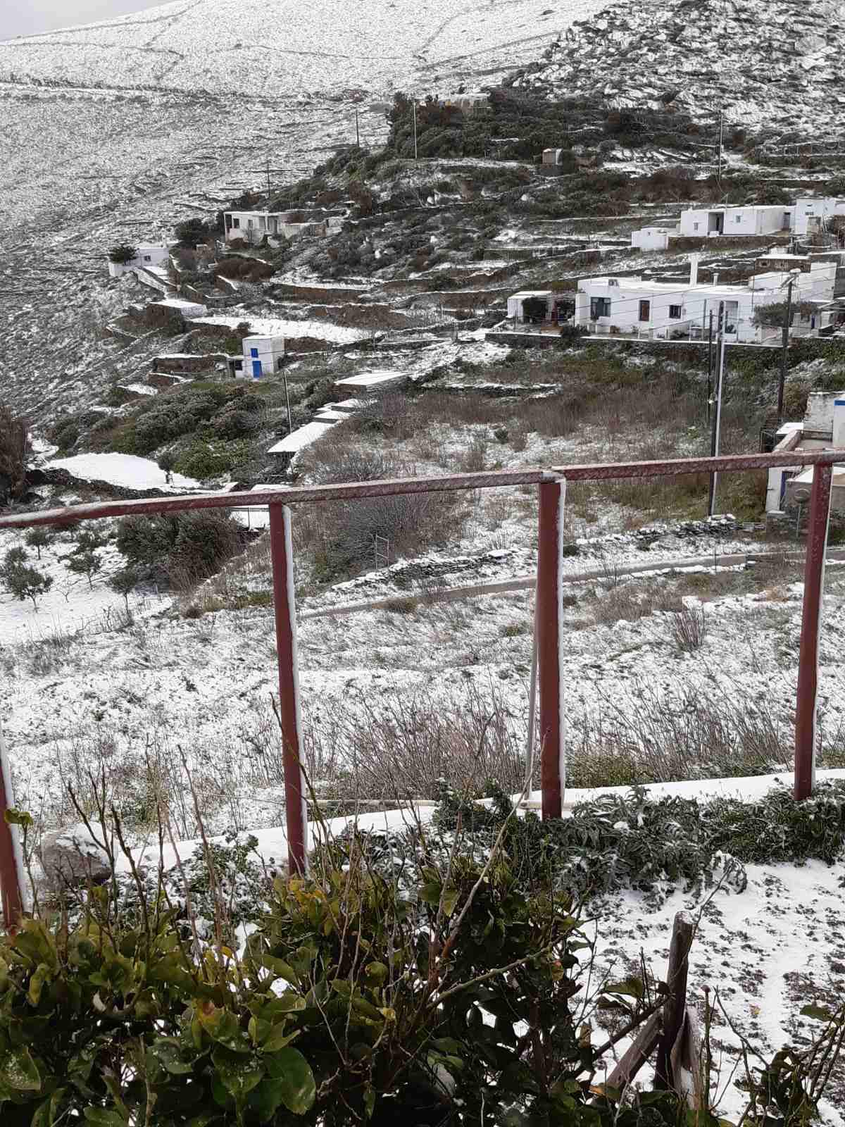 Σε αντίθεση με άλλες περιοχές της Ελλάδας, η Σύρος μπορεί να μην έχει ντυθεί στα άσπρα, ωστόσο, οι χαμηλές θερμοκρασίες βοήθησαν να υπάρξει ένα λεπτό στρώμα χιονιού και πάγου σε μεγάλες εκτάσεις της Απάνω Μεριάς.