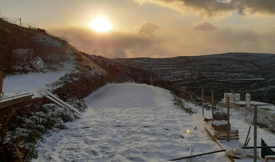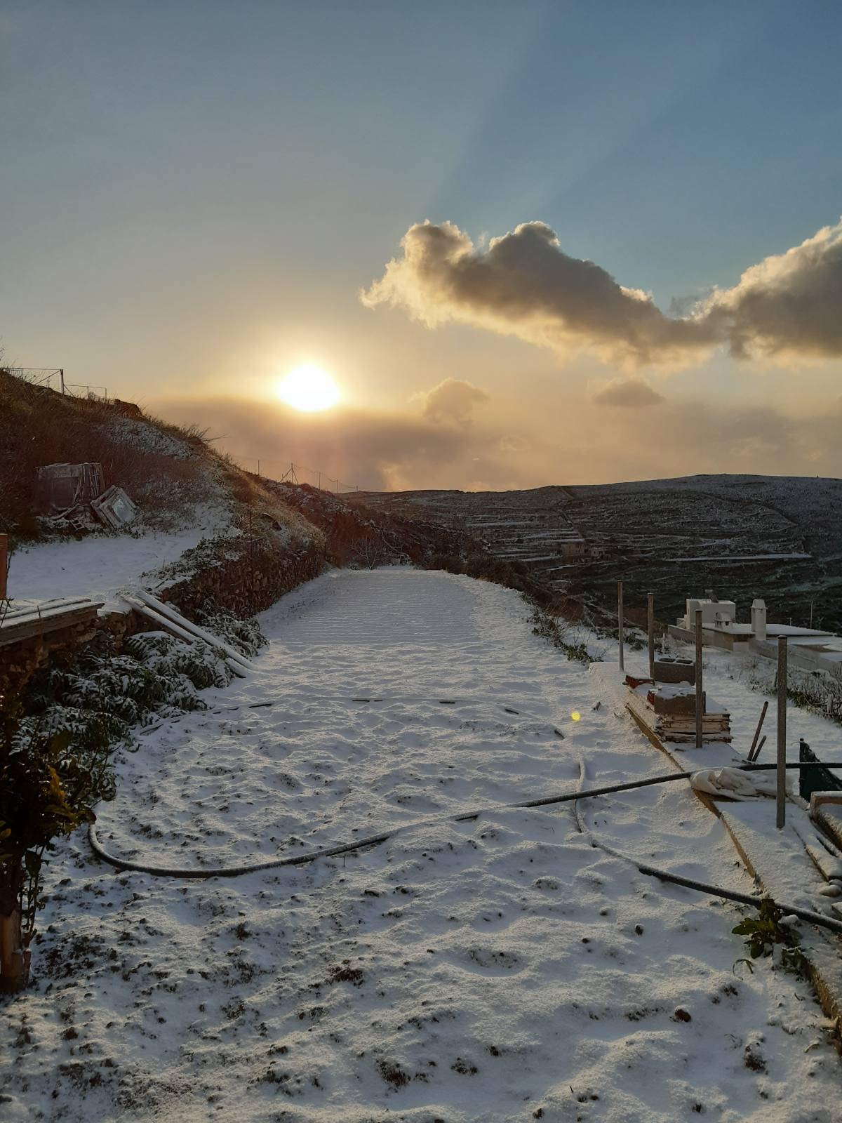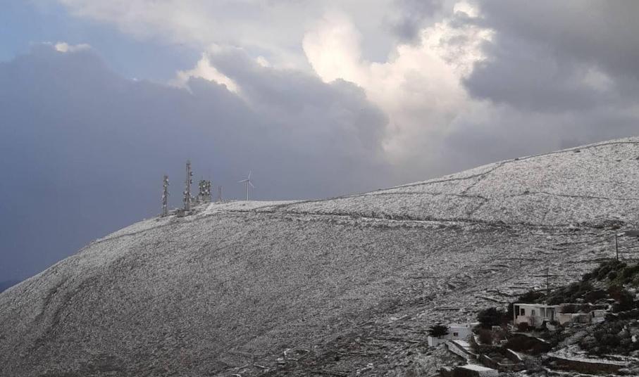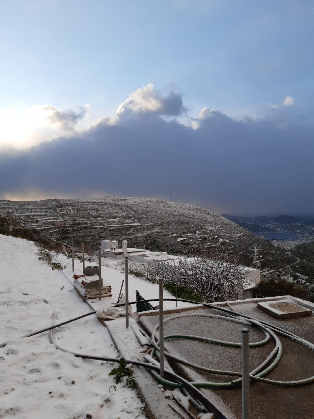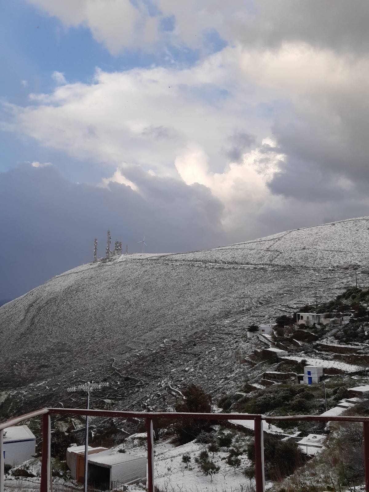 Σε αντίθεση με άλλες περιοχές της Ελλάδας, η Σύρος μπορεί να μην έχει ντυθεί στα άσπρα, ωστόσο, οι χαμηλές θερμοκρασίες βοήθησαν να υπάρξει ένα λεπτό στρώμα χιονιού και πάγου σε μεγάλες εκτάσεις της Απάνω Μεριάς.