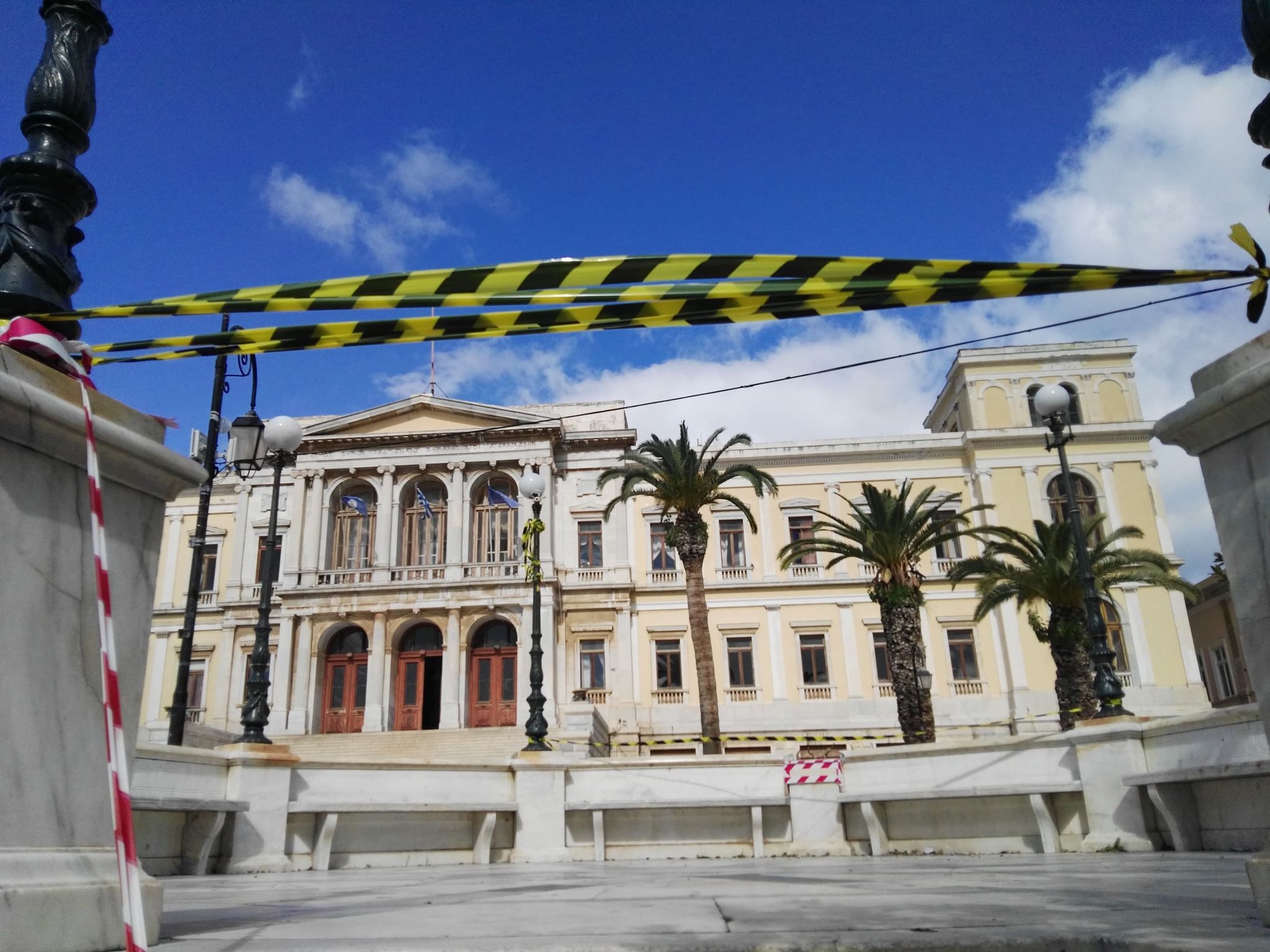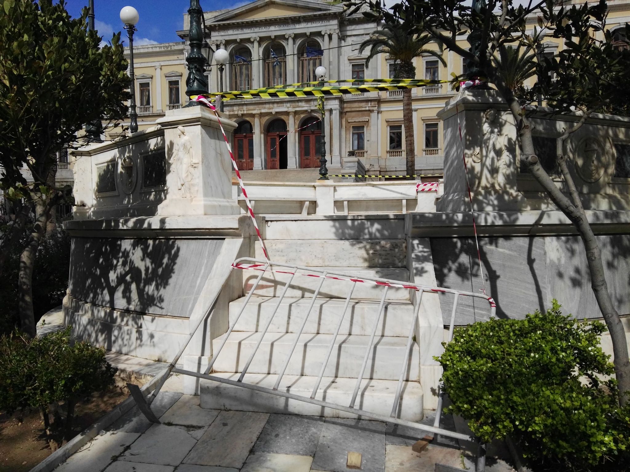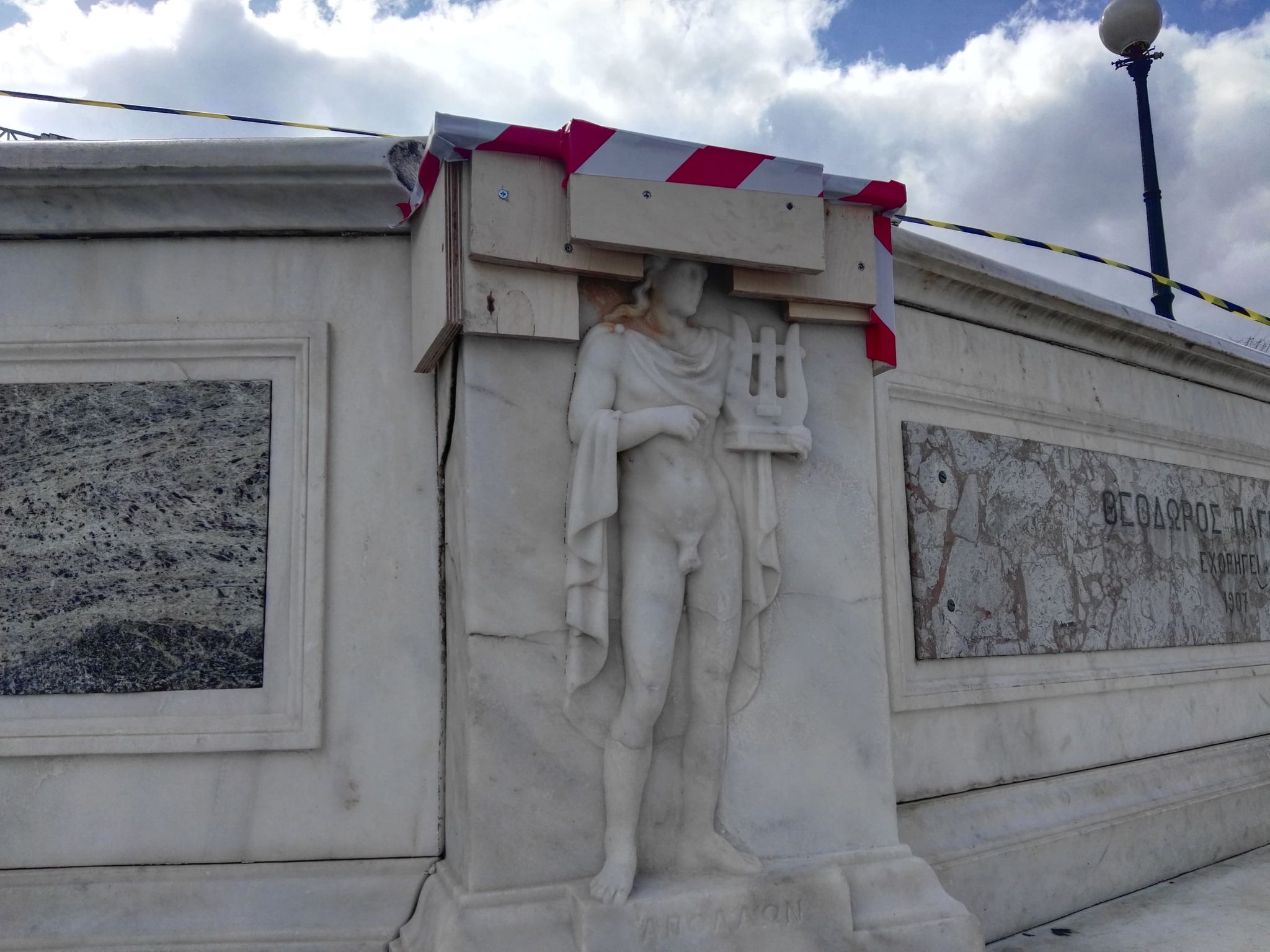 Το ισχυρότερο “τραύμα” σε αυτήν δε, εντοπίζεται στην ανάγλυφη παρουσίαση του Απόλλωνα στην εξωτερική επιφάνειά της, με αποτέλεσμα η Τεχνική Υπηρεσία του Δήμου Σύρου – Ερμούπολης, να προέβη σε πρόχειρη “διάσωση” του τμήματος, μέχρι την αποκατάσταση.
