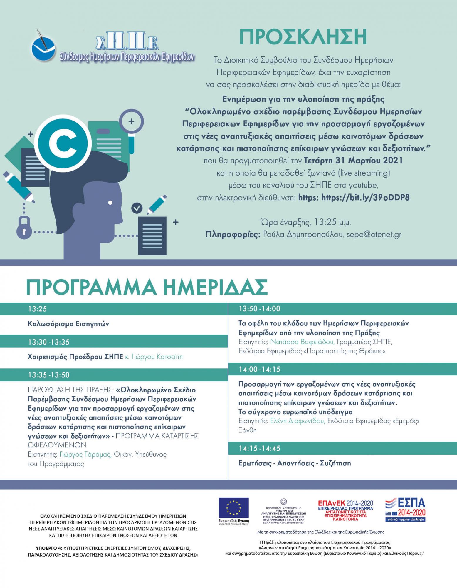 «ΟΛΟΚΛΗΡΩΜΕΝΟ ΣΧΕΔΙΟ ΠΑΡΕΜΒΑΣΗΣ ΣΥΝΔΕΣΜΟΥ ΗΜΕΡΗΣΙΩΝ ΠΕΡΙΦΕΡΕΙΑΚΩΝ ΕΦΗΜΕΡΙΔΩΝ ΓΙΑ ΤΗΝ ΠΡΟΣΑΡΜΟΓΗ ΕΡΓΑΖΟΜΕΝΩΝ ΣΤΙΣ ΝΕΕΣ ΑΝΑΠΤΥΞΙΑΚΕΣ ΑΠΑΙΤΗΣΕΙΣ ΜΕΣΩ ΚΑΙΝΟΤΟΜΩΝ ΔΡΑΣΕΩΝ ΚΑΤΑΡΤΙΣΗΣ ΚΑΙ ΠΙΣΤΟΠΟΙΗΣΗΣ ΕΠΙΚΑΙΡΩΝ ΓΝΩΣΕΩΝ ΚΑΙ ΔΕΞΙΟΤΗΤΩΝ», που θα πραγματοποιηθεί την Τετάρτη 31 Μαρτίου 2021, στις 13:25 μ.μ. και η οποία θα μεταδοθεί ζωντανά (live streaming) μέσω του καναλιού του ΣΗΠΕ στο youtube, στην ηλεκτρονική διεύθυνση: https: https://bit.ly/39oDDP8.