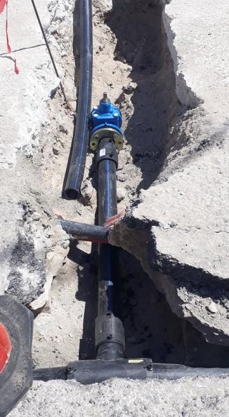 Ήδη έχουν τοποθετηθεί οι διακλαδώσεις του νέου δικτύου με εκείνες που καταλήγουν στα οικιακά δίκτυα (ρολόγια) οι βάνες του δικτύου (τα μπλε εξαρτήματα με τον κατακόρυφο ανοξείδωτο άξονα με τετράγωνη απόληξη), οι γωνίες έδρασης (πεδιλογωνίες) (τα εξαρτήματα με την κυκλική διατομή με άνω κατεύθυνση και τις κυκλικές τρύπες) όπου σε αυτά θα τοποθετηθούν νέα πυροσβεστικά υδροστόμια.