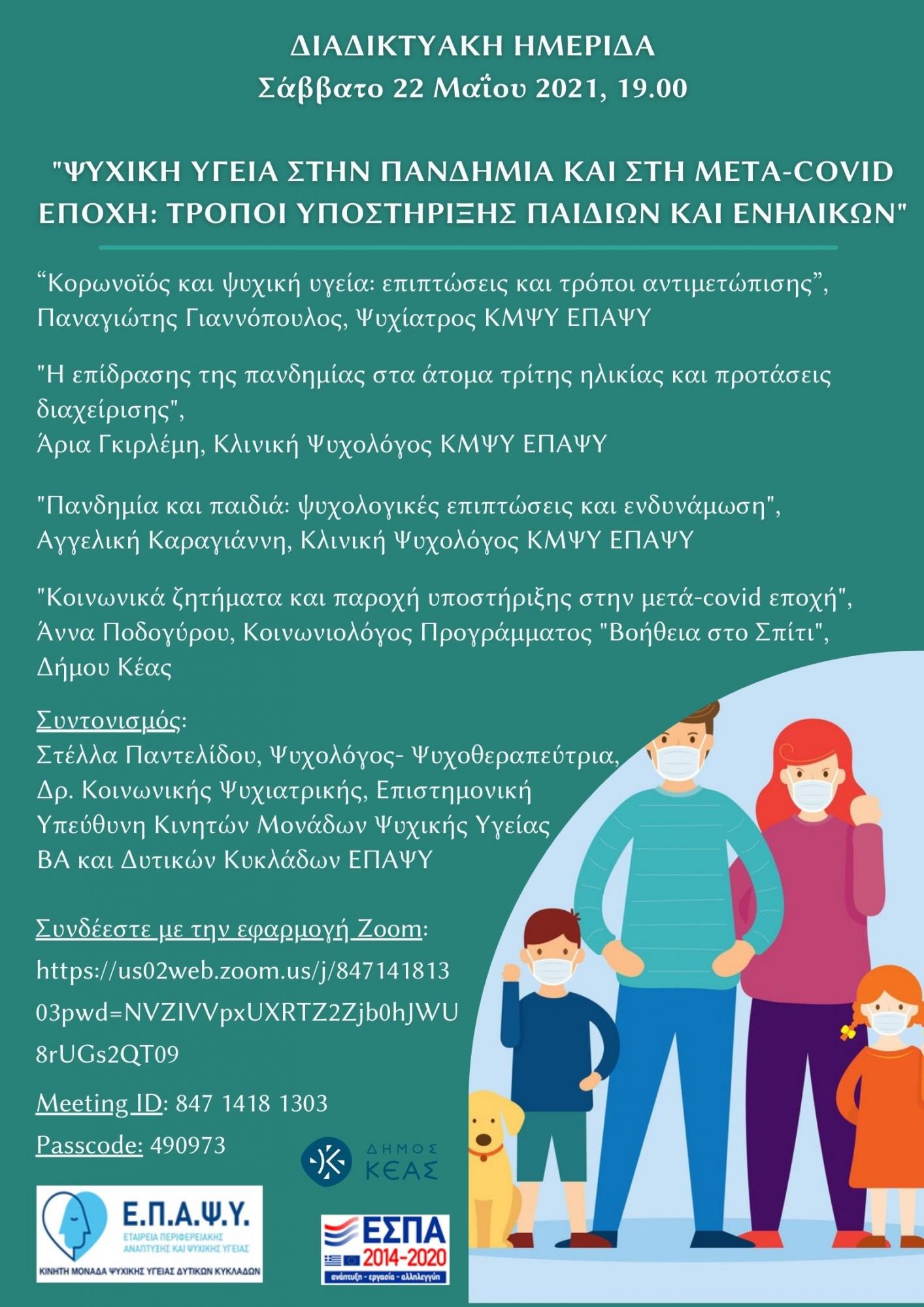 Διαδικτυακή ημερίδα που θα πραγματοποιηθεί το Σάββατο 22/5 στις 7:00μμ με θέμα: ”Ψυχική Υγεία στην πανδημία και στη μετά-covid εποχή: Τρόποι υποστήριξης παιδιών και ενηλίκων”, στην οποία θα συμμετέχουν ο ψυχίατρος και οι ψυχολόγοι του κλιμακίου Κέας από την Κινητή Μονάδα Ψυχικής Υγείας ΕΠΑΨΥ και η κοινωνιολόγος του προγράμματος «Βοήθεια στο Σπίτι» του Δήμου Κέας.
