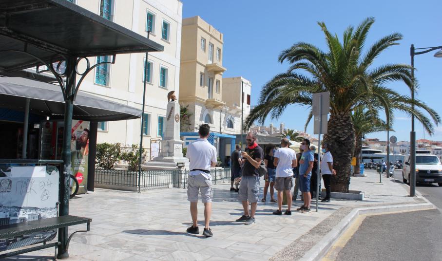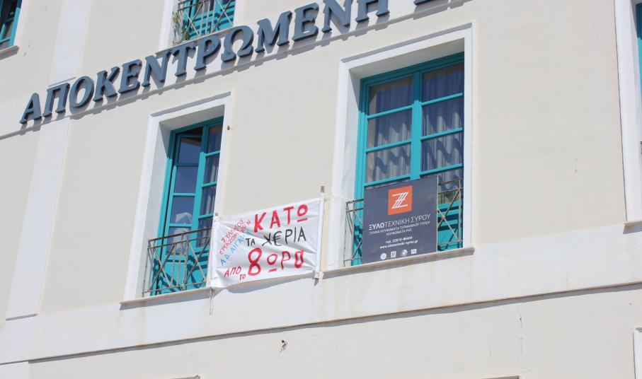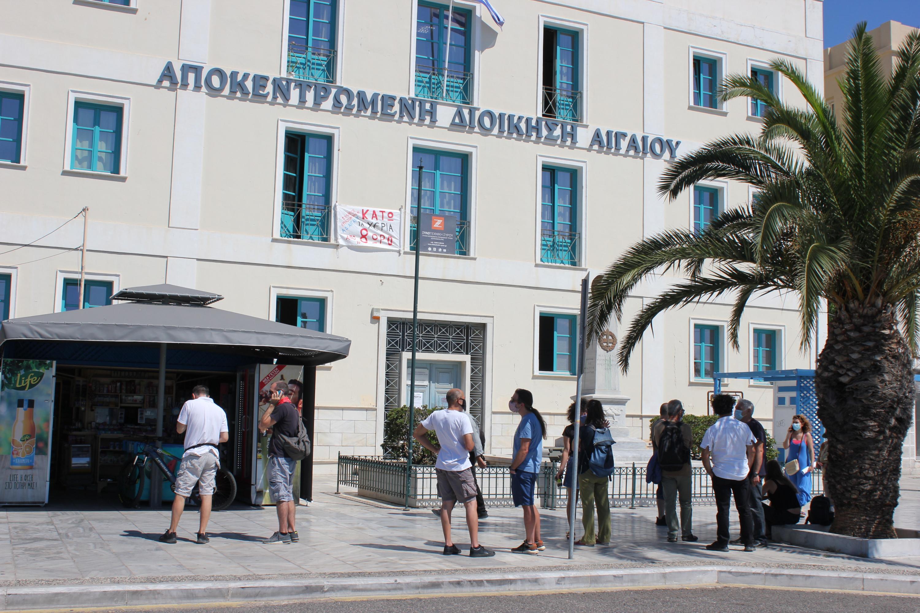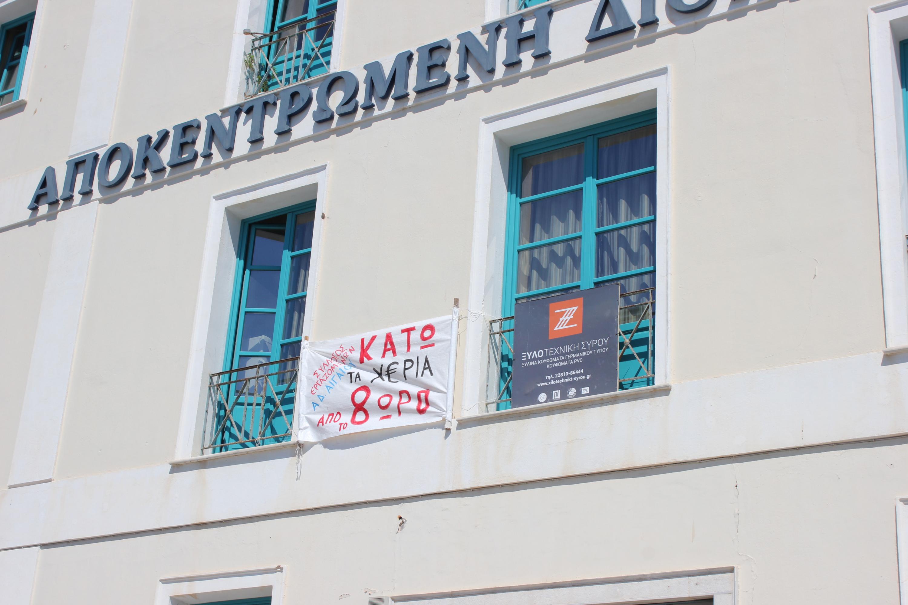 Στο κτίριο της Αποκεντρωμένης Διοίκησης Αιγαίου στην Ερμούπολη συγκεντρώθηκε μικρός αριθμός εργαζομένων, προκειμένου να απευθύνει μήνυμα αγώνα και πάλης ενάντια στα “χτυπήματα της κυβέρνησης στο 8ωρο και στα εργασιακά και συλλογικά δικαιώματα των εργαζομένων”.