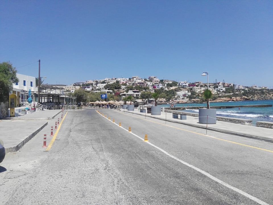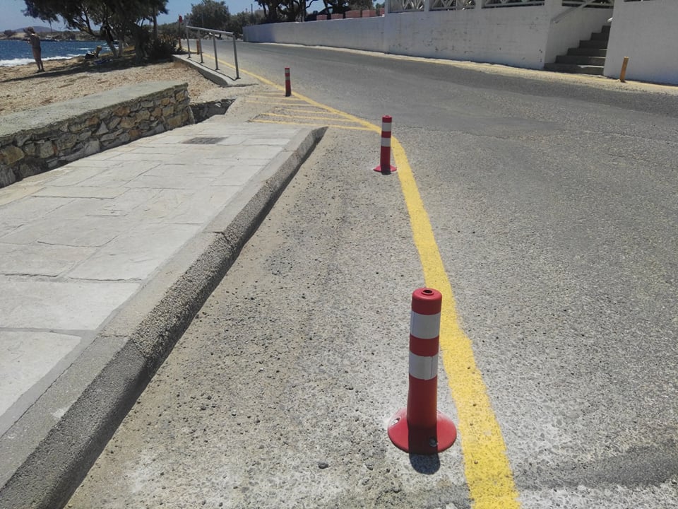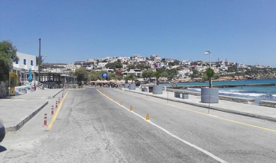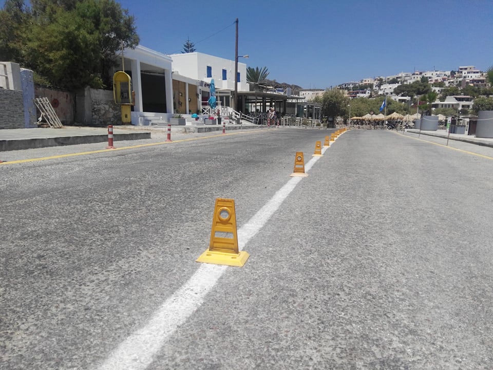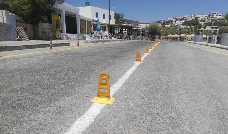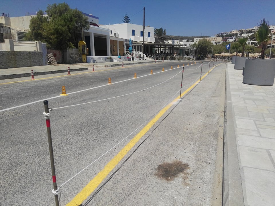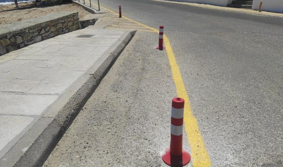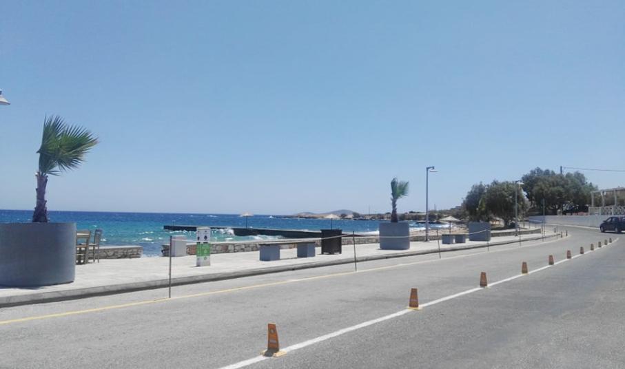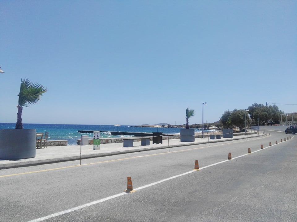 Συγκεκριμένα, μετά από την τοποθέτηση φοινικοειδών στο παραλιακό πεζοδρόμιο, το Λιμενικό Ταμείο Σύρου προχώρησε σε διαγραμμίσεις και στην τοποθέτηση μικρών και διακριτικών εμποδίων κατά μήκος του παραλιακού δρόμου προκειμένου να πάψει να υφίσταται η παράνομη στάθμευση οχημάτων και δικύκλων. Επιπλέον, οριοθετήθηκε ο πεζοδιάδρομος ενώ τοποθετήθηκαν καλαίσθητα προστατευτικά στις προβολές των επιχειρήσεων.