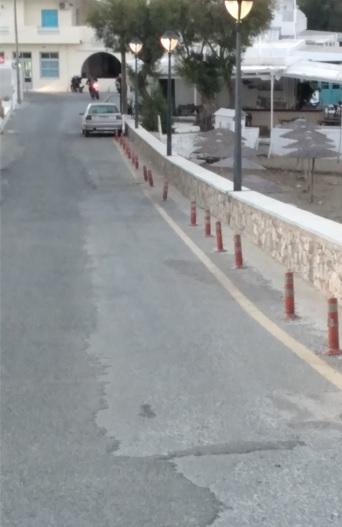 Θέλω λοιπόν να σας πληροφορήσω, ότι τέτοιου είδους εύκαμπτα κολωνάκια, είχαν τοποθετηθεί στο παρελθόν, αλλά το μέτρο δεν απέδωσε, μιας και μερικοί οδηγοί, αρνούμενοι την νομιμότητα, τα έβγαλαν άχρηστα πριν τη λήξη της τουριστικής περιόδου. Εξάλλου, όπως φαίνεται και στην φωτο 4, υπάρχει κίτρινη διαγράμμιση και δυο απαγορευτικές πινακίδες στη συγκεκριμένη οδό, τα οποία αγνοούνται από μερίδα οδηγών.