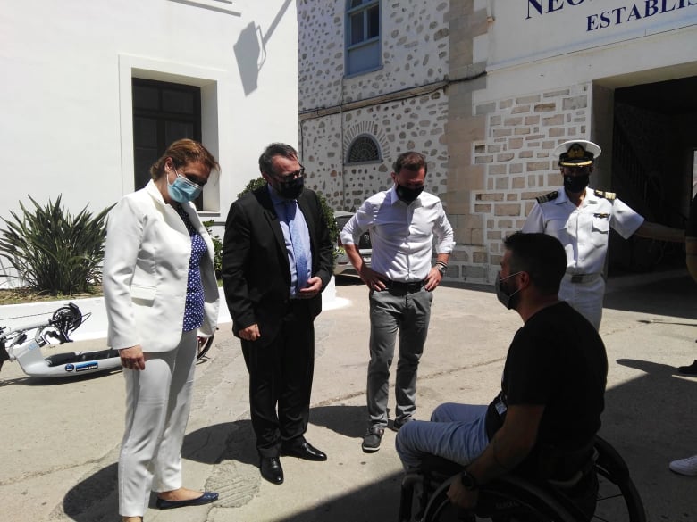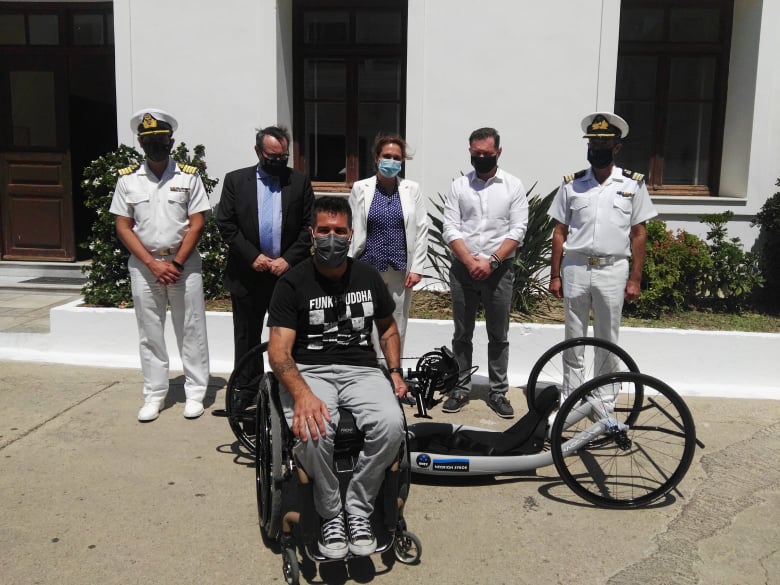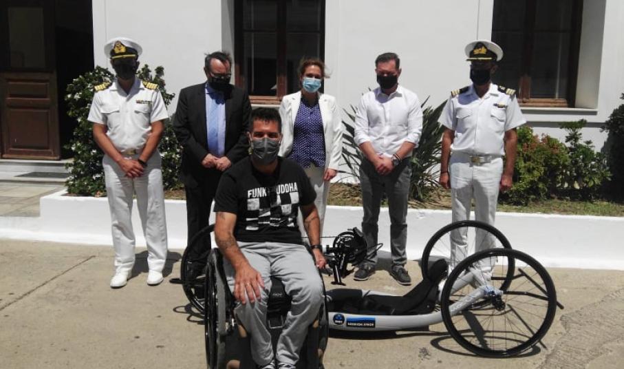 Η παράδοση του ποδηλάτου έγινε σήμερα στις εγκαταστάσεις του Νεωρίου από τον πρόεδρο της ΟΝΕΧ, ενώ με τον Νίκο Ρούσσο συνομίλησαν οι δύο Γενικοί Γραμματείς των Υπουργείων Τουρισμού και Ναυτιλίας που μετέβησαν στο ναυπηγείο.