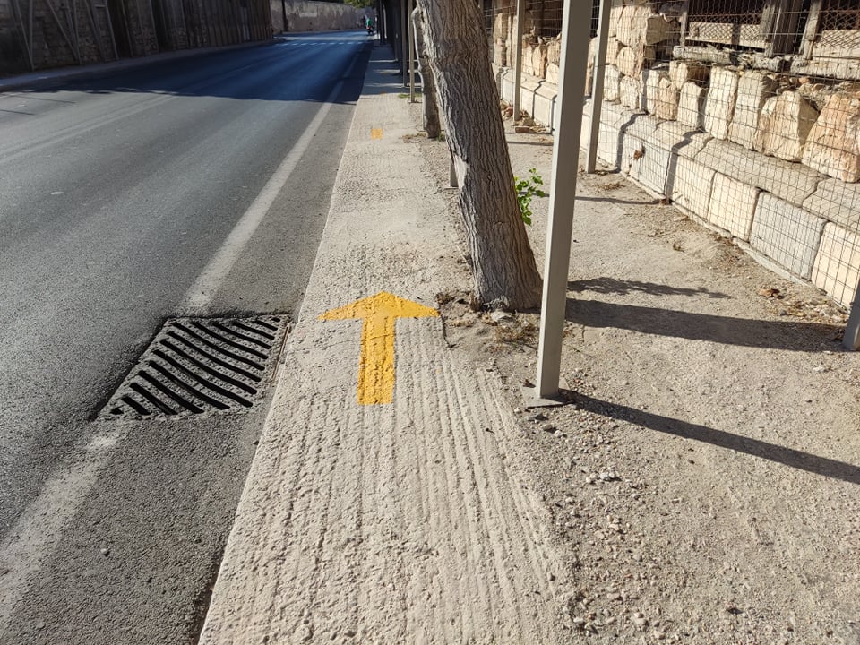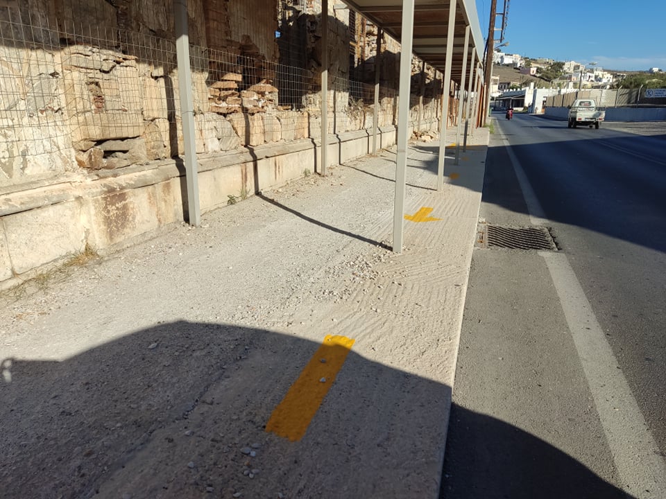 Ειδικότερα, με ευθύνη της Περιφέρειας έγιναν κίτρινες διαγραμμίσεις με βέλη που δείχνουν την ορθή κατεύθυνση από την οποίαν πρέπει να μετακινούνται οι πολίτες, προκειμένου να μην κινδυνεύουν ούτε από την ενδεχόμενη αποκόλληση τμημάτων των χαλασμάτων, ούτε όμως και από τα διερχόμενα οχήματα.