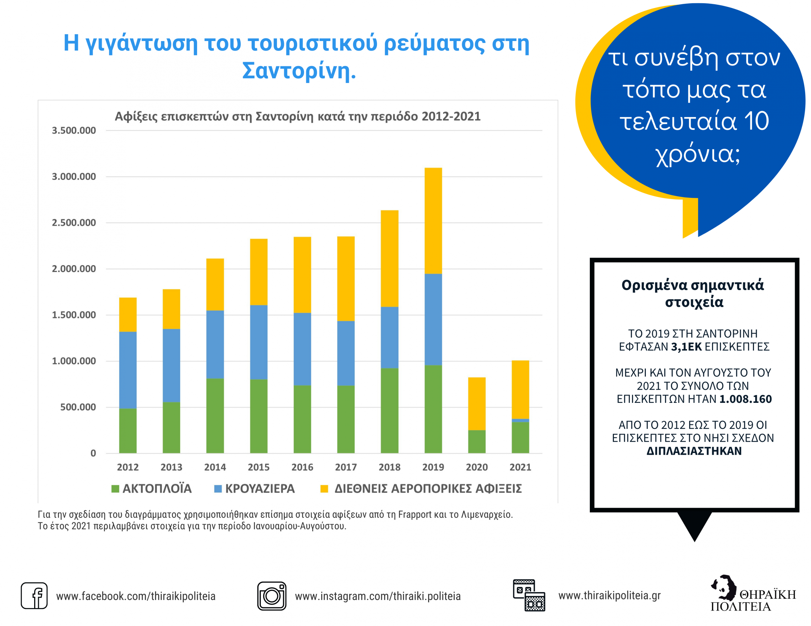 Αν εξαιρέσουμε το μικρό διάλειμμα του 2020 λόγω πανδημίας η εικόνα που παρουσίαζε το νησί της Σαντορίνης τα προηγούμενα χρόνια ήταν κάτι παραπάνω από ανησυχητική. Με το 11% της συνολικής επιφάνειας του νησιού χτισμένο (ποσοστό που συναντάται στην Αττική), με 2000 τόνους απορριμμάτων κάθε μήνα ( εκ των οποίων μόνο το 5% ανακυκλώνονται), με ετήσια κατανάλωση ύδρευσης 1.760.000 κβμ,  με περιορισμένους και προβληματικούς υδάτινους πόρους , με πάνω από 900.000 χιλιάδες επισκέπτες κρουαζιέρας τον χρόνο (παρά την προσπάθεια που έγινε με το Berth Allocation System για μη ταυτόχρονες αφίξεις) και περίπου 3,1 εκ. τουρίστες συνολικά στο νησί καθώς και εκατοντάδες πούλμαν, βανάκια και γουρούνες να συνωστίζονται στους στενούς δρόμους του νησιού το πρόβλημα φαίνεται πως δεν είναι μόνο η έλλειψη επαρκών υποδομών αλλά και η ίδια η διαχείριση. Άλλωστε όσο και αν διορθωθούν οι υποδομές ή προστεθούν νέες, στο μέτρο και την κλίμακα ενός τόπου όπως η Σαντορίνη ,πράγμα απαραίτητο, η ίδια η έκταση του νησιού δίνει τα όρια των δυνατοτήτων της.