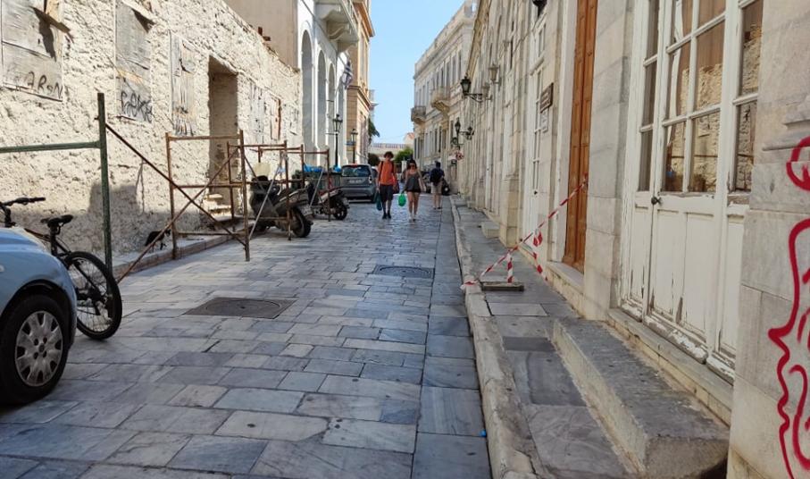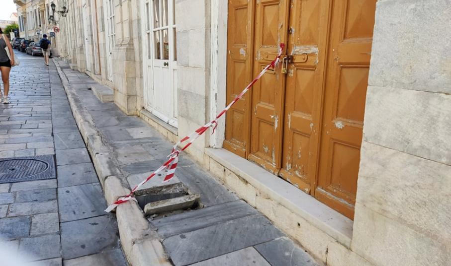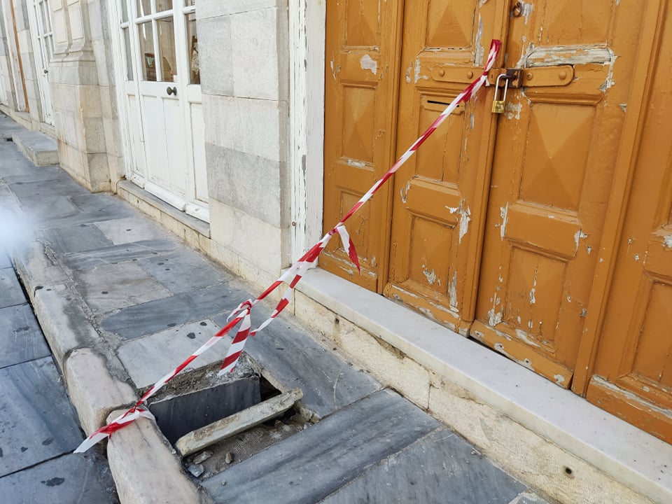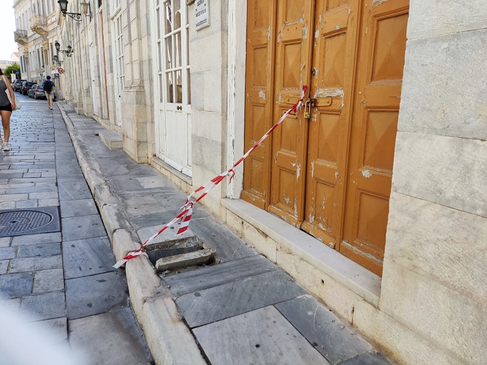 Αν και η Τεχνική Υπηρεσία προχώρησε στην τοποθέτηση απαγορευτικής κορδέλας ώστε να μην περπατούν οι πεζοί από το συγκεκριμένο σημείο και χθες προχώρησε στην τοποθέτηση νέας μαρμάρινης πλάκας, ωστόσο το πρόβλημα σε πολλούς δρόμους παραμένει και ο Δήμος θα πρέπει να εξετάσει τίνι τρόπω θα επέμβει σε ευρύτερα πλακόστρωτα τμήματα της Ερμούπολης.