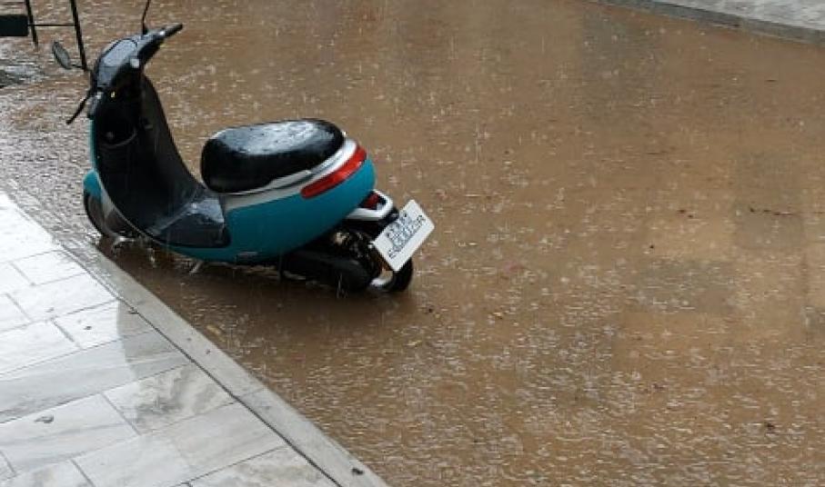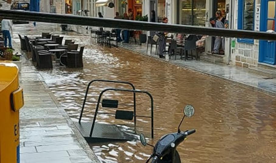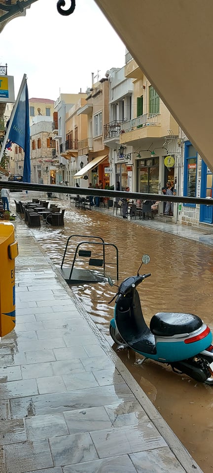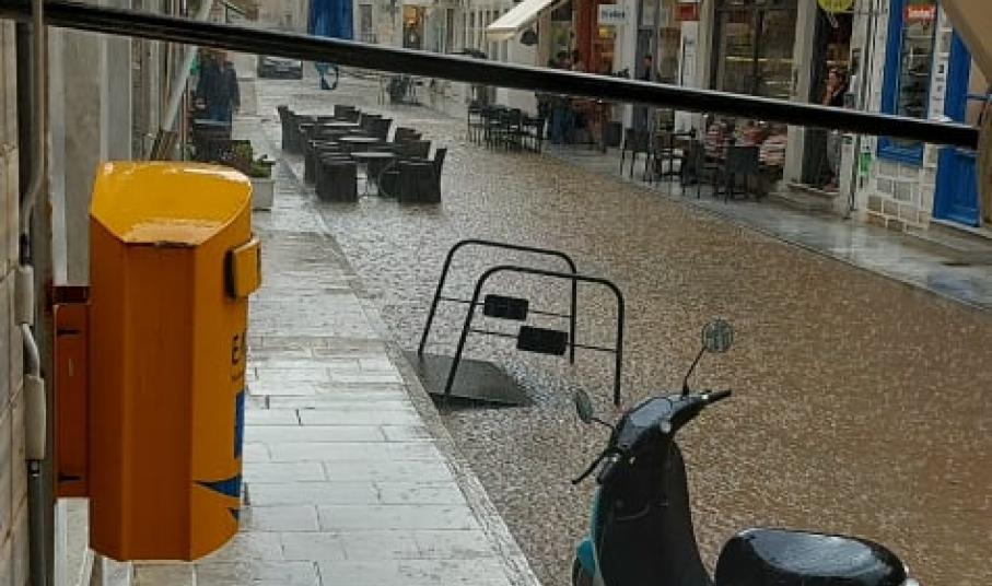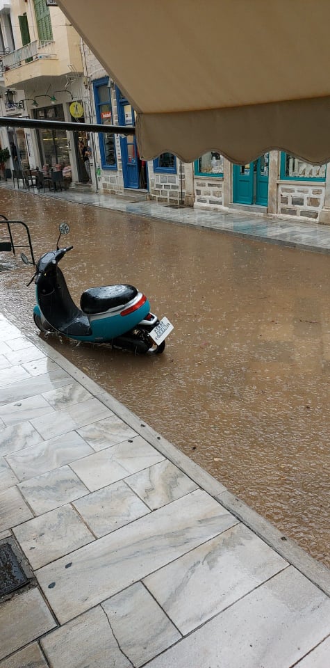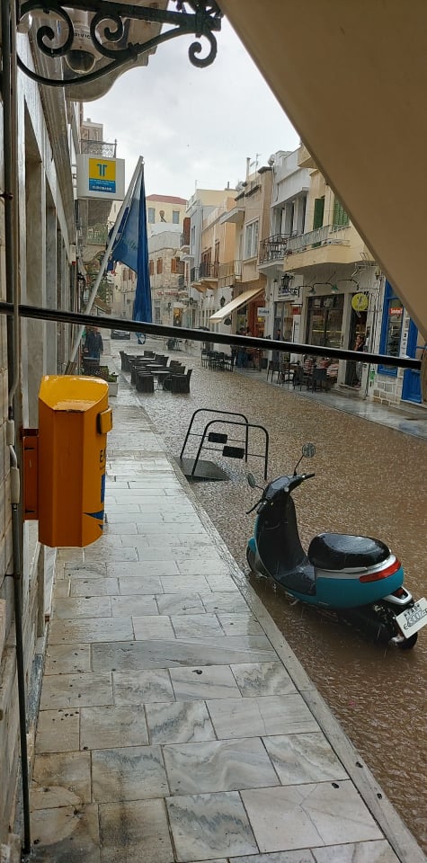Πλημμύρισε κυριολεκτικά ο πεζόδρομος της οδού Πρωτοπαπαδάκη στην Ερμούπολη πριν από λίγα λεπτά (10.30), καθώς ως φαίνεται "μπούκωσαν" τα φρεάτια απορροής των όμβριων υδάτων.