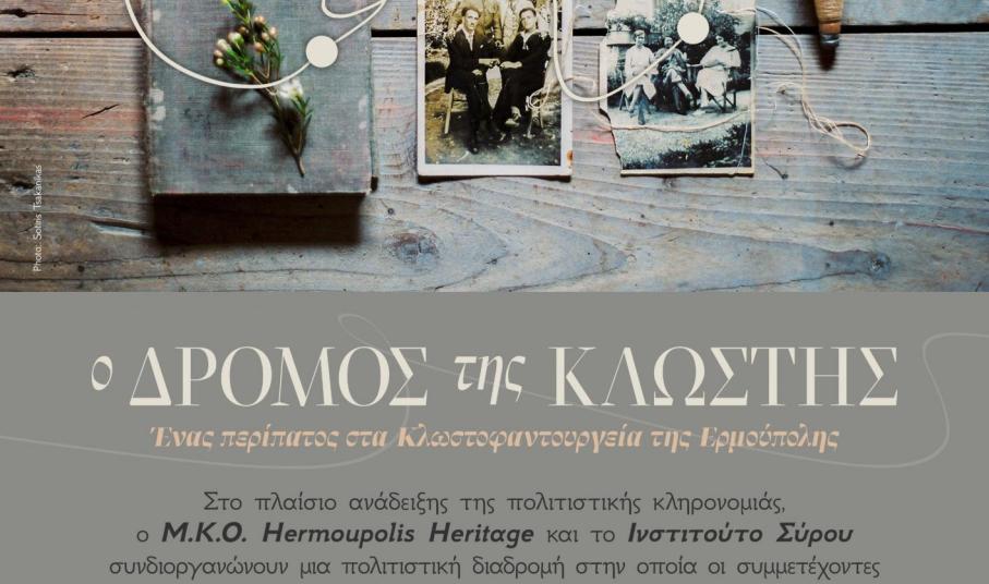 Στο πλαίσιο ανάδειξης της πολιτιστικής κληρονομιάς, ο Μ.Κ.Ο Hermoupolis Heritage και το Ινστιτούτο Σύρου συνδιοργανώνουν μια πολιτιστική διαδρομή στην οποία οι συμμετέχοντες καλούνται να ανακαλύψουν τη βιομηχανική κληρονομιά της Ερμούπολης μέσα από διαδραστικές αφηγήσεις και ξεναγήσεις στην ιστορία και στα κτήρια.