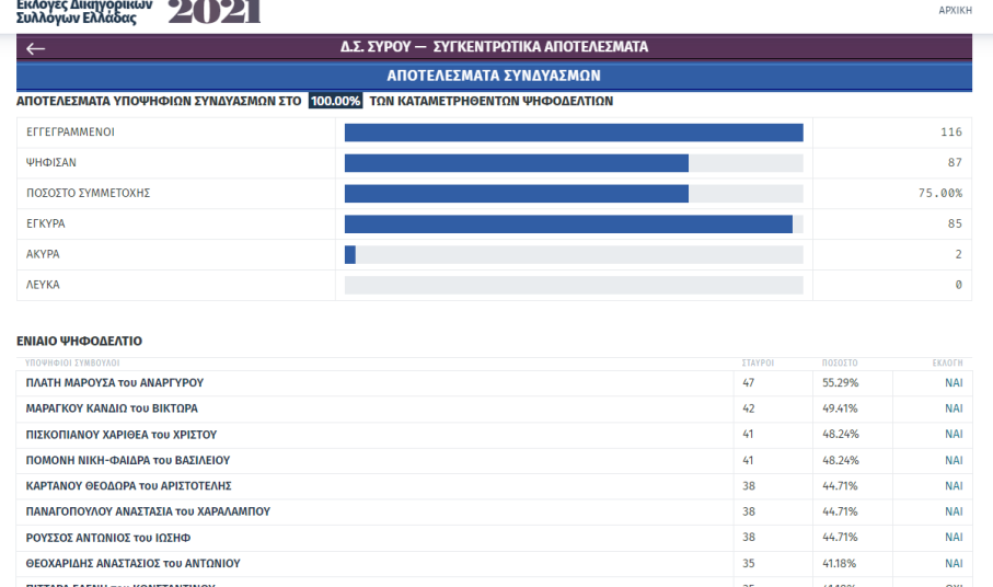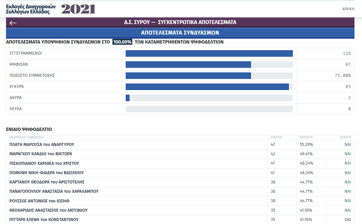Μετά την ολοκλήρωση της εκλογικής διαδικασίας για την ανάδειξη Προέδρου και νέου Διοικητικού Συμβουλίου του Δικηγορικού Συλλόγου Σύρου που διενεργήθηκε το διήμερο 27 και 28 Νοεμβρίου 2021, και της καταμέτρησης των ψήφων, σας γνωστοποιούμε τα αποτελέσματα, ως κάτωθι: