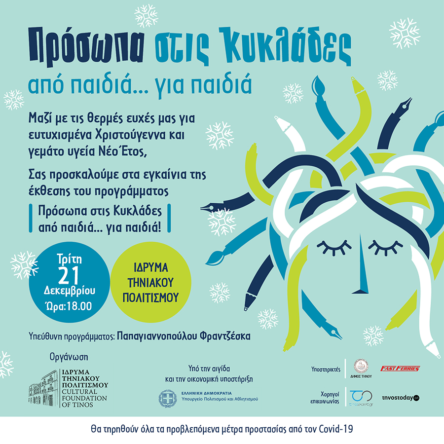 Με χαρά σας προσκαλούμε στα εγκαίνια της έκθεσης “Πρόσωπα στις Κυκλάδες” που φτιάχτηκε από παιδιά, για παιδιά! Τα εγκαίνια θα πραγματοποιηθούν Τρίτη, 20 Δεκεμβρίου 2021 στις 18.00 στο Ίδρυμα Τηνιακού Πολιτισμού.
