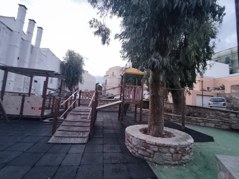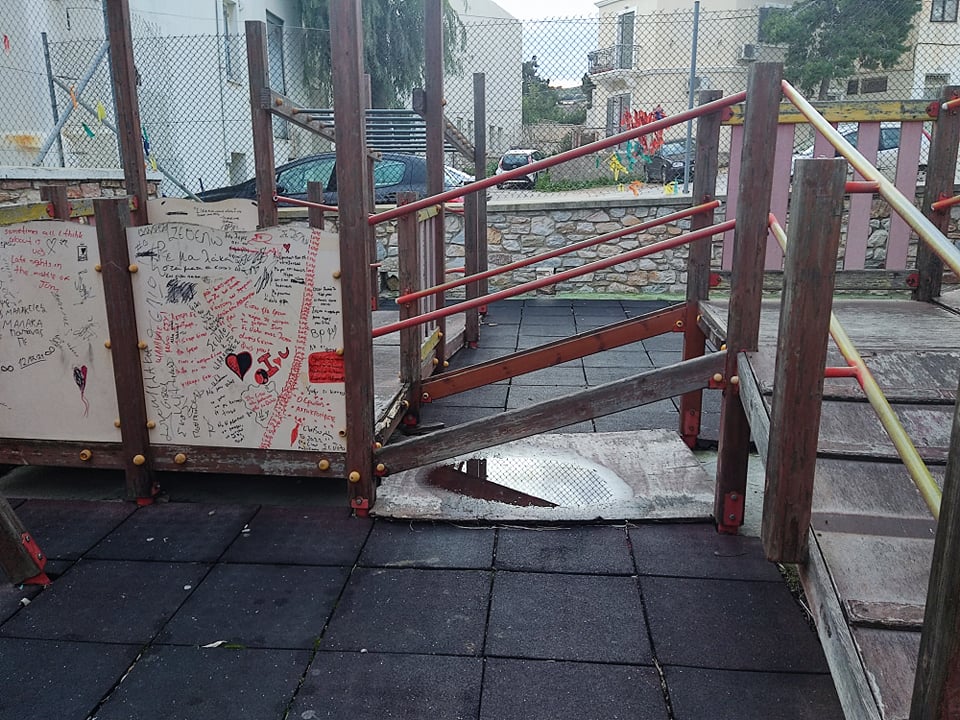 Ειδικότερα, δια γυμνού οφθαλμού διαπιστώνεται διάλυση μικρού τοιχίου στο οποίο μπορούν να χτυπήσουν παιδιά, καθώς επίσης καταστροφή ξύλινων τμημάτων παιχνιδιών, όπως όμως και συγκέντρωση νερού της βροχής σε ξύλινο δάπεδο εντός της παιδικής χαράς.