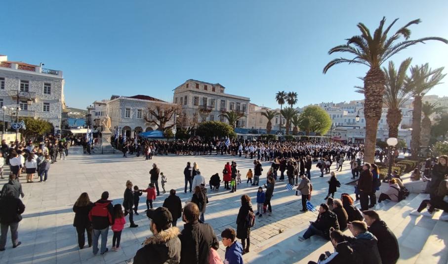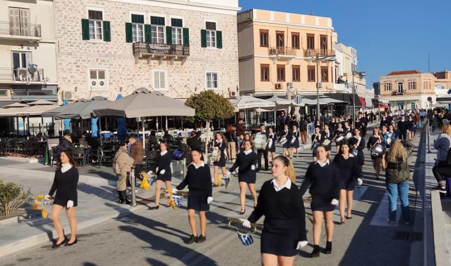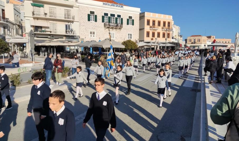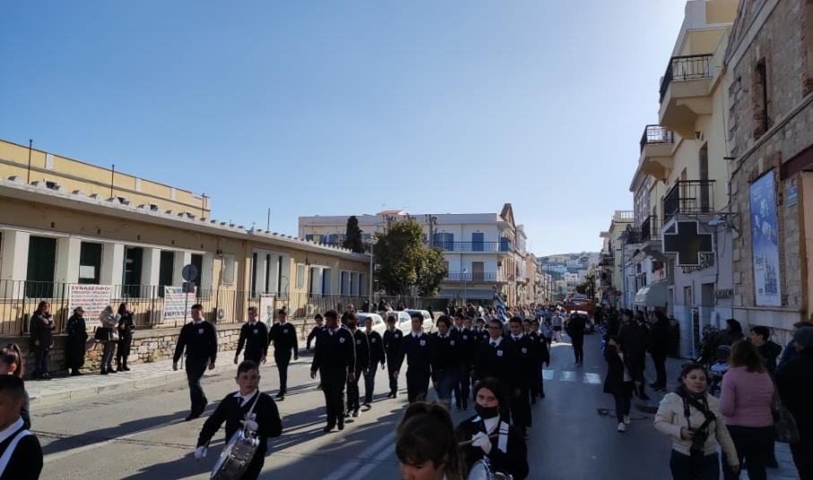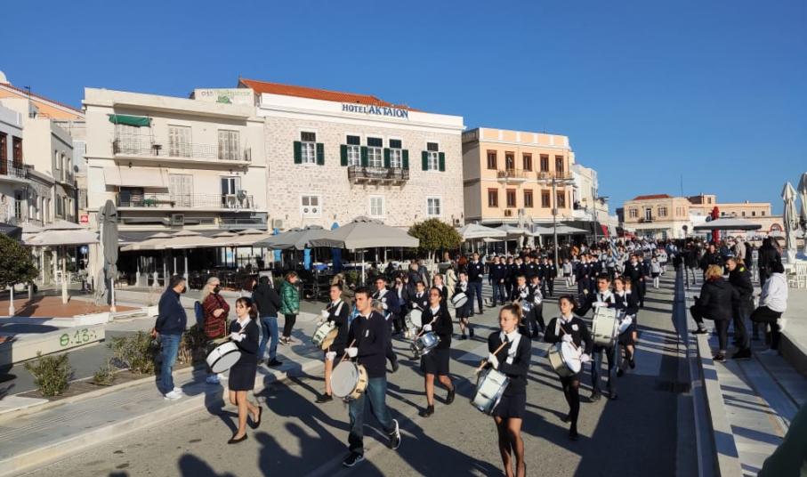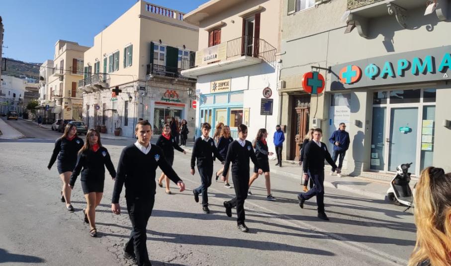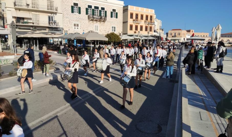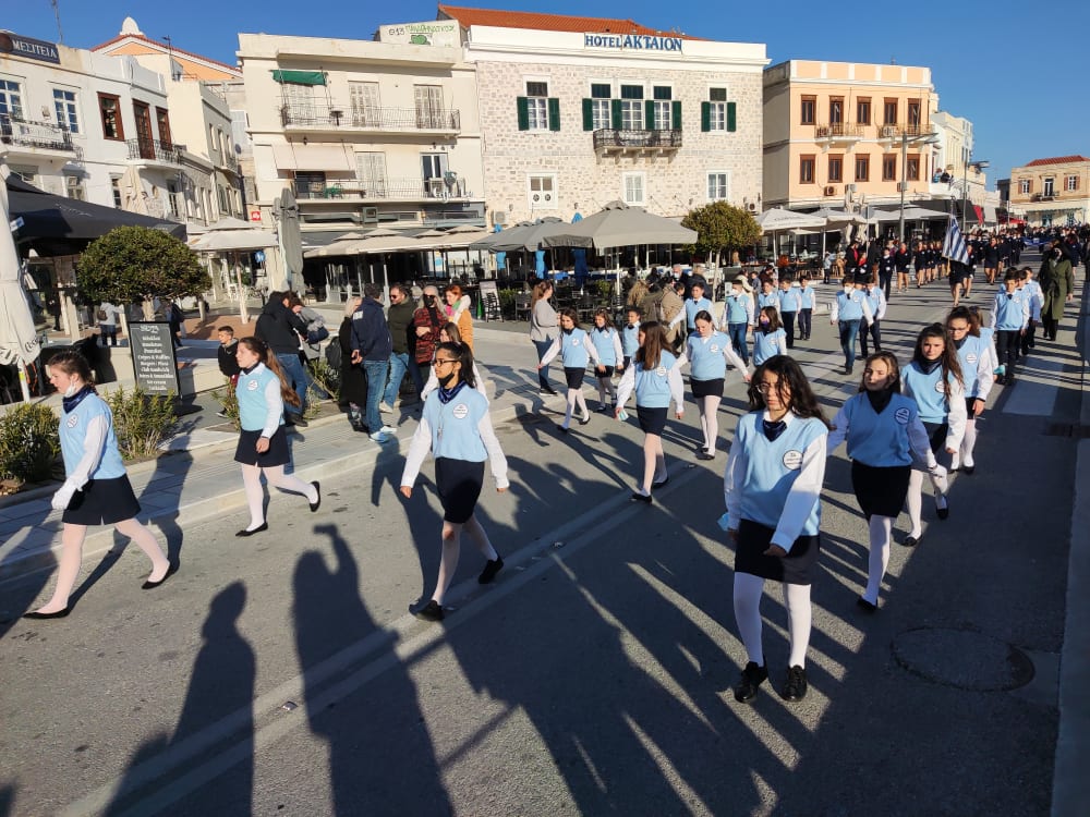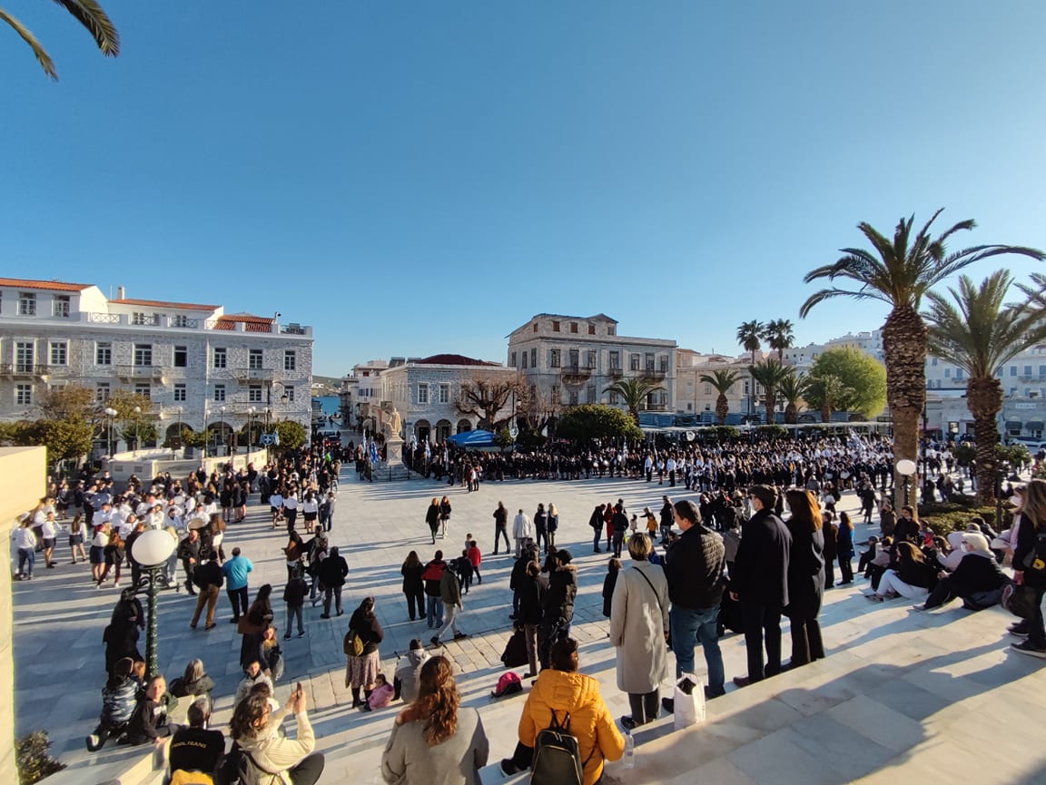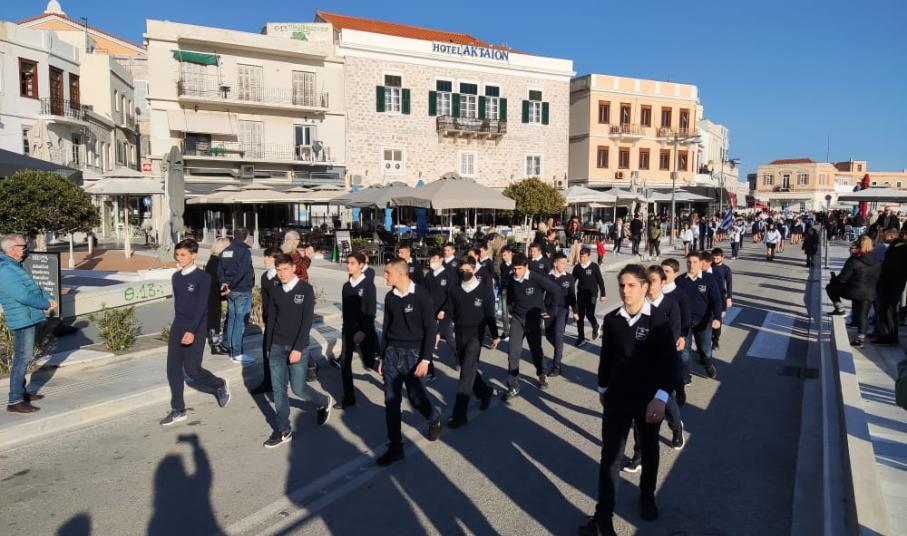 Μετά από δύο έτη πανδημίας, οι μαθητές πραγματοποιούν κανονικά τη στεφάνωση, τηρώντας τα μέτρα προστασίας ενάντια στον κορωνοϊό. Σύμφωνα με το πρόγραμμα της στεφάνωσης οι μαθητές ξεκίνησαν από την πλατεία Ηρώων και σταδιακά φθάνουν στο κέντρο της Ερμούπολης.