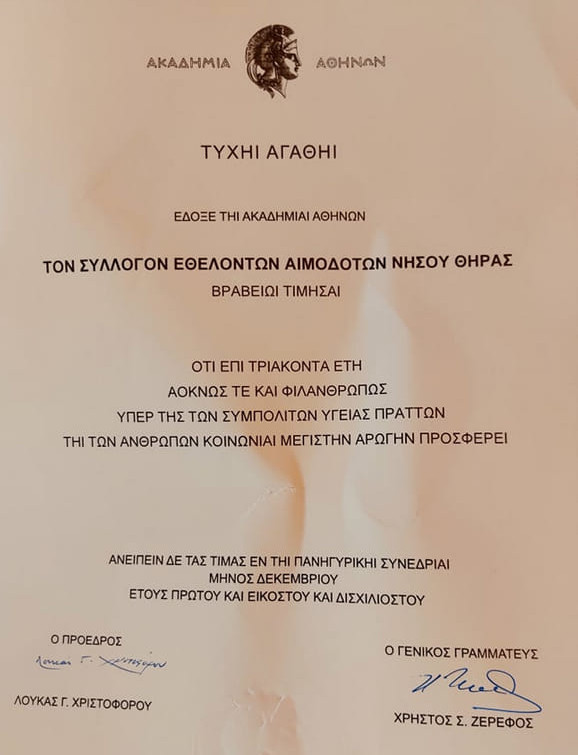Την Τετάρτη 23 Μαρτίου 2022, η Ακαδημία Αθηνών βράβευσε την Τράπεζα Αίματος Σαντορίνης για την 30χρονη προσφορά της.