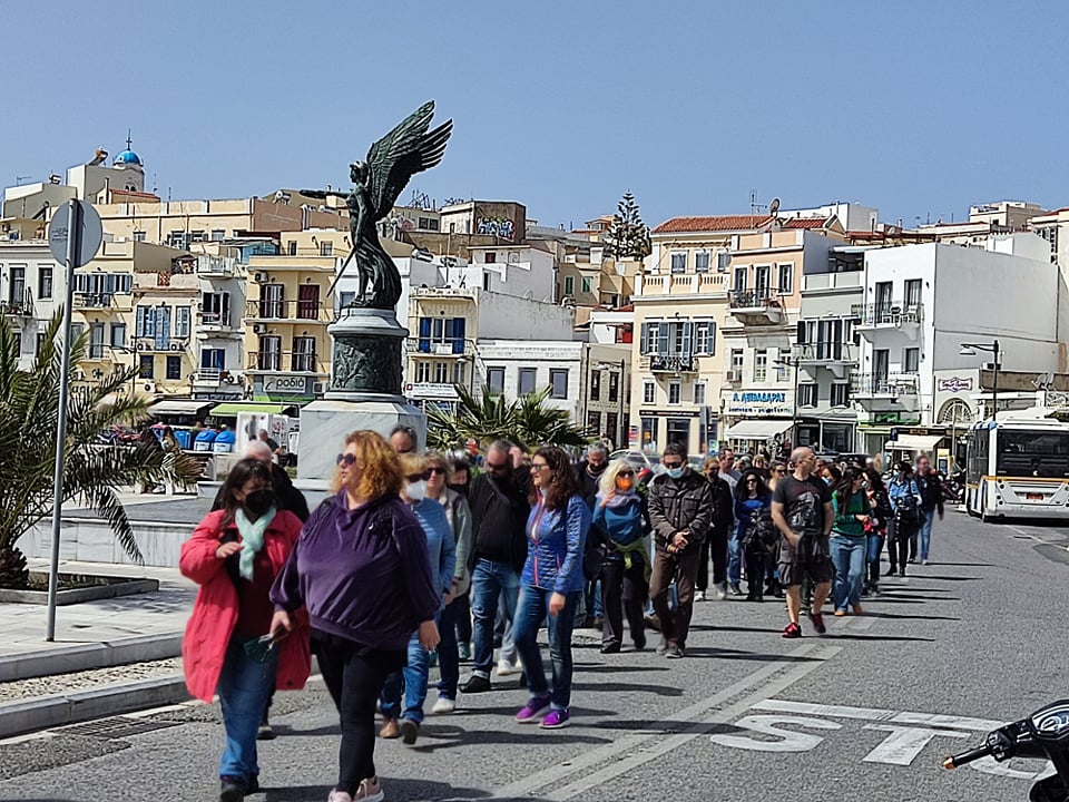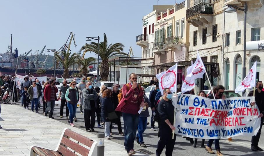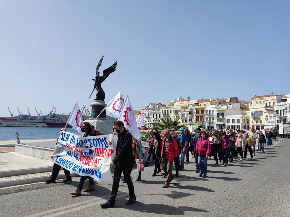 Με συνθήματα και αναφορές για τα θέματα της ακρίβειας, της φτώχειας, της ενεργειακής κρίσης, για τον πόλεμο στην Ουκρανία καθώς και για την προάσπιση της δημόσιας υγείας και παιδείας, οι συμμετέχοντες διαδήλωσαν στους κεντρικούς δρόμους της Ερμούπολης.