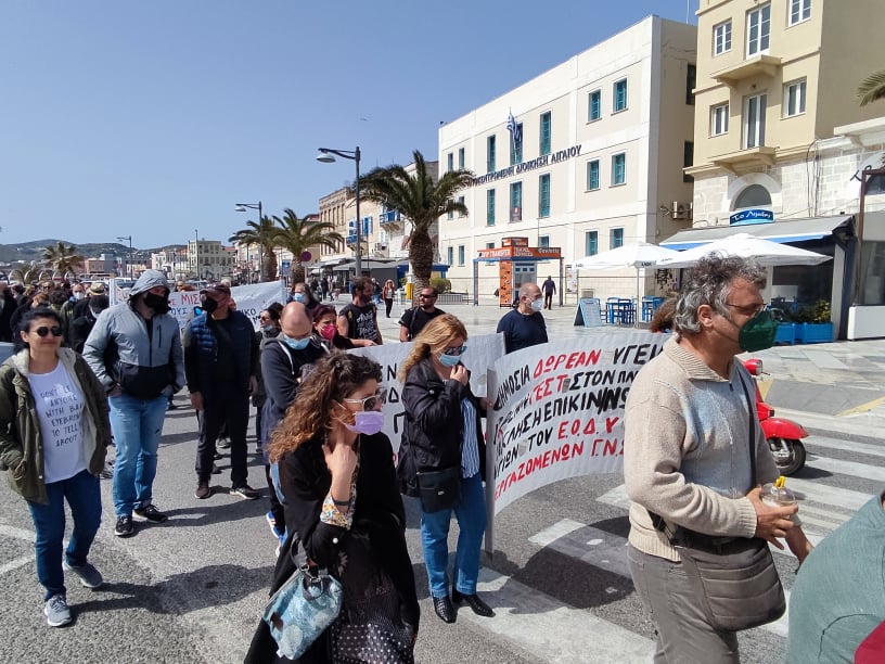 Η συγκέντρωση ξεκίνησε στις 10.30 το πρωί μπροστά από το κτίριο της Αποκεντρωμένης Διοίκησης Αιγαίου και οι εκπρόσωποι σωματείων μίλησαν αρχικά για τα αιτήματά τους.