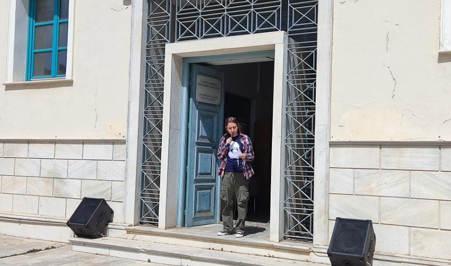 Ειδικότερα, στον χαιρετισμό της, εκπρόσωπος του Σωματείου Ιδιωτικών Υπαλλήλων Κυκλάδων κατήγγειλε αρχικά “το όργιο καταστολής ενάντια στους απεργούς λιμενεργάτες της COSCO”, διαβάζοντας το σχετικό ψήφισμα συμπαράστασης που εξέδωσε το Σωματείο.