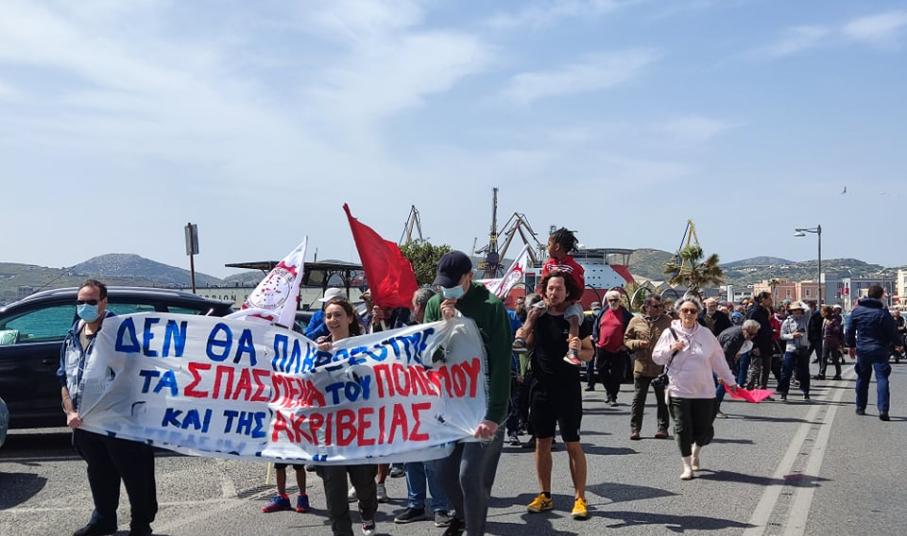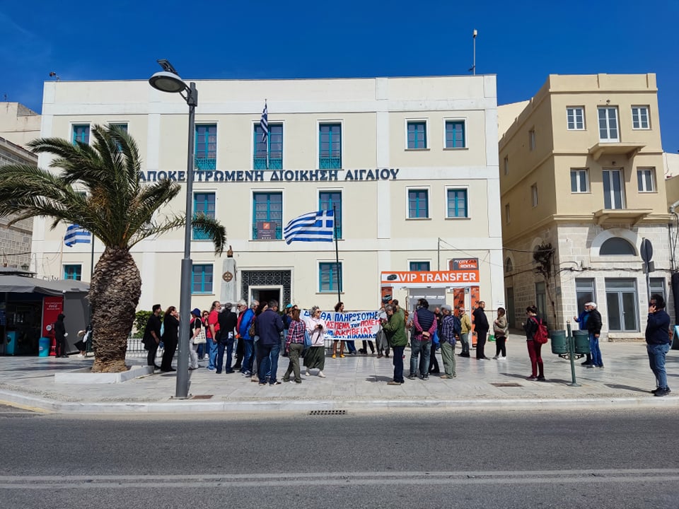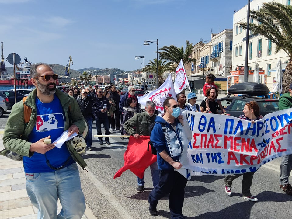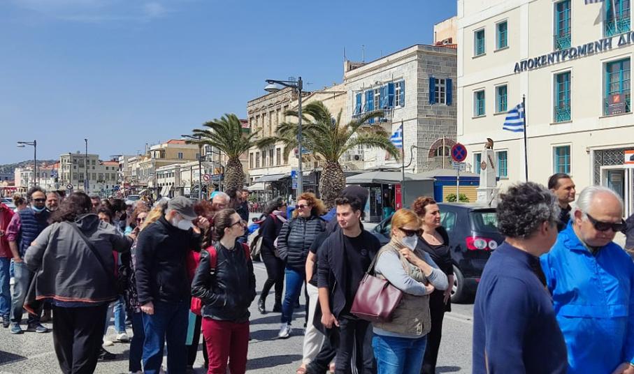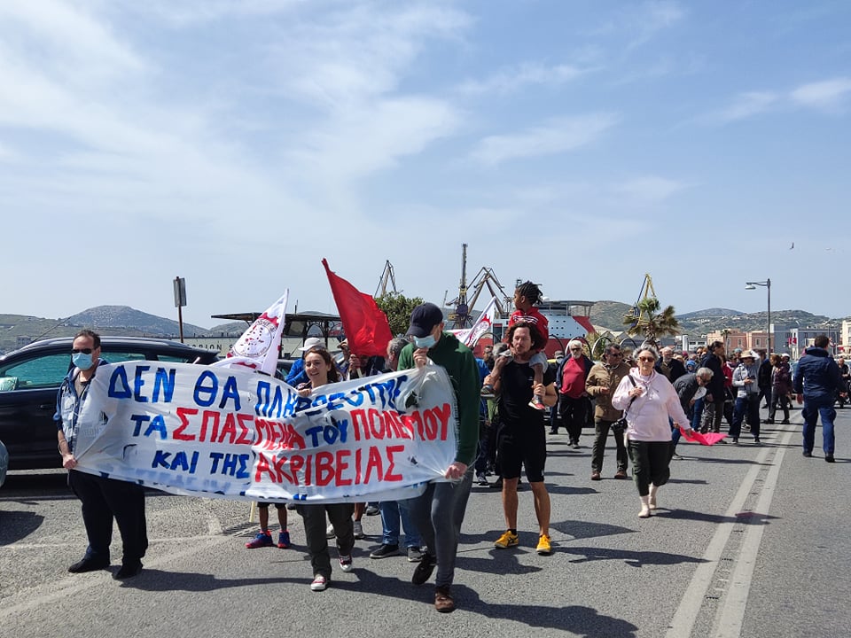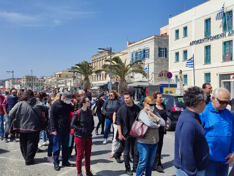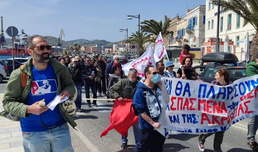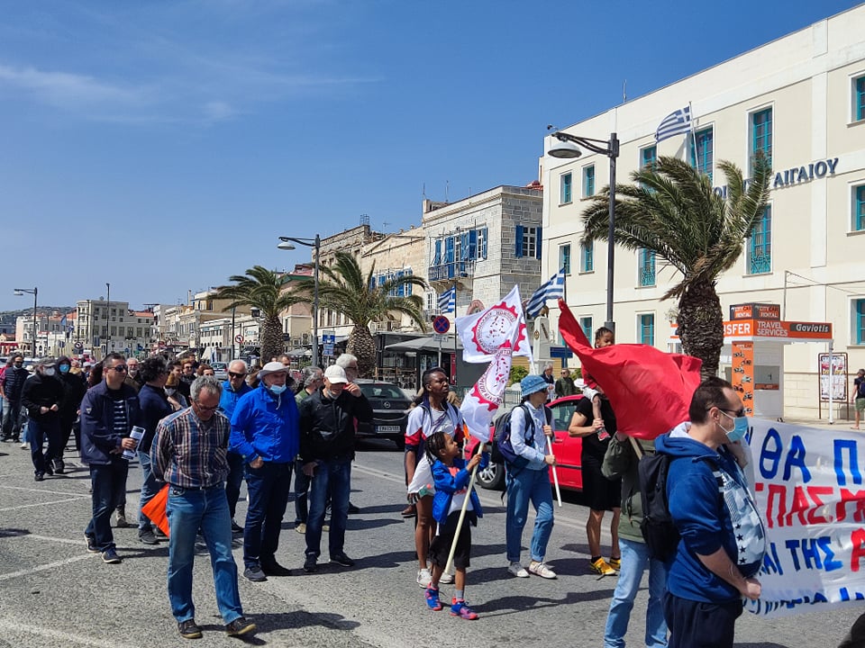 Εκπρόσωποι από τις τάξεις των εκπαιδευτικών, των υπαλλήλων της Αποκεντρωμένης Διοίκησης Αιγαίου, καθώς επίσης μέλη του Σωματείου Ιδιωτικών Υπαλλήλων ν. Κυκλάδων, αλλά και εργαζόμενοι από το νησί συγκεντρώθηκαν στο κτίριο της Αποκεντρωμένης στην Ερμούπολη Σύρου, ενώ ακολούθως πραγματοποίησαν πορεία στο κέντρο της Ερμούπολης, τιμώντας “αγωνιστικά την Εργατική Πρωτομαγιά” όπως χαρακτηριστικά ανέφεραν εκπρόσωποί τους, στους σχετικούς χαιρετισμούς.