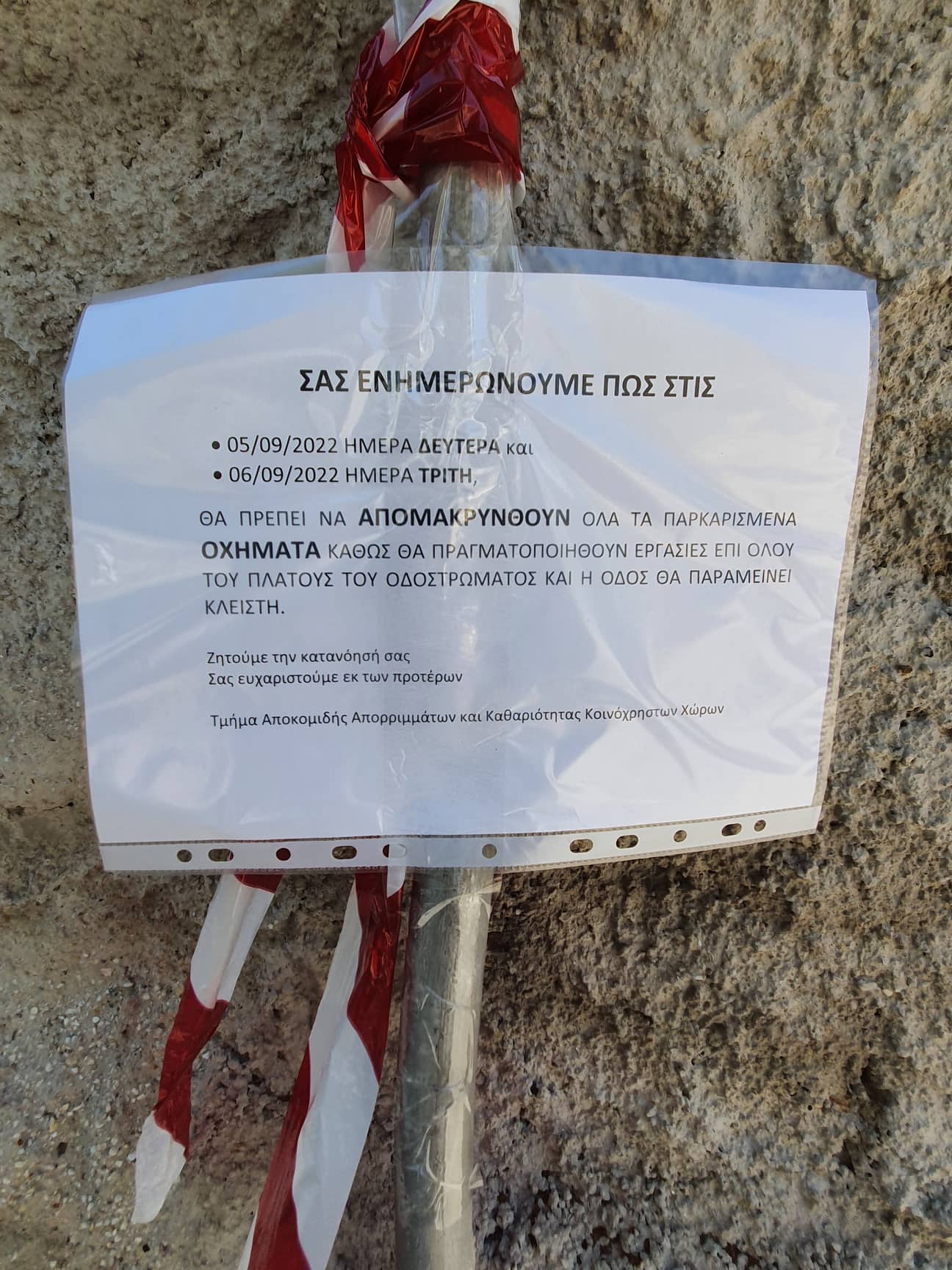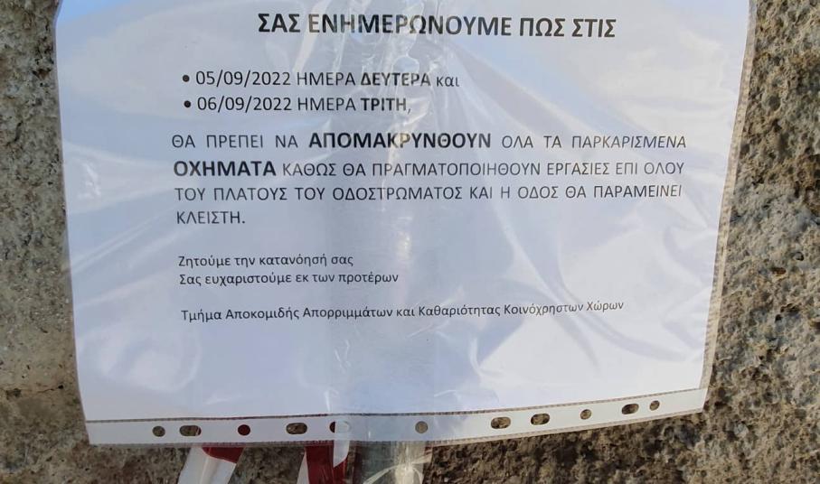 Για τον λόγο του ότι το δυτικό τμήμα της οδού Ασκληπιού θα παραμείνει κλειστό, θα πρέπει να απομακρυνθούν όλα τα σταθμευμένα οχήματα περιμετρικά της πλατείας Σπύρου Μουστακλή, ενώ η διέλευση των οχημάτων επί της οδού Ασκληπιού με κατεύθυνση τη οδό Ψαρών πιθανόν να καταστεί για μικρά διαστήματα δυσχερής”.