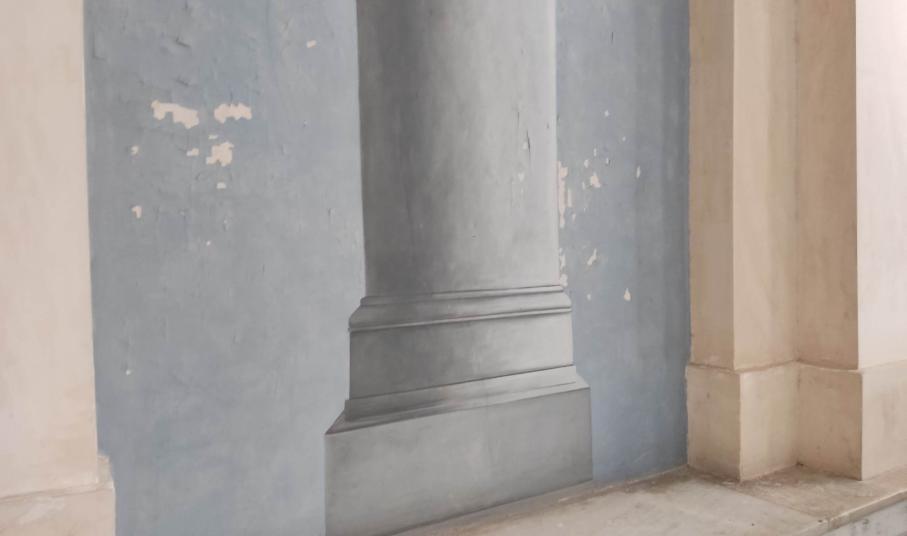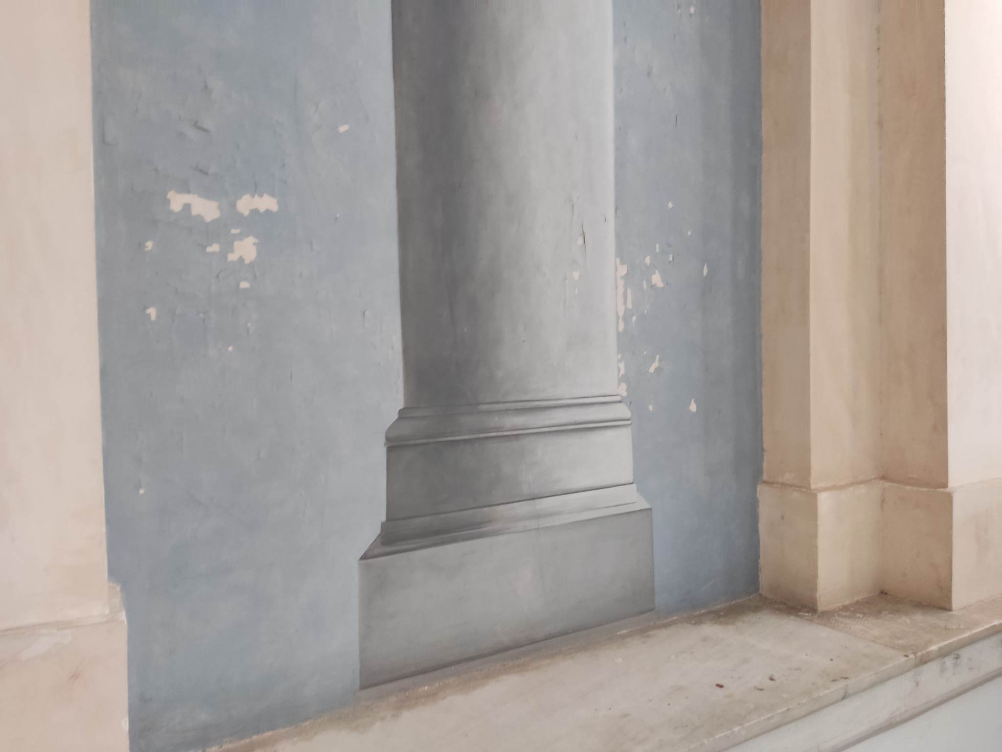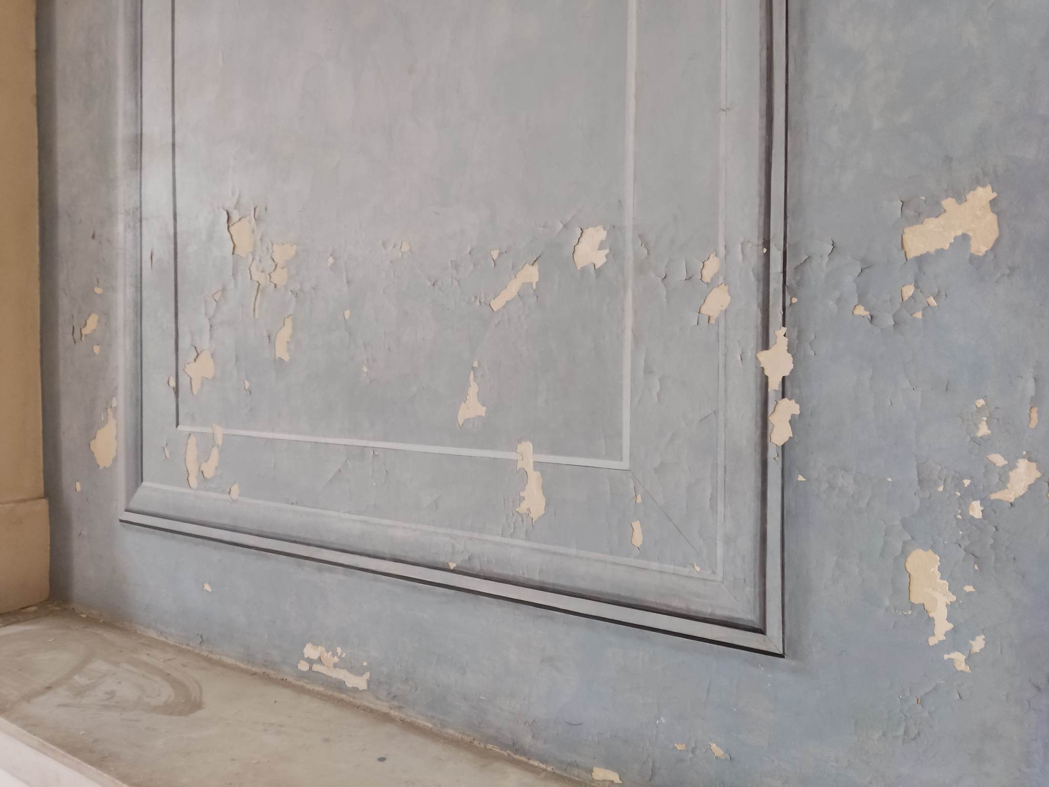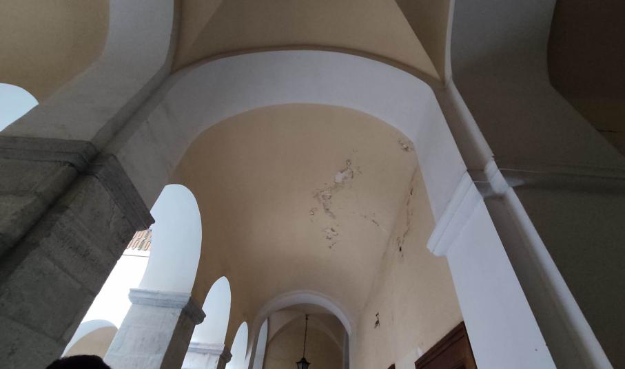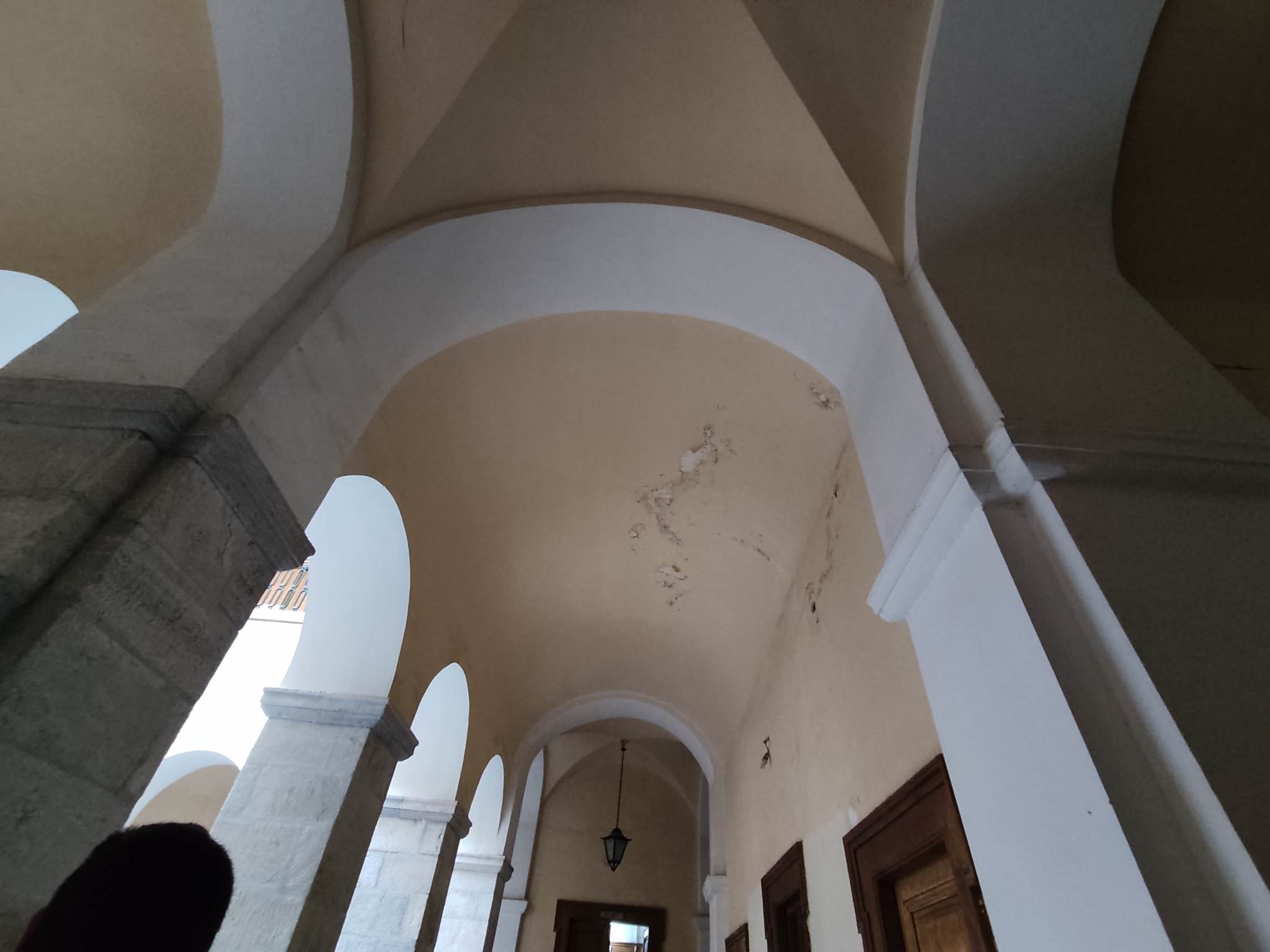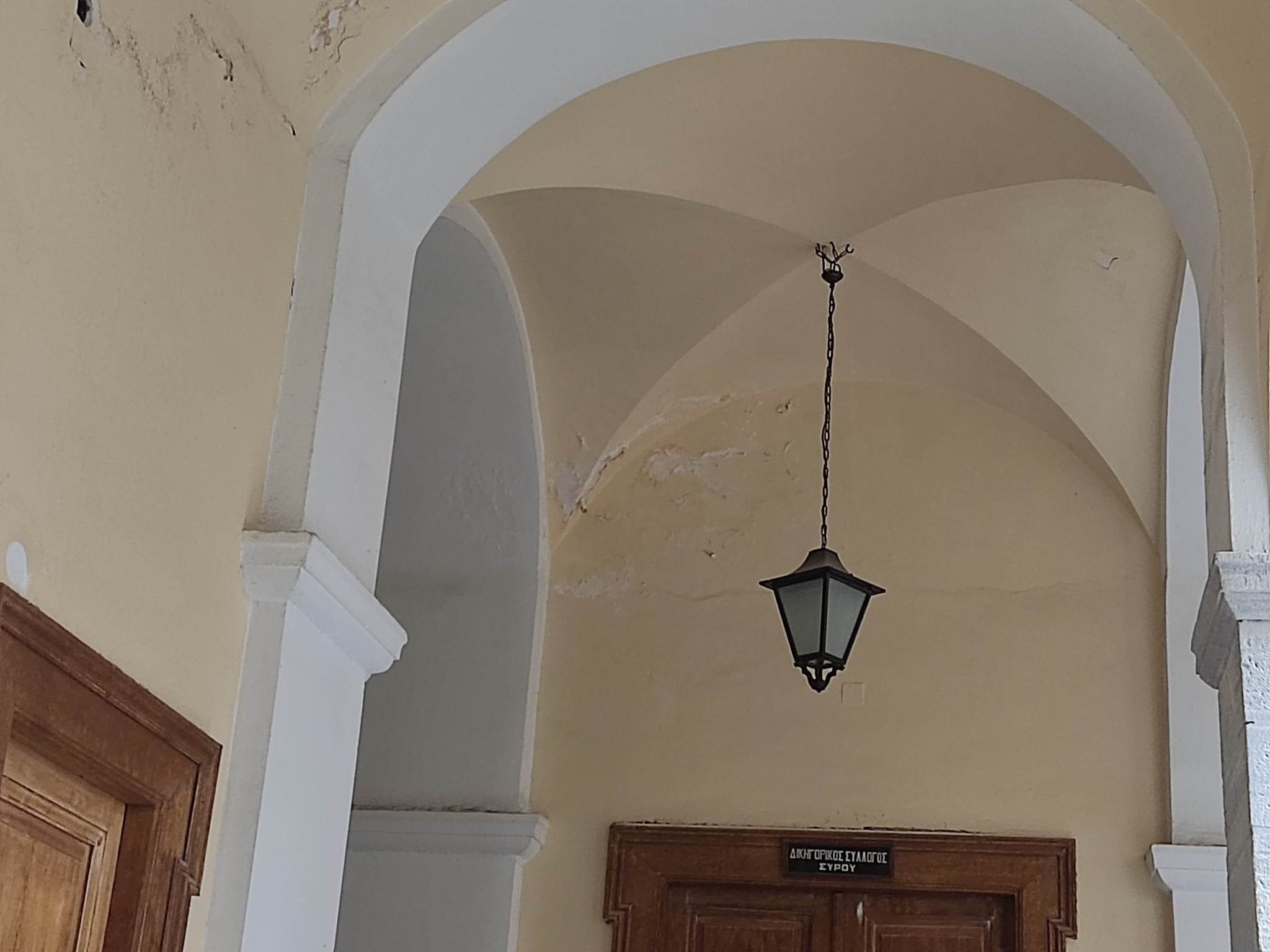 Εικόνα απουσίας συντηρήσεων στους εσωτερικούς χώρους παρουσιάζει το Δημαρχείο Σύρου – Ερμούπολης, καθώς στις επιφάνειες των τοίχων του παρουσιάζονται αποκολλήσεις σοβάδων και χρώματος.