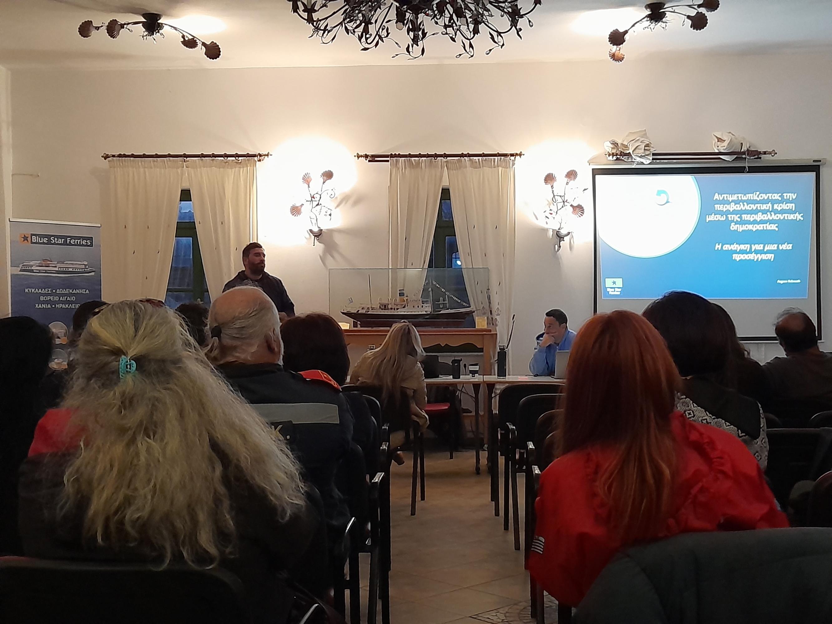 Η ημερίδα απευθυνόταν σε όλη την τοπική κοινωνία και περιελάμβανε ανοικτή πρόσκληση προς όσους επιθυμούσαν να συμμετάσχουν σε αυτήν. Κατά τη διάρκειά της παρουσιάστηκαν το γενικό πλαίσιο των περιβαλλοντικών προκλήσεων που αναδύονται, οι επιπτώσεις της θαλάσσιας ρύπανσης στην υγεία, την κοινωνία και την οικονομία, καθώς και το μοντέλο ζωής που οφείλουμε να υιοθετήσουμε στα πλαίσια της ατομικής ευθύνης μας απέναντι στο περιβάλλον. Επιπλέον, ανέδειξε την ανάγκη νέας προσέγγισης στο θέμα της προστασίας του περιβάλλοντος και εισήγαγε τον όρο Περιβαλλοντική Δημοκρατία, με αναφορά σε περισσότερο ενεργούς πολίτες και στη συμμετοχή των τοπικών κοινωνιών στη λήψη των αποφάσεων που αφορούν το περιβάλλον. Στο τέλος της ημερίδας πραγματοποιήθηκε ανοικτή συζήτηση με τους κατοίκους του νησιού για συγκεκριμένα περιβαλλοντικά θέματα που αφορούν την Αμοργό και προτάθηκαν στοχευμένες δράσεις για την αντιμετώπισή τους. Συνολικά 38 κάτοικοι της Αμοργού εκδήλωσαν το ενδιαφέρον τους και τίμησαν με την παρουσία τους την ημερίδα, μεταξύ των οποίων και ο Δήμαρχος Αμοργού, κ. Ε. Καραΐσκος.