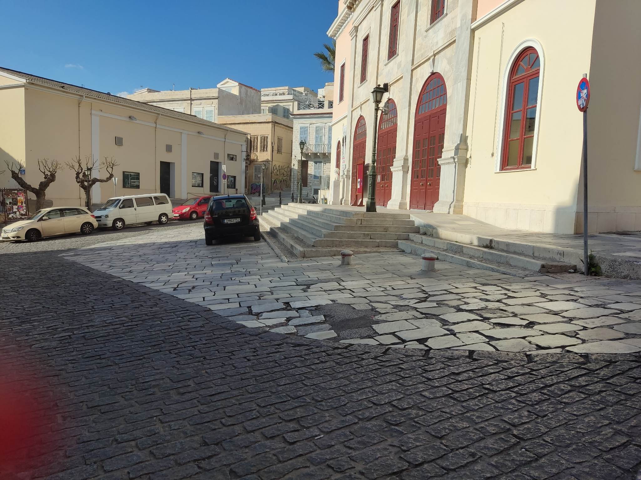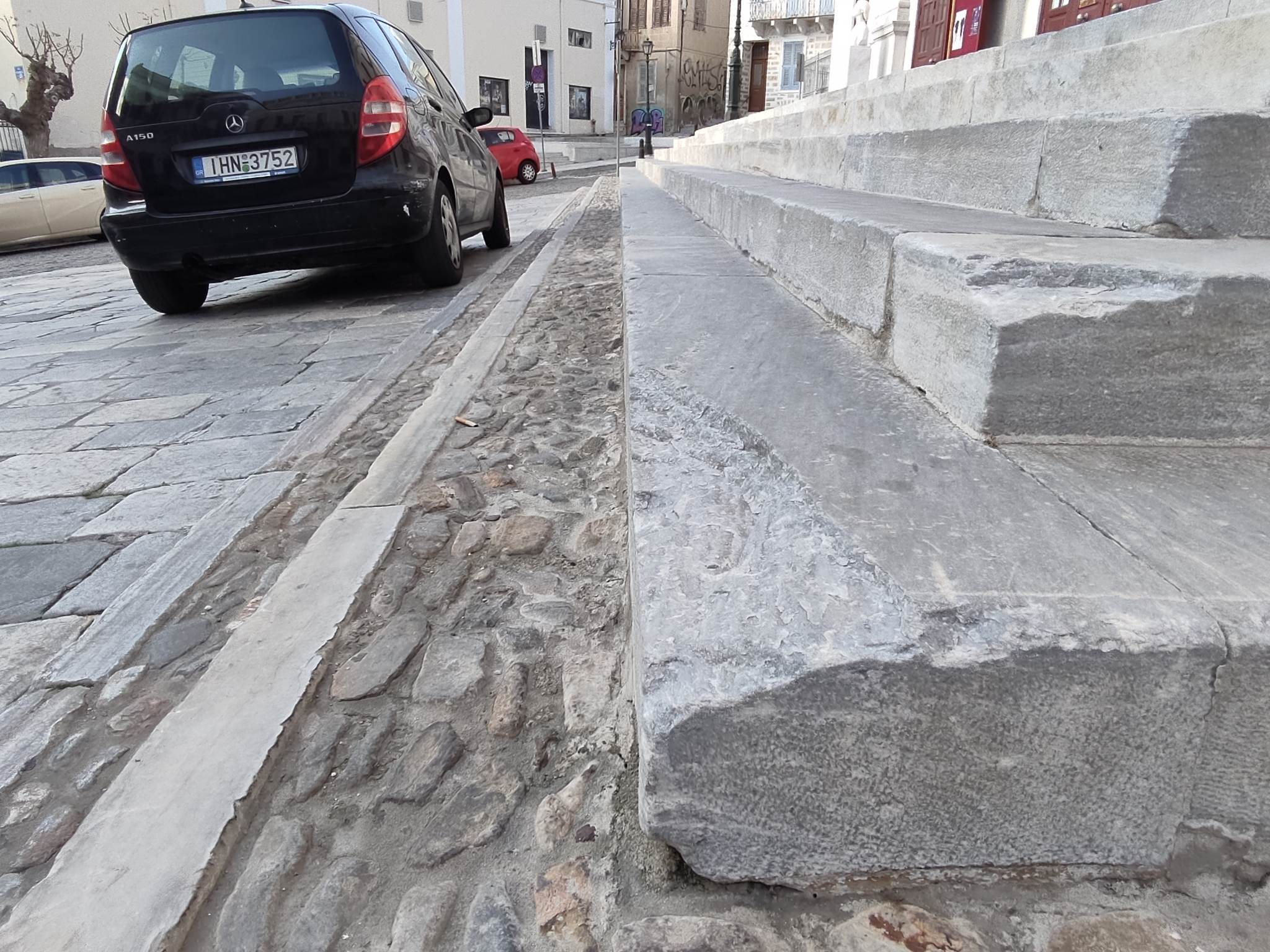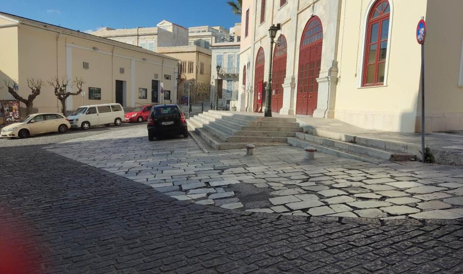 Συνεχής φθορά παρουσιάζει το πλακόστρωτο τμήμα καθώς και τα μικρά σκαλοπάτια στην είσοδο του θεάτρου “Απόλλων”, με ό,τι αυτό συνεπάγεται για την πρόκληση ατυχημάτων σε πεζούς και οδηγούς μηχανών.