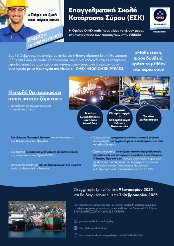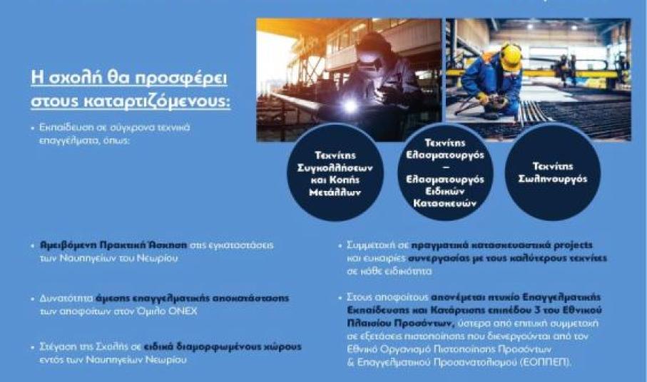Η Επαγγελματική Σχολή Κατάρτισης, που ανοίγει τις πύλες της στις 16 Φεβρουαρίου, είναι μία πρωτοβουλία της ONEX NEORION SHIPYARDS και αποτελεί μια σημαντική ευκαιρία για νέους και νέες που θέλουν να εκπαιδευτούν σε τεχνικά επαγγέλματα και να ενισχύσουν την εργασιακή τους εμπειρία πλάι στους καλύτερους τεχνίτες της κάθε ειδικότητας.
