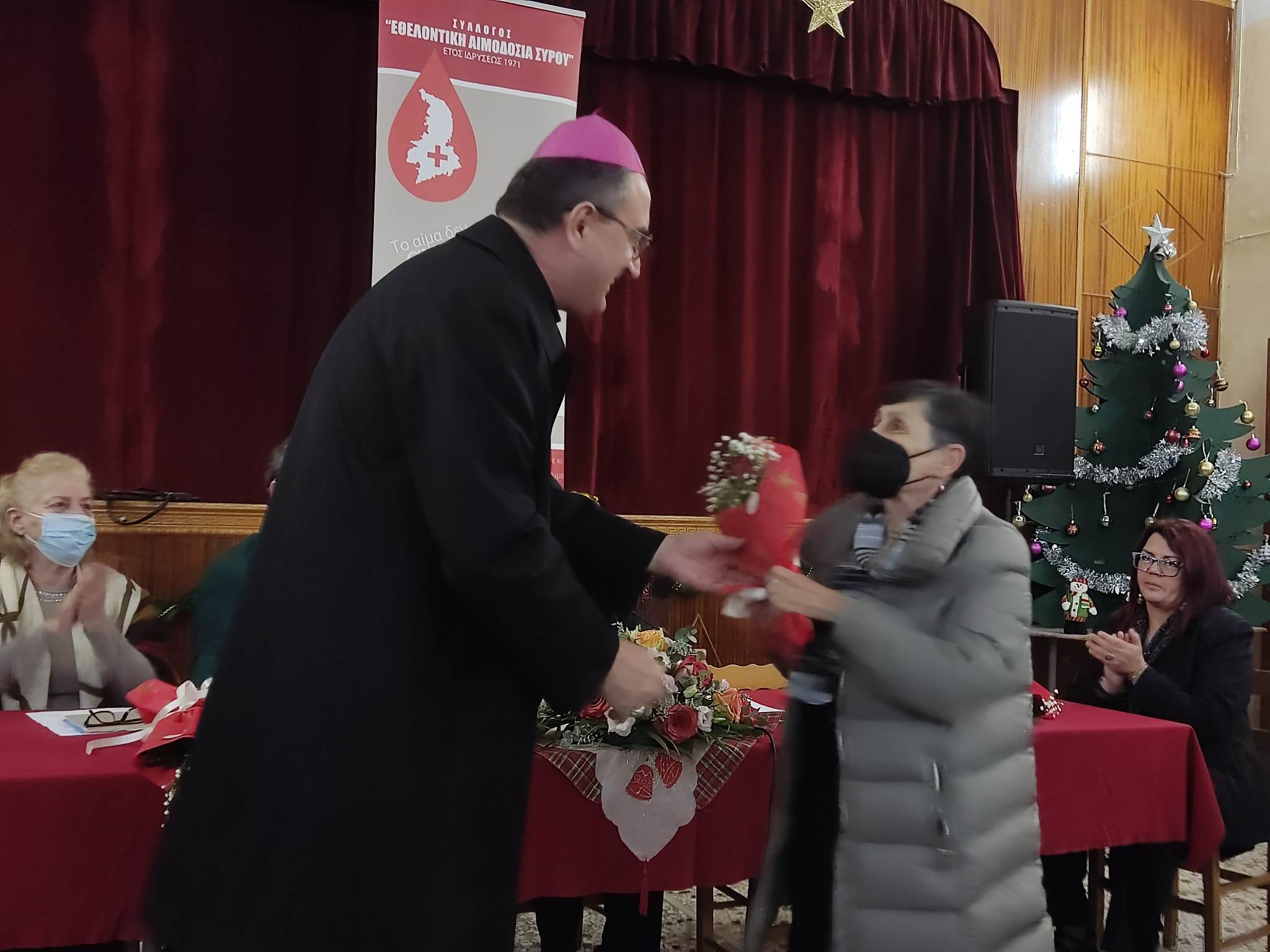 Ένα ιδιαίτερο αφιέρωμα στην πορεία της Εθελοντικής Αιμοδοσίας Σύρου πραγματοποιήθηκε σήμερα το απόγευμα στο πλαίσιο της εκδήλωσης για την κοπή πίτας των μελών της, κατά τη διάρκεια της οποίας τιμήθηκε και ο καθολικός ιερέας και πρωτεργάτης της όλης προσπάθειας, Αντώνιος Βουτσίνος.
