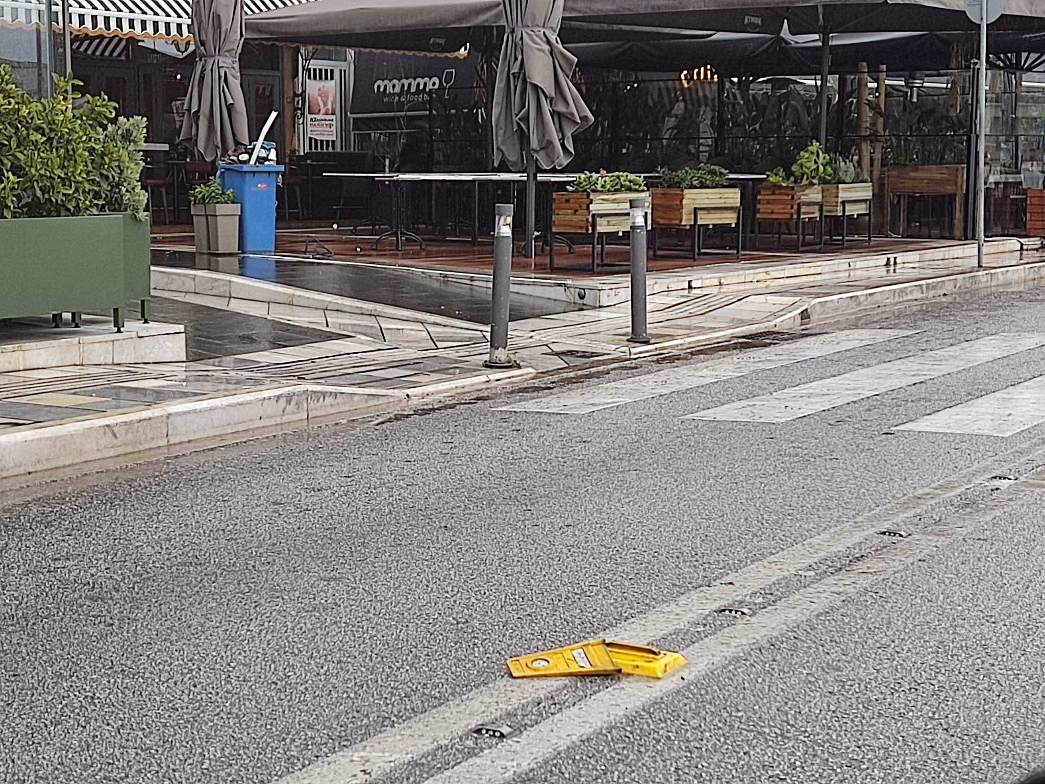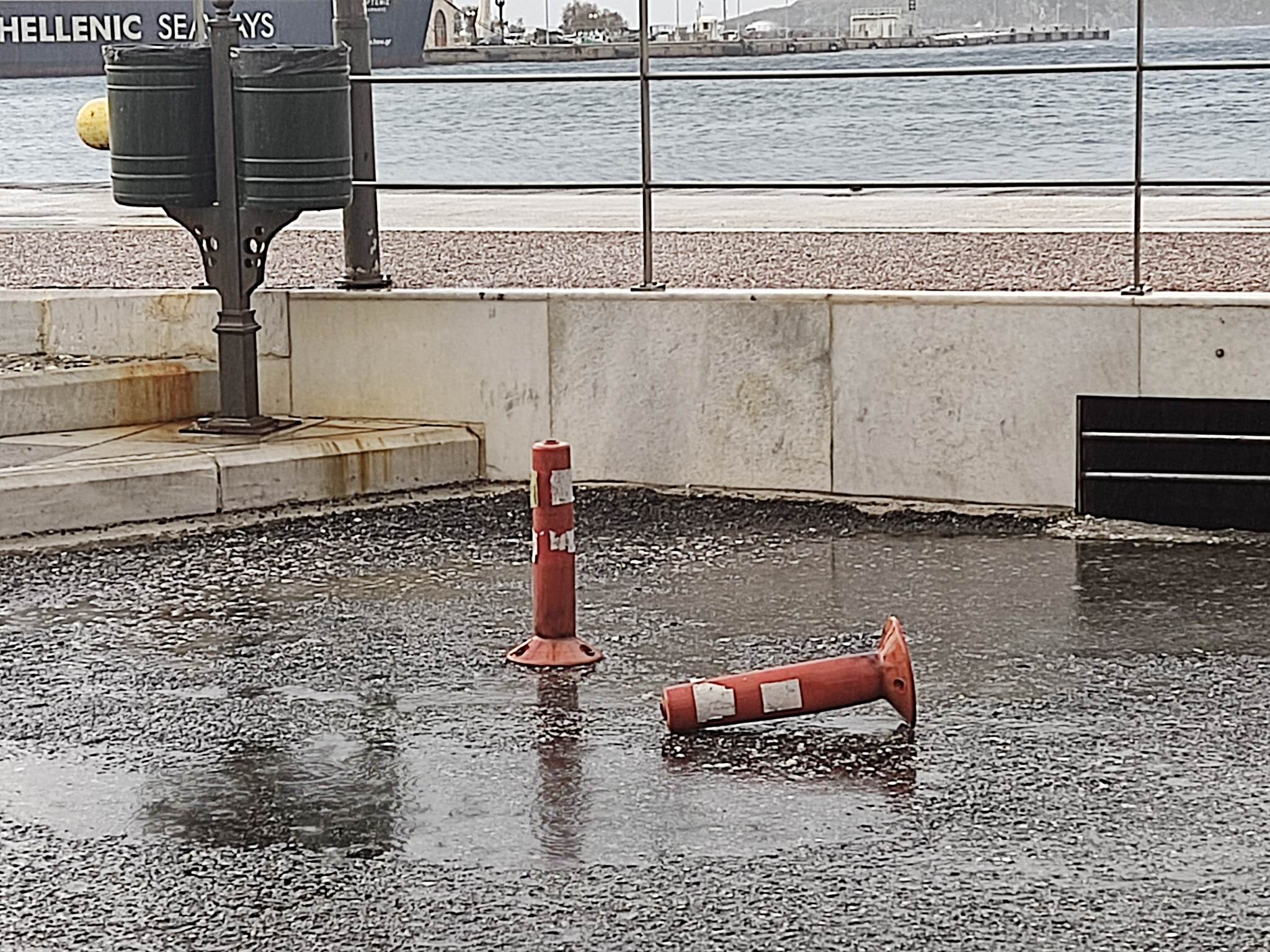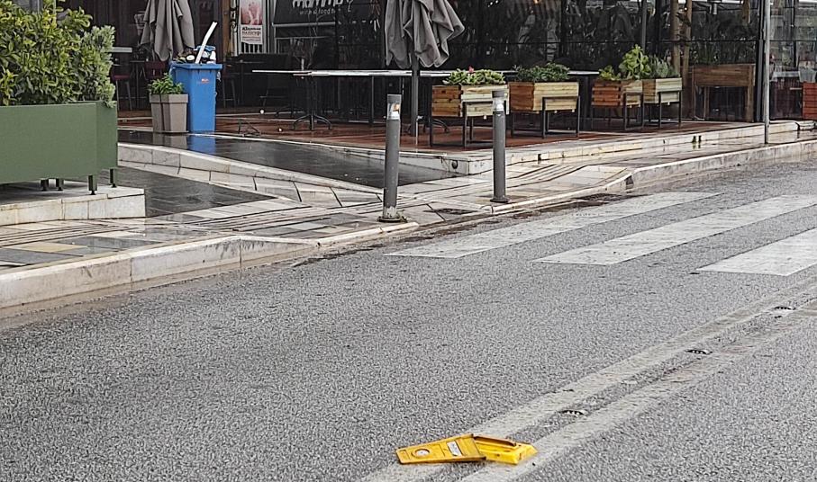 Σπασμένα κολωνάκια, “τσακισμένα” μέρη τους, καθώς επίσης πλήρως κατεστραμμένα, σκουριασμένα ή και απόλυτα αποχρωματισμένα όσον αφορά τις ανακλαστικές ταινίες στις επιφάνειές τους συνθέτουν ένα κακής ποιότητας “παζλ”, που “πνίγει” τους μικρούς δρόμους της Ερμούπολης.