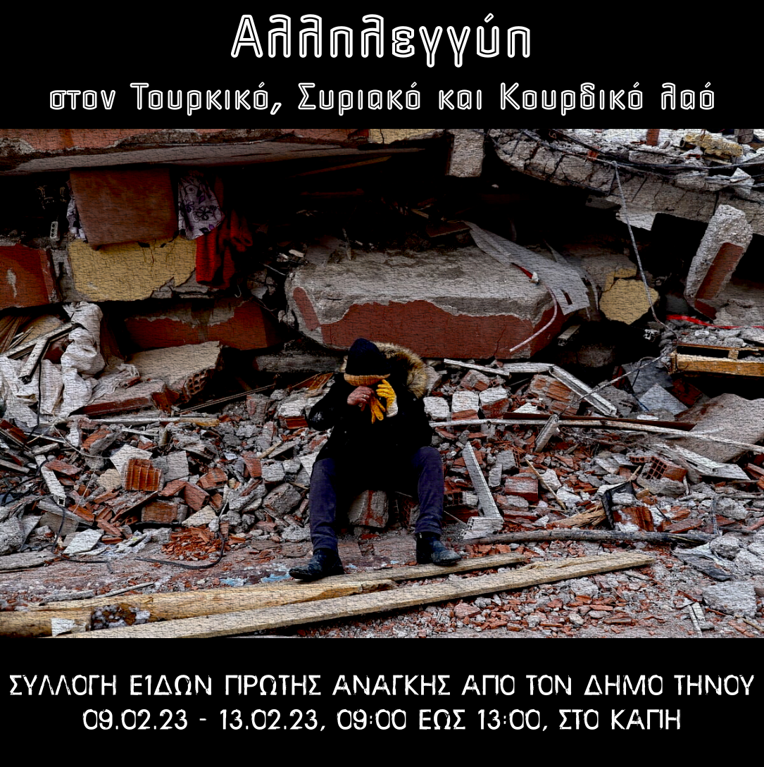 Καλεί τον κόσμο της Τήνου να ευαισθητοποιηθεί απέναντι στην τραγωδία των γειτονικών λαών και να βοηθήσει όπως το έχει κάνει πολλές φορές στο παρελθόν, συγκεντρώνοντας τα παρακάτω είδη (καινούρια ή σε πολύ καλή κατάσταση) από σήμερα Πέμπτη 09 έως και την Δευτέρα 13 Φεβρουαρίου, 09.00 – 13.00, στο ΚΑΠΗ του Δήμου Τήνου