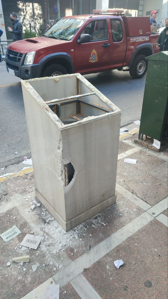 Άγνωστοι κατέστρεψαν την μαρμάρινη πλακέτα η οποία είναι αφιερωμένη στα θύματα της τραγωδίας της Marfin στην οδό Σταδίου, στο περιθώριο της μαζικής διαδήλωσης στο κέντρο της Αθήνας για την σιδηροδρομική τραγωδία στα Τέμπη.