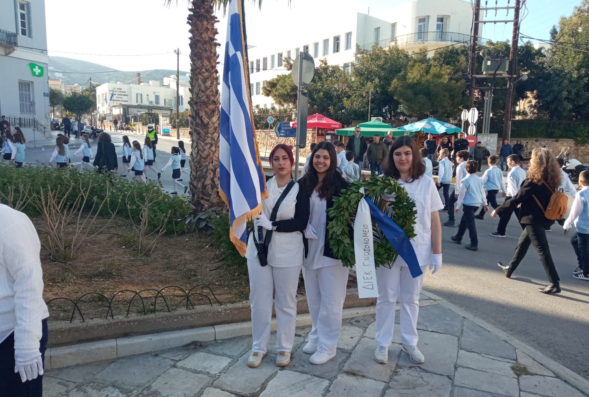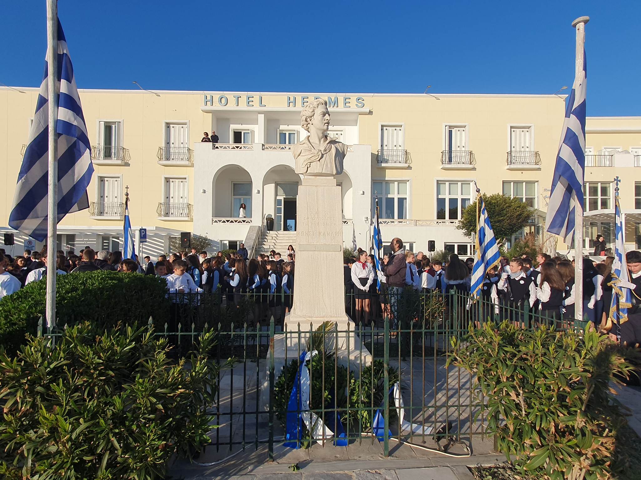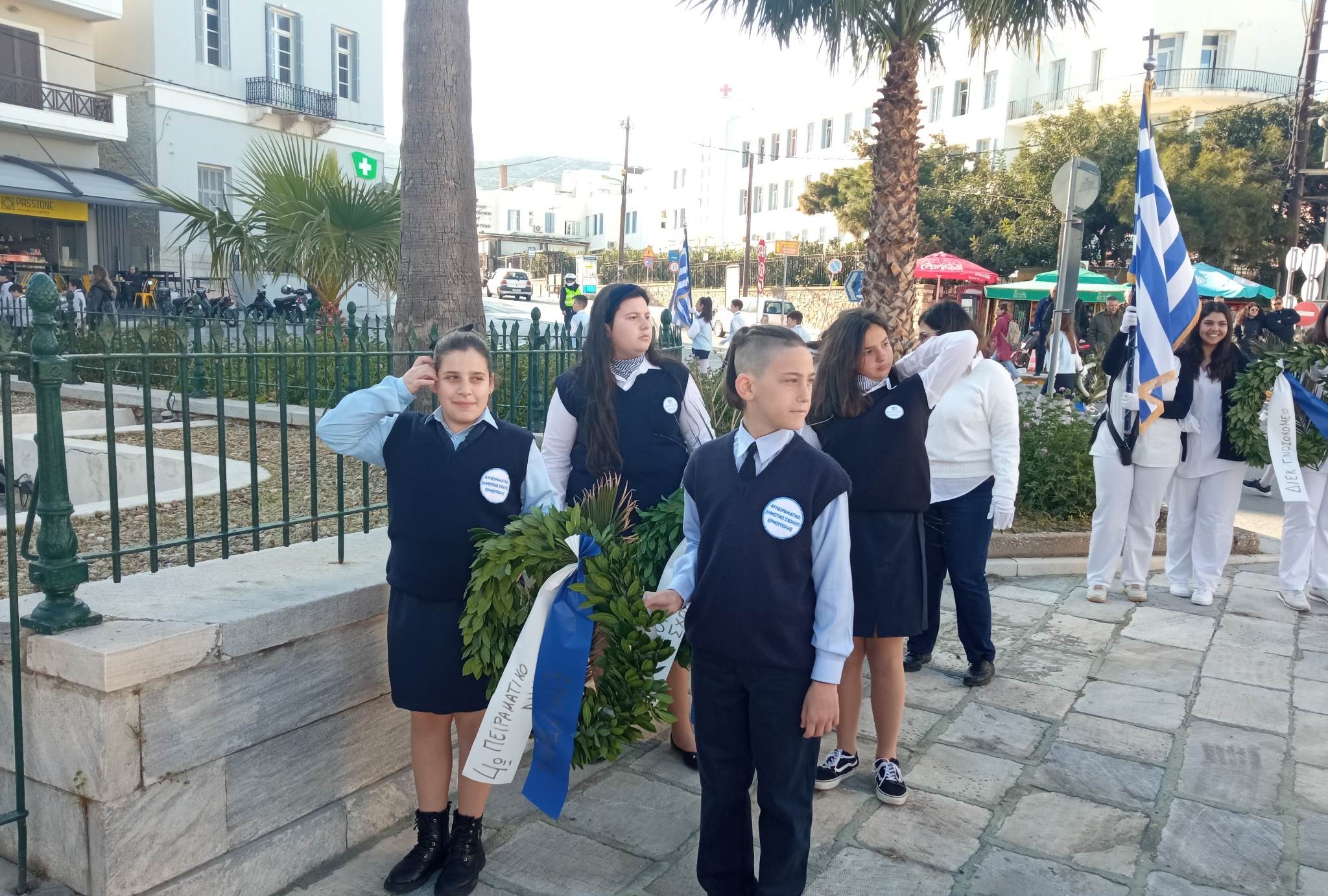 Νέοι και νέες καταθέτουν στεφάνια στα μνημεία της Ερμούπολης, αποδίδοντας τιμή στον αγώνα των προγόνων μας για ανεξαρτησία και ελευθερία.