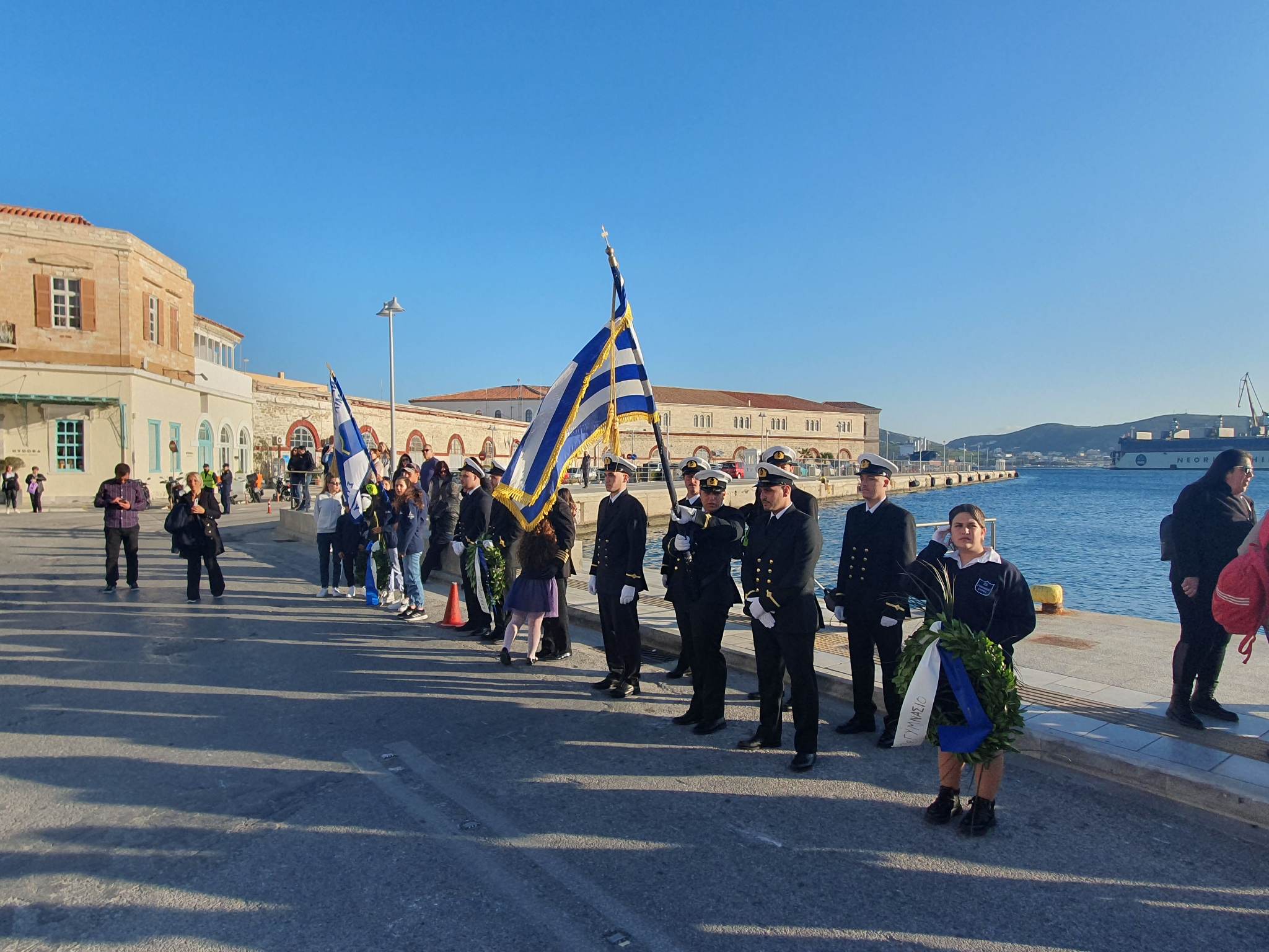 Αμέσως μετά έγινε κατάθεση στεφάνων στο ηρώο των πεσόντων από τον Χωρικό Αντιπεριφερειάρχη Κυκλάδων, μαθητές του ΕΠΑΛ Σύρου, του 4ου Πειραματικού Δημοτικού Σχολείου Ερμούπολης, του 5ου Δημοτικού Σχολείου Ερμούπολης, του ΕΝΕ.Ε.ΓΥ - Λ Σύρου, του Εσπερινού ΕΠΑΛ Σύρου και τους σπουδαστές και τις σπουδάστριες του Δημόσιου Ινστιτούτου Επαγγελματικής Κατάρτισης (ΔΙΕΚ) του Γενικού Νοσοκομείου Σύρου. Στο μνημείο πεσόντων Ιερολοχιτών από μαθητές του 2ου Δημοτικού Σχολείου Ερμούπολης και του 1ου Πειραματικού Γυμνασίου Σύρου, στο μνημείο της Εθνικής Αντίστασης από μαθητές του 3ου Δημοτικού Σχολείου Ερμούπολης, του Βαμβακάρειου Γυμνασίου και Λυκείου των Εκπαιδευτηρίων "ΔΕΛΑΣΑΛ" Σύρου και του 3ου Γυμνασίου Σύρου, καθώς και την προτομή του πυρπολητή Κανάρη από σπουδαστές της Ακαδημίας Εμπορικού Ναυτικού Σύρου, από μαθητές του 2ου Γυμνασίου Σύρου και από το Ναυτικό Όμιλο Σύρου. Τέλος, στον ανδριάντα του ναυάρχου Μιαούλη από μαθητές του Γενικού Λυκείου Σύρου και από το Σώμα Ελλήνων Προσκόπων.