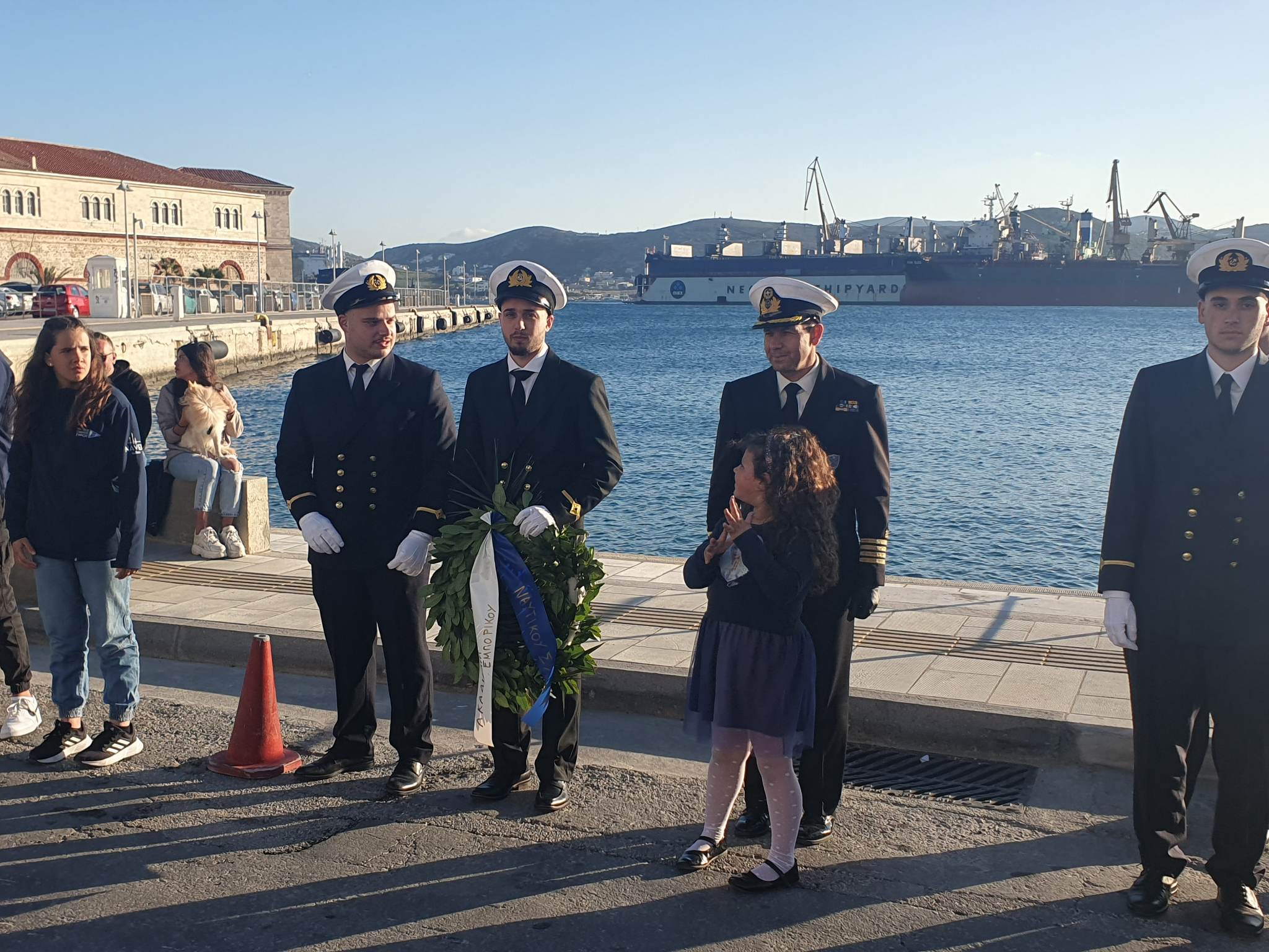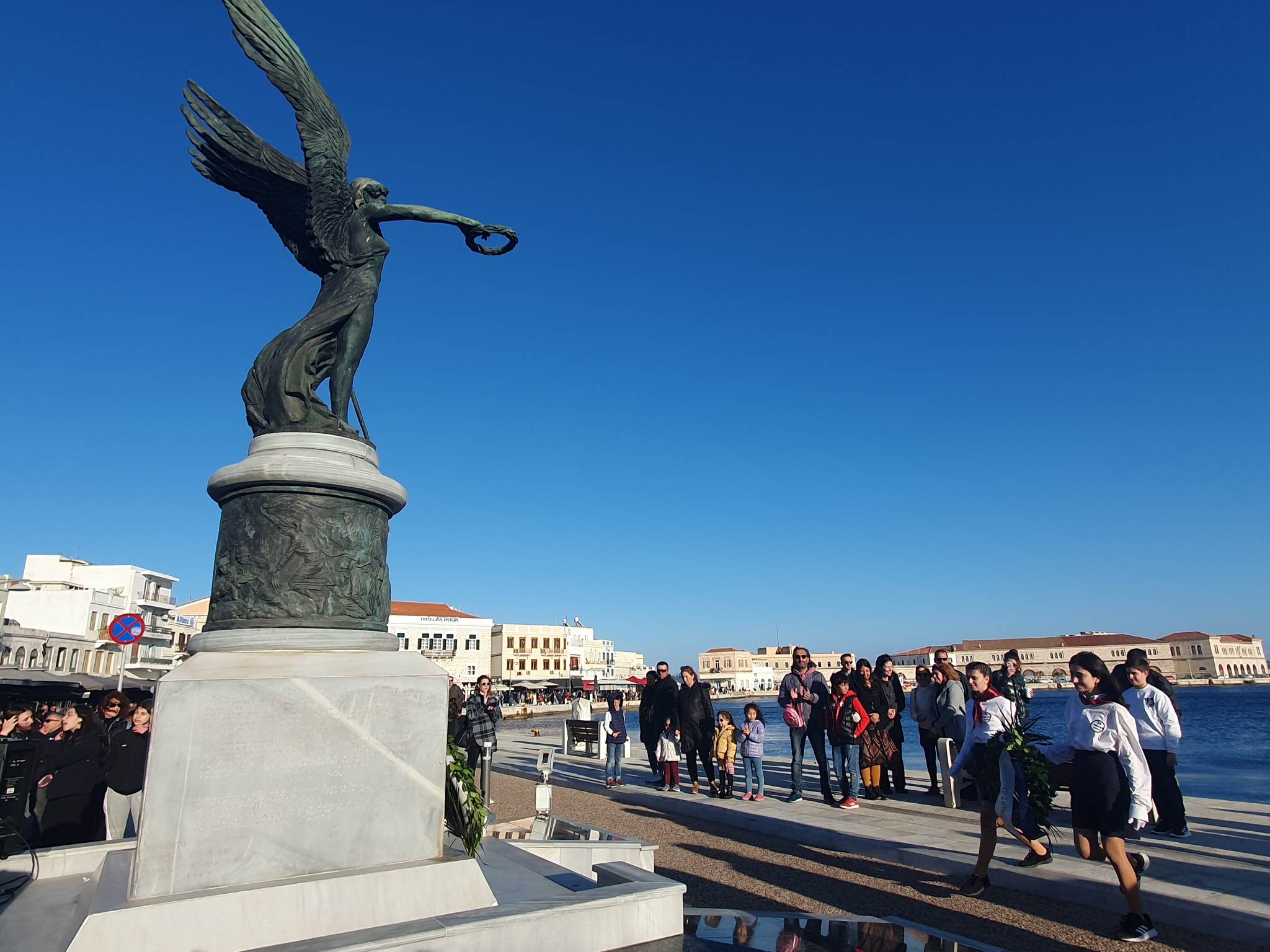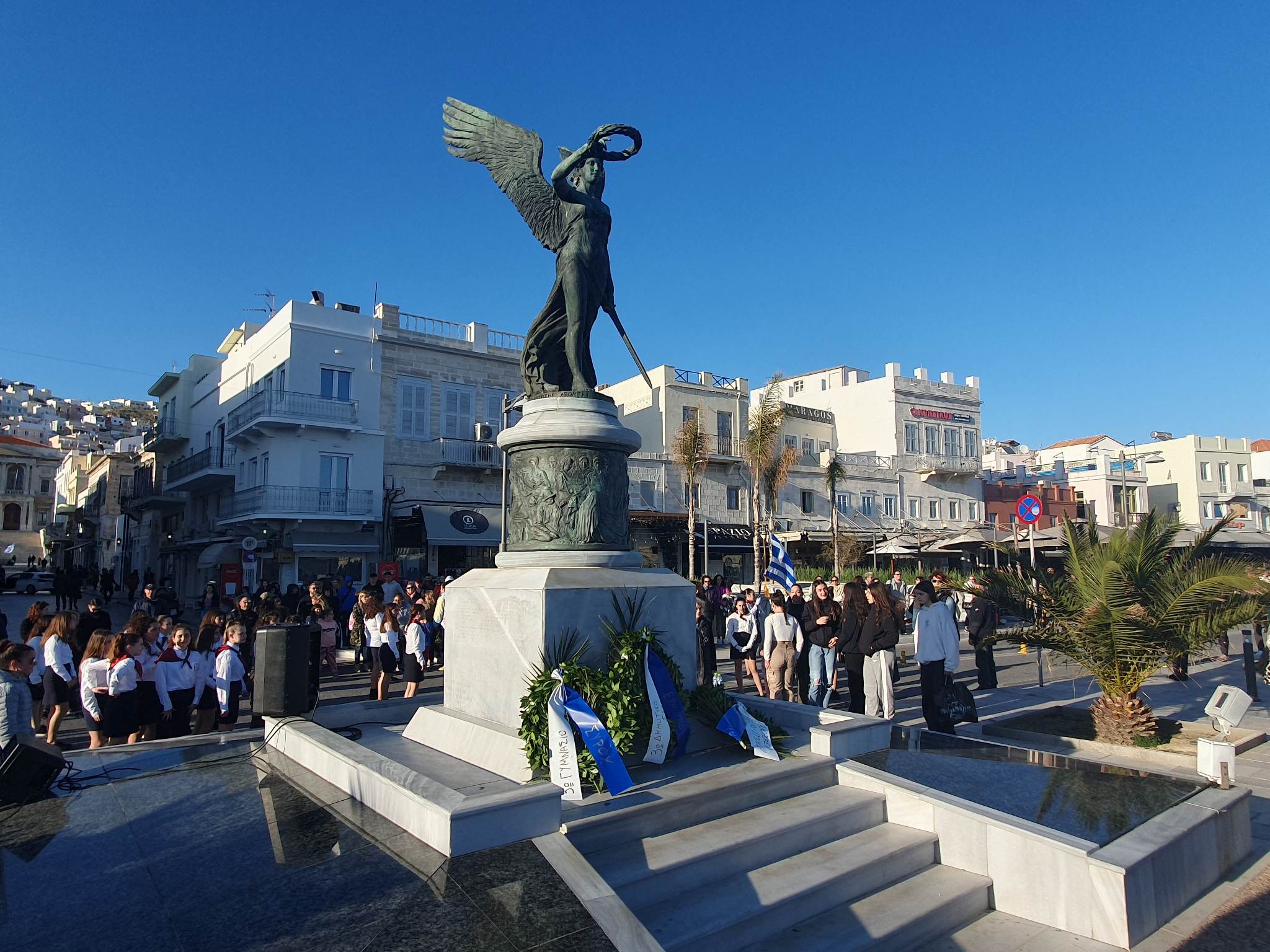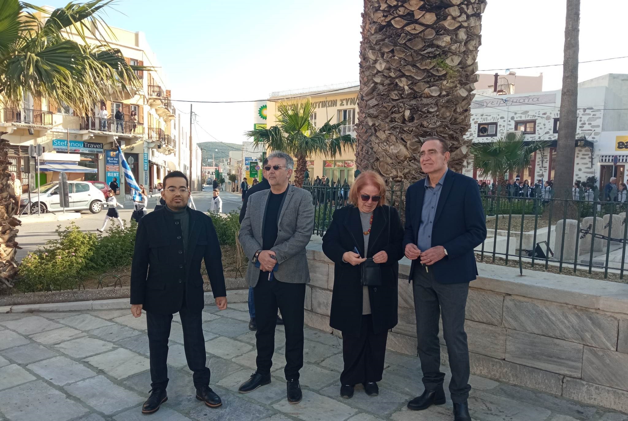 Στα μνημεία της πόλης βρέθηκαν ο δήμαρχος, Νίκος Λειβαδάρας, η πρόεδρος της Δημοτικής Επιτροπής Παιδείας, Ειρήνη Δράκου, ο επικεφαλής της μείζονος μειοψηφίας, Αλέξης Αθανασίου, ο πρόεδρος της Κοινότητας Άνω Σύρου, Πέτρος Ραουζαίος και ο πρόεδρος της ΝΟΔΕ Κυκλάδων, Χρήστος Καφτηράνης.