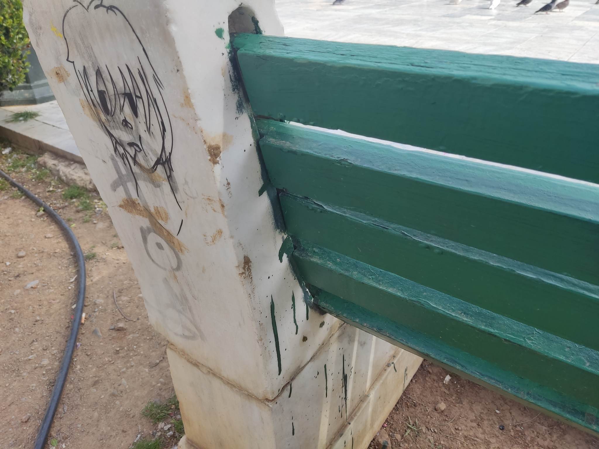 Ειδικότερα, τα μαρμάρινα τμήματά τους, έχουν μετατραπεί δυστυχώς σε “καμβά” εκτόνωσης αγνώστων, οι οποίοι παραβλέποντας συστηματικά την αξία της ύπαρξής τους στην πλατεία, αλλά και το γεγονός πως βρίσκονται σε ένα μεγάλο αρχιτεκτονικό μνημείο, προβαίνουν σε κινήσεις αχαρακτήριστες.