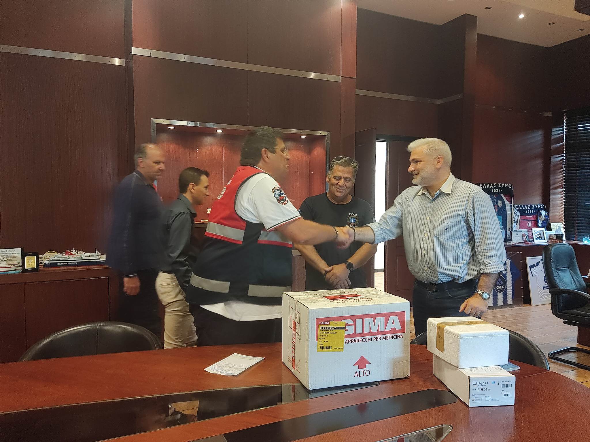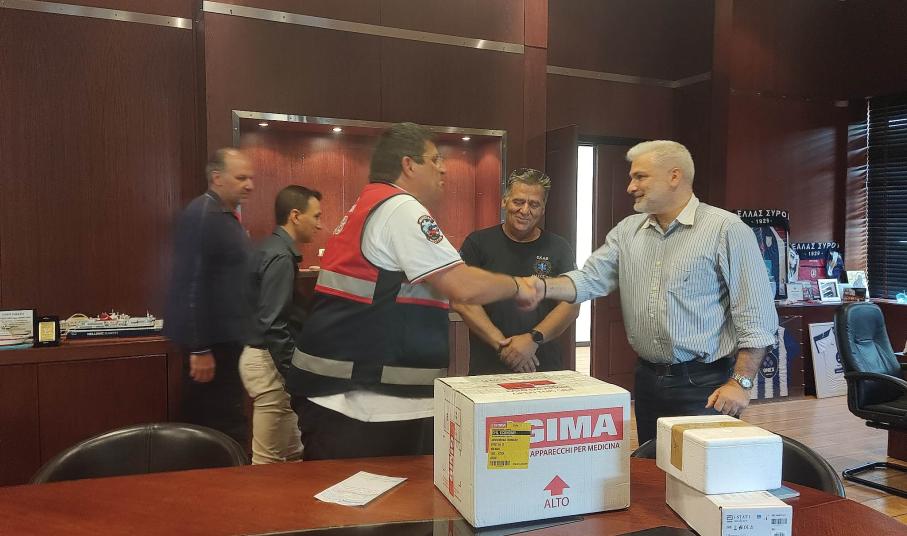 “Στο πλαίσιο της εταιρικής κοινωνικής ευθύνης της ONEX είχαμε συμφωνήσει για μία δωρεά κάποιων απαραίτητων συσκευών για τη λειτουργία του ΕΚΑΒ Σύρου και συγκεκριμένα στο τμήμα αεροδιακομιδών. Αν και ήταν μία απλή υπόθεση, πέρασε από σαράντα κύματα λόγω γραφειοκρατικών διαδικασιών επειδή έπρεπε να υπογραφεί σχετική σύμβαση με το ΕΚΑΒ, να ληφθεί η έγκριση από το Διοικητικό Συμβούλιο του ΕΚΑΒ και και στη συνέχεια να προβούμε στη δωρεά. Πρόκειται για ένα video λαρυγγοσκόπιο και ένα φορητό μηχάνημα - αναλυτής αερίων”, ανέφερε αρχικά ο κ. Πασχαλίδης, τονίζοντας πως σήμερα, “είμαστε στην ευχάριστη θέση να τα παραδώσουμε στο ΕΚΑΒ”.