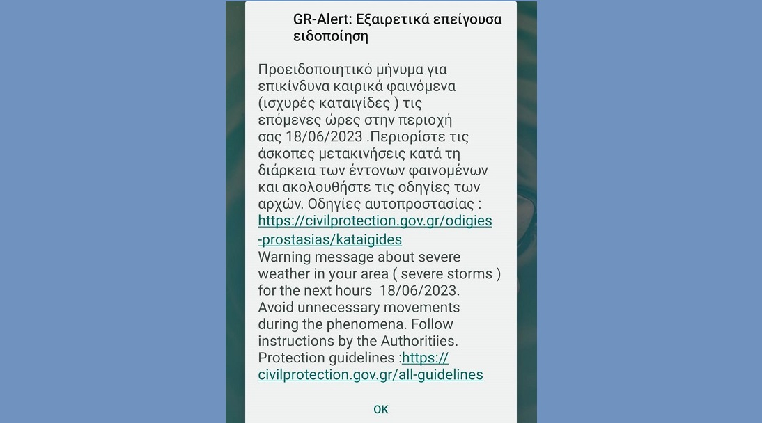 Σύμφωνα με όσα αναφέρει το μήνυμα, αναμένεται έντονη κακοκαιρία γεγονός που υπαγορεύει στους πολίτες να περιορίσουν τις άσκοπες μετακινήσεις τους.