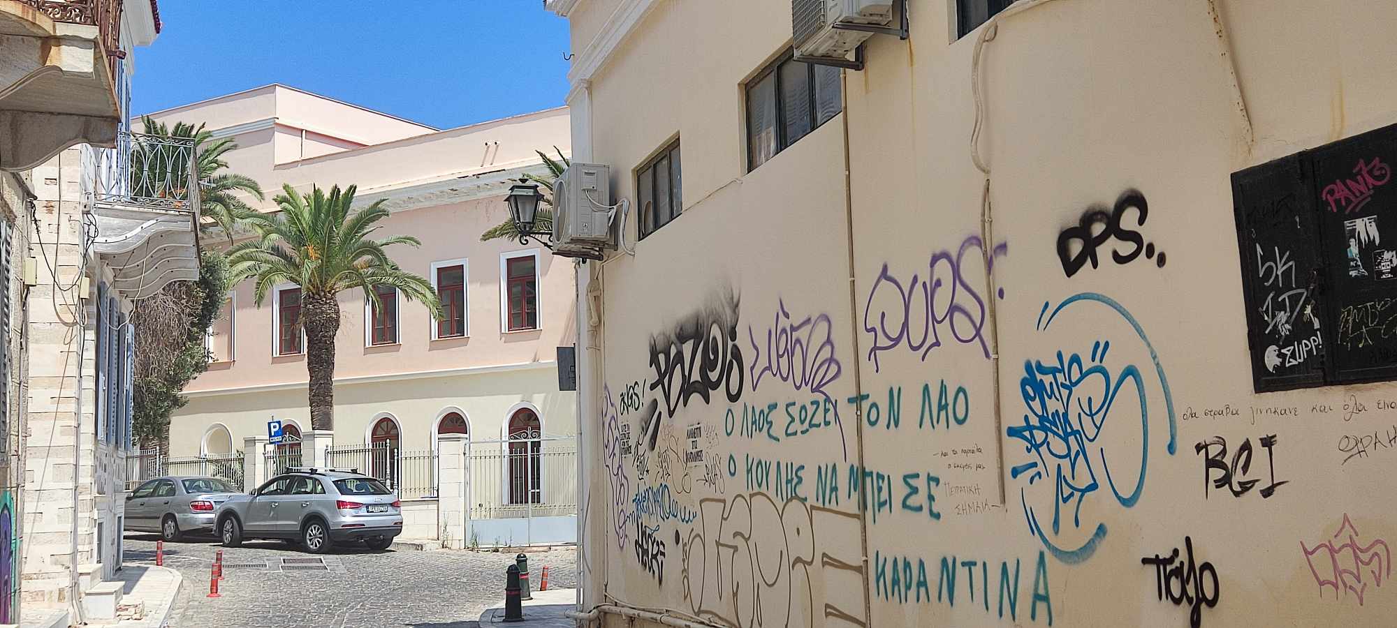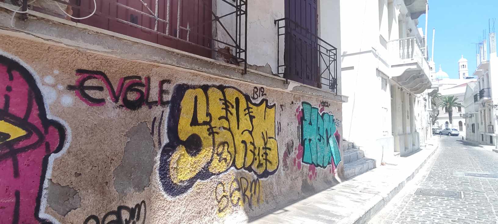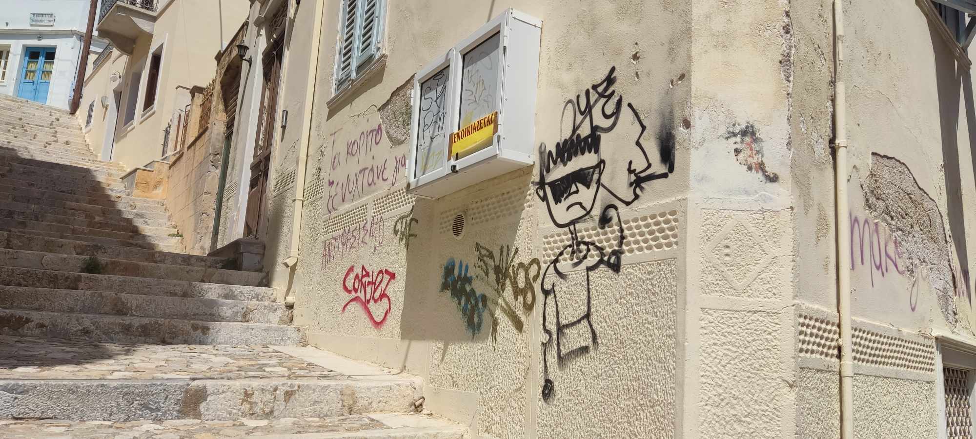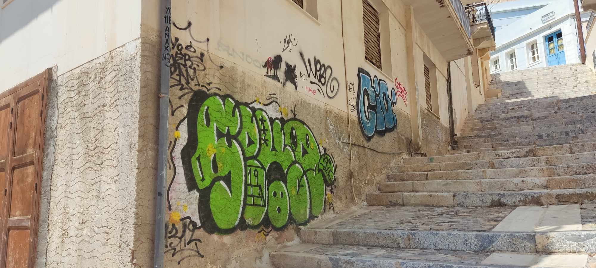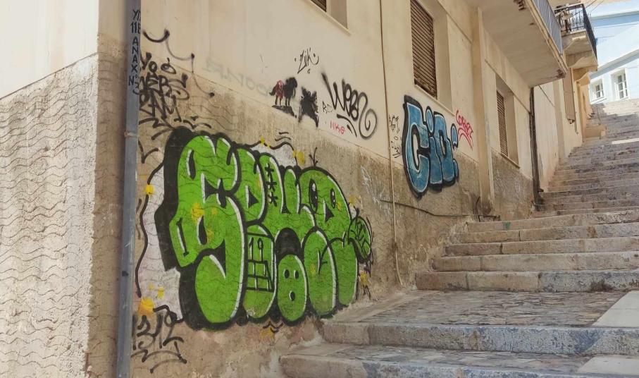 Συνεχίζεται ο κύκλος καταστροφών και αισθητικής υποβάθμισης της Ερμούπολης και του ιστορικού κέντρου, αφού σε διάφορα κτήρια, νέα συνθήματα και γκράφιτι, προδίδουν την αδιαφορία νέων για την αρχιτεκτονική κληρονομιά.