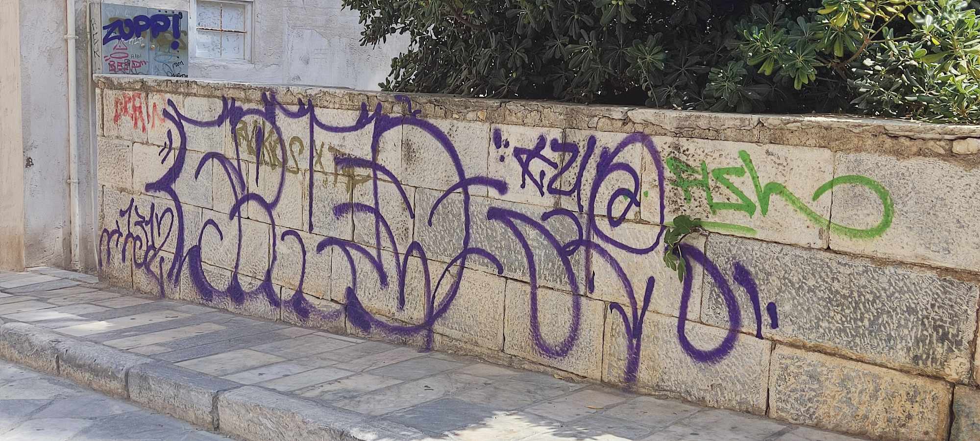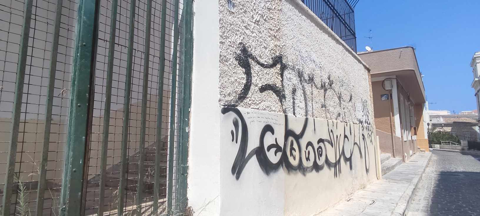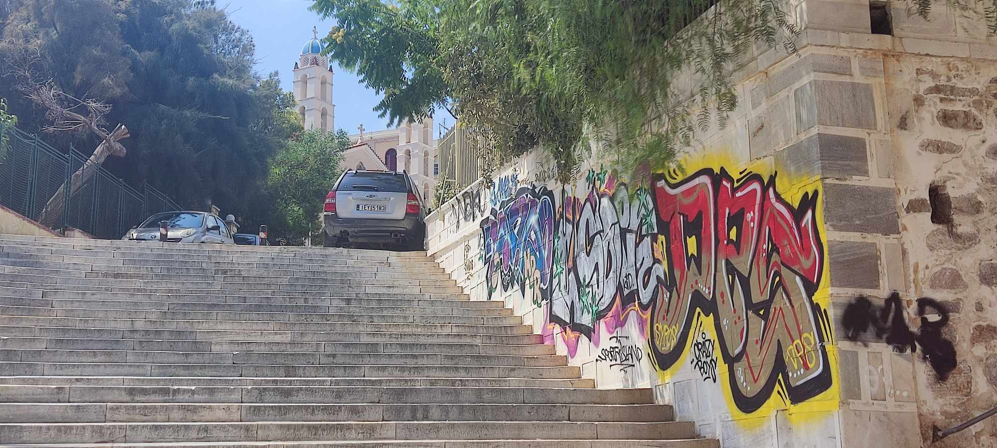Ειδικότερα, με σπρέι έχει βαφτεί μεγάλο μέρος του τοιχίου που περιβάλλει το κηπάριο μπροστά από τον Ι.Ν. του Αγίου Νικολάου, καθώς επίσης και μεγάλο τμήμα του πετρόχτιστου τοίχου στην παιδική χαρά της Μεταμόρφωσης, όπως όμως και στην είσοδο του χειμερινού σινεμά. Παράλληλα, καμβά για… εκτόνωση νέων φαίνεται δυστυχώς πως αποτελεί και η εξωτερική επιφάνεια του 1ου Δημοτικού Σχολείου Ερμούπολης, αλλά και το μικρό κηπάριο της πλατείας Σταύρου Βαφία, όπως και τοίχος κληροδοτήματος της περιοχής.