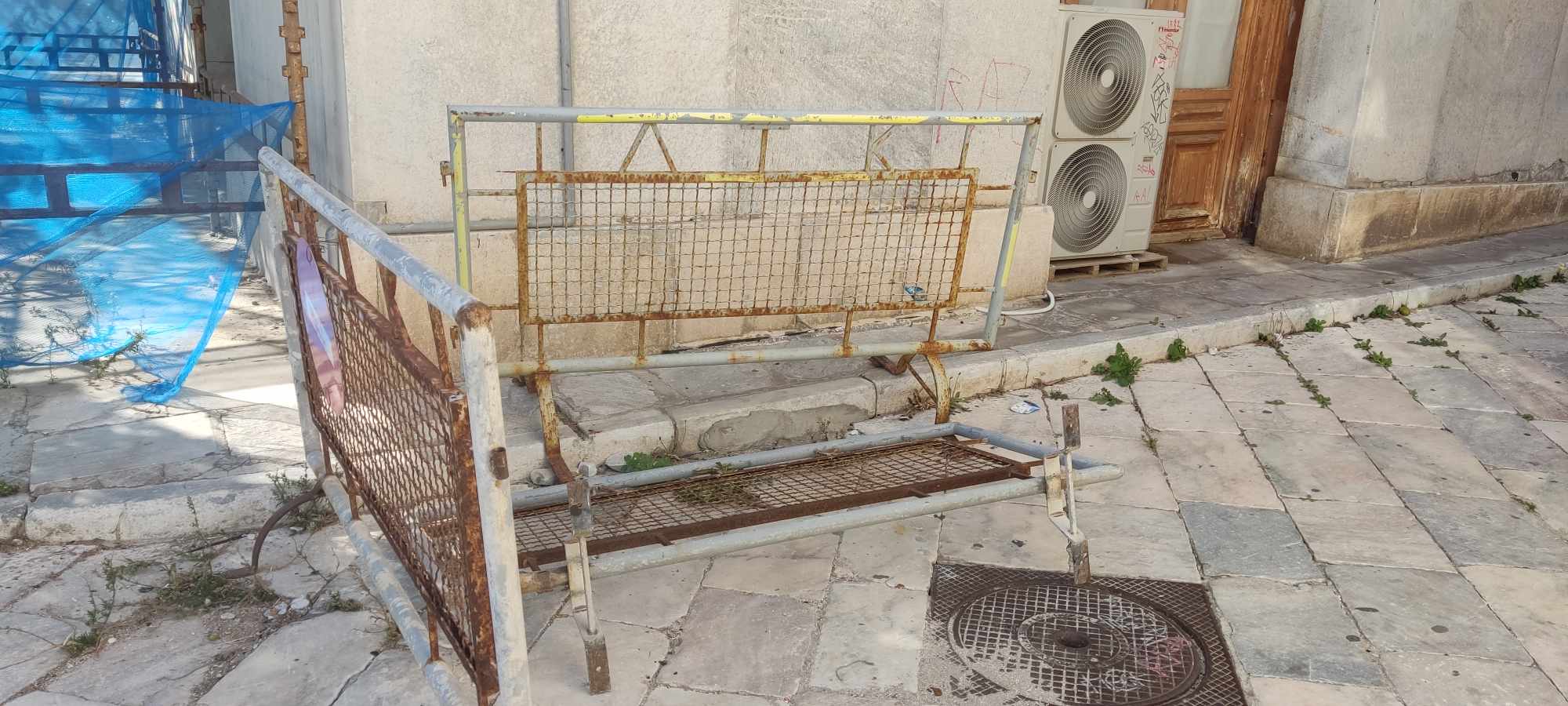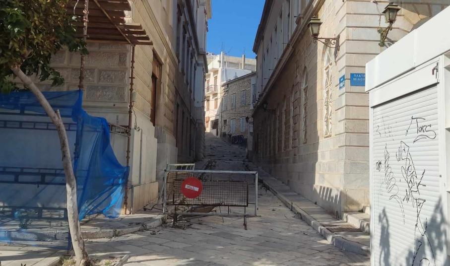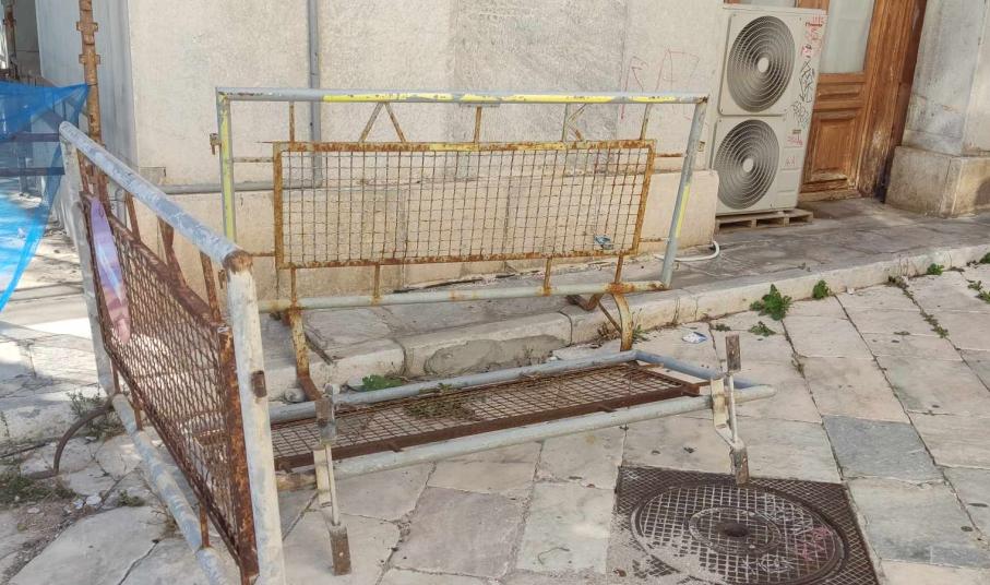 Μετακινήθηκαν και δεν επανατοποθετήθηκαν ποτέ στην αρχική θέση τους, τα απαγορευτικά κιγκλιδώματα στον μικρό δρόμο που συνδέει το Δημαρχιακό Μέγαρο με τη Δημοτική Βιβλιοθήκη Ερμούπολης, παρά τον κίνδυνο που υπάρχει για τους πολίτες, αναφορικά με τις όψεις που σταδιακά καταρρέουν.