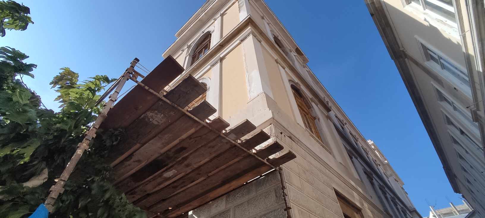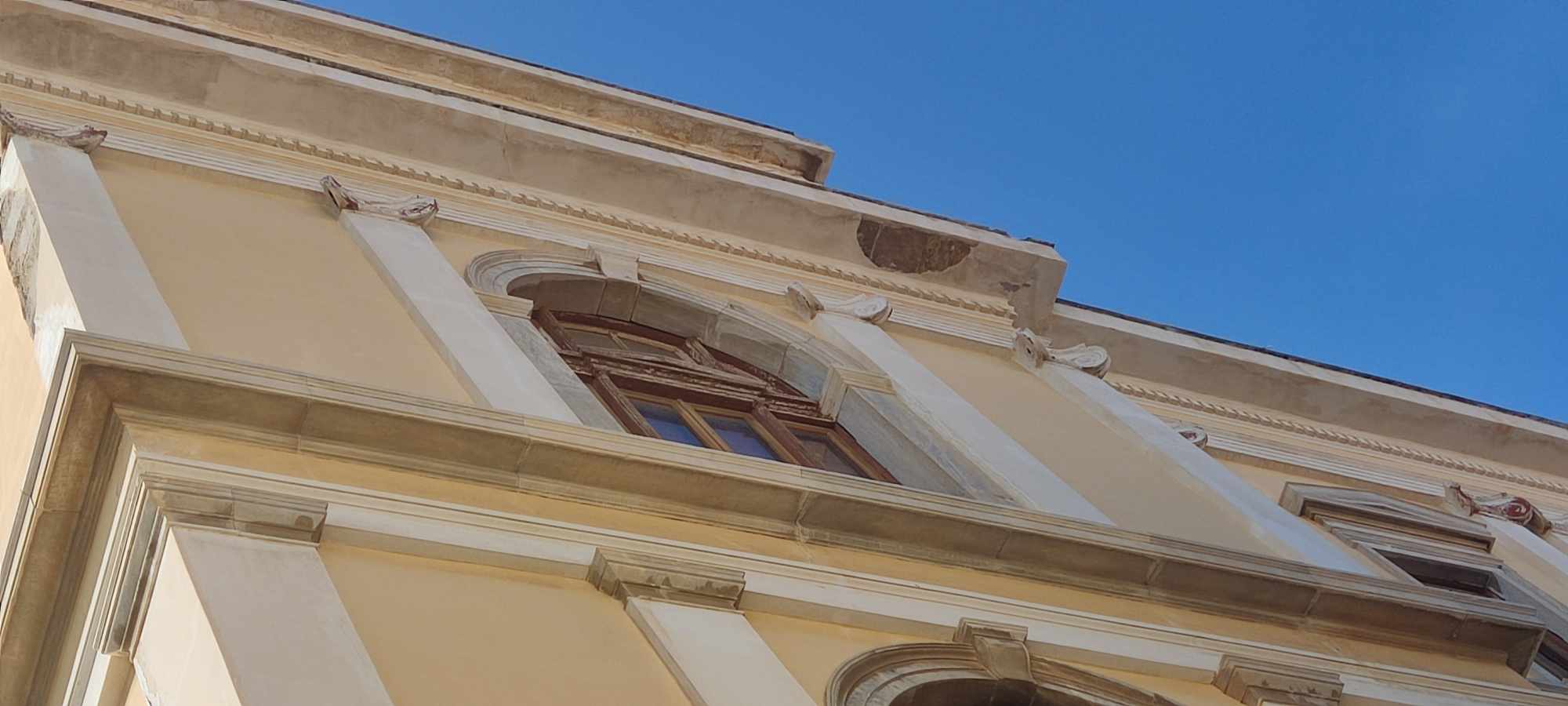 Εν αναμονή της δημοπράτησης του μεγάλου έργου της αποκατάστασης των όψεων του ιστορικού κτηρίου στο κέντρο της πόλης και επί της πλατείας Μιαούλη, ο Δήμος είχε λάβει μέτρα ώστε να μην κινδυνεύουν πεζοί, ωστόσο αυτά, ως φαίνεται… μετακινήθηκαν.