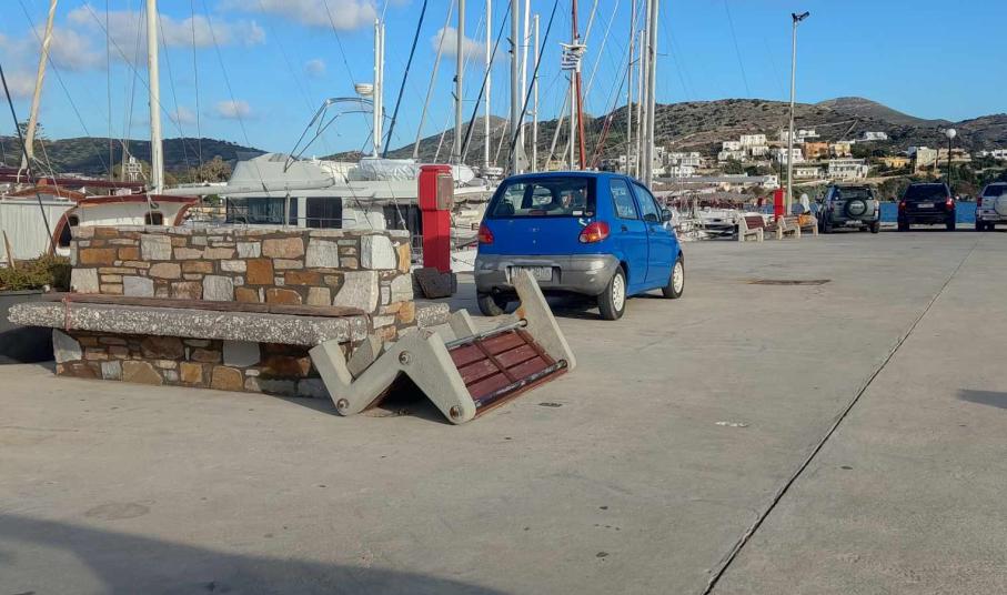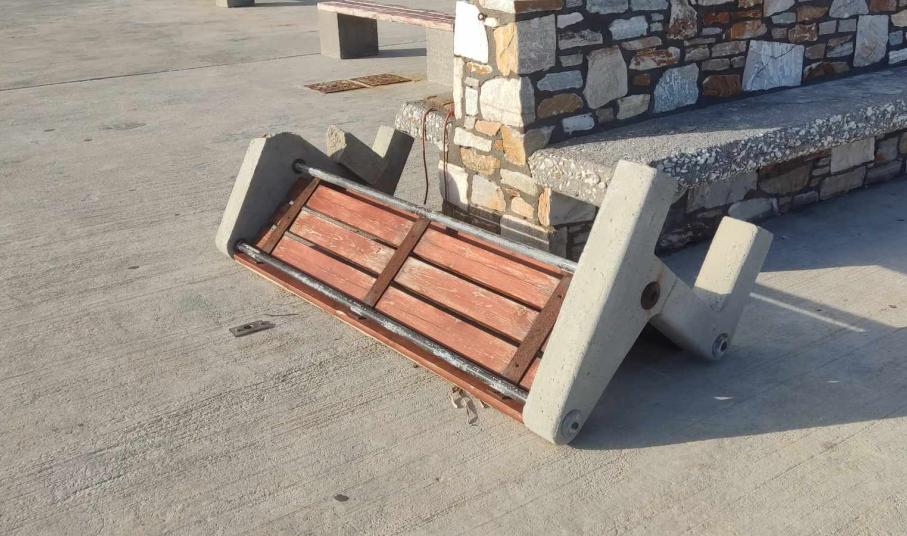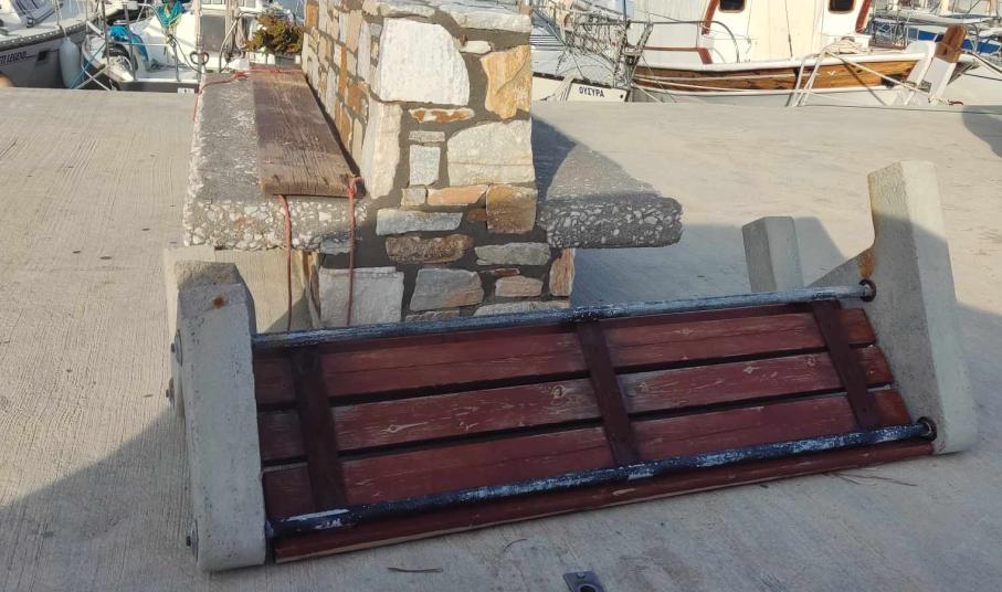 Ειδικότερα, άγνωστοι κατέστρεψαν μέρος της τσιμεντένιας βάσης του, “κόβοντας” ουσιαστικά ένα τμήμα του, με αποτέλεσμα να το αχρηστεύσουν. Όπως διαπιστώνεται από το φωτογραφικό υλικό της εφημερίδας, το παγκάκι είναι παρατημένο σε ένα μέρος του καταφυγίου, χωρίς αποκατάσταση, για την οποία θα πρέπει να φροντίσει το Λιμενικό Ταμείο Σύρου.