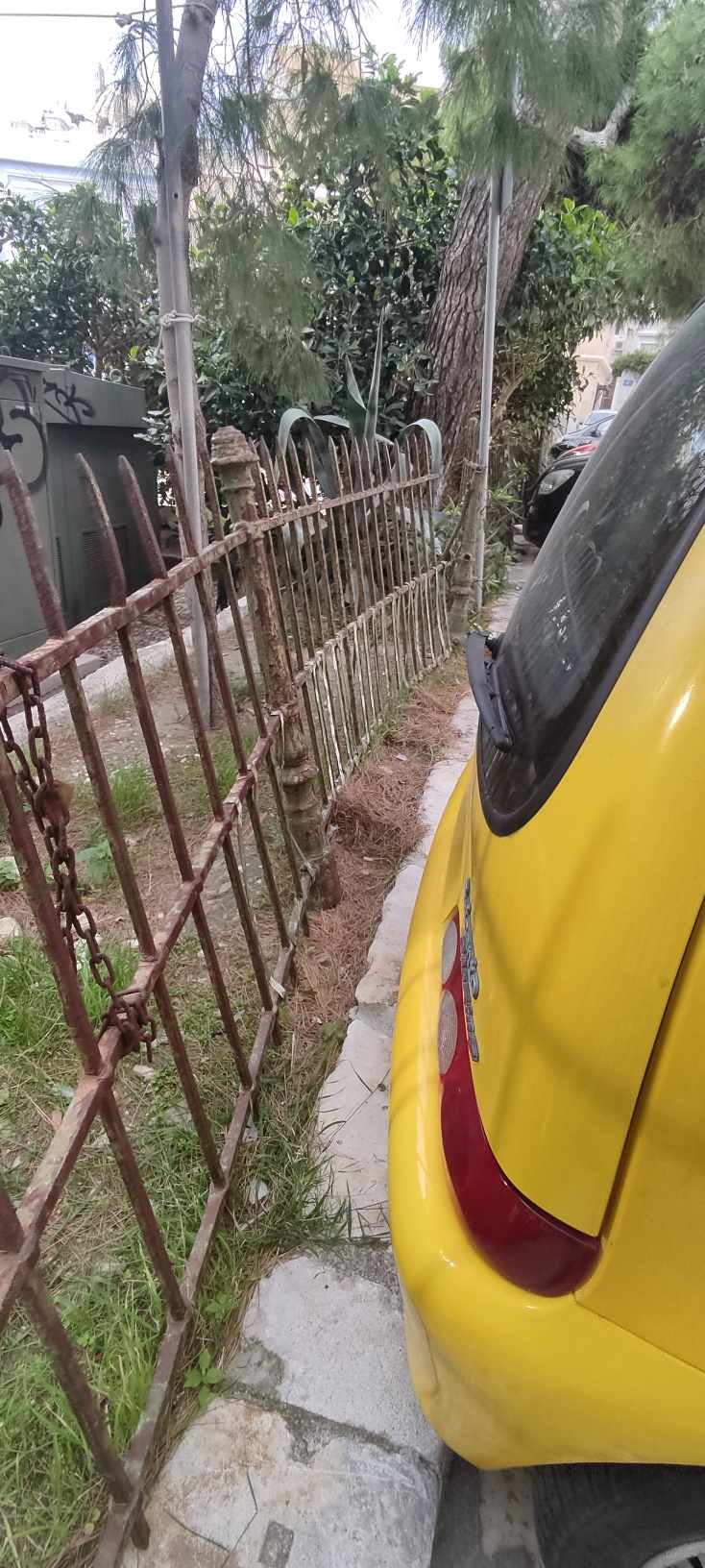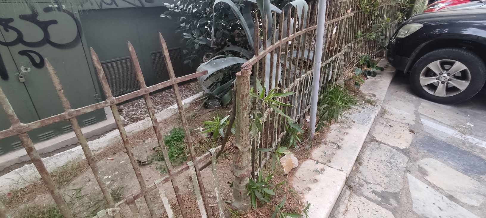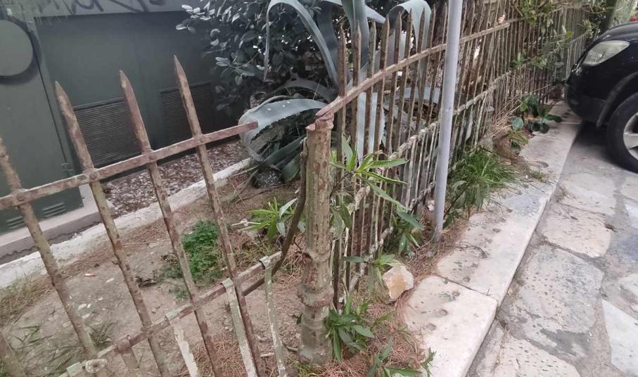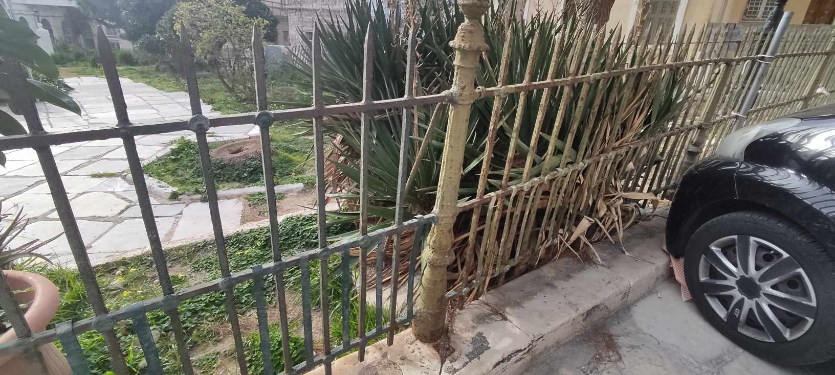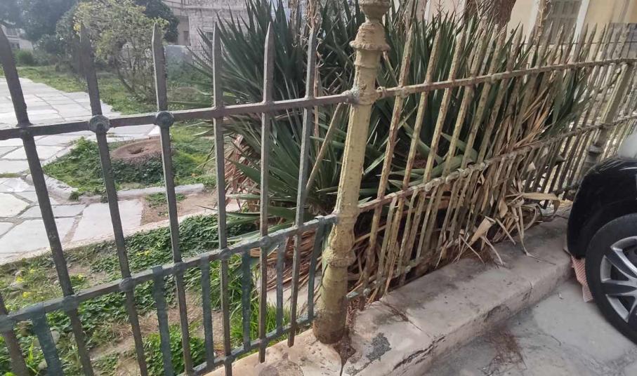 Ειδικότερα, οι φθορές στο κηπάριο είναι μεγάλες και αφορούν κυρίως στην άκρως κατεστραμμένη περίφραξη και δη στο επάνω μέρος της, αφού μάλιστα ένα κομμάτι της βρίσκεται στον αέρα μετά από πρόσκρουση οχημάτων. Επιπλέον, άλλα τμήματά της έχουν βαφτεί και άλλα παραμένουν σε άθλια κατάσταση, σκουριασμένα, με αποτέλεσμα η εικόνα του κηπαρίου να υποβαθμίζεται λόγω ανομοιομορφίας. Ακόμη, σε κακή κατάσταση είναι και το τοιχίο του, καθώς φέρει μεγάλες φθορές από γκράφιτι και σπρέι.