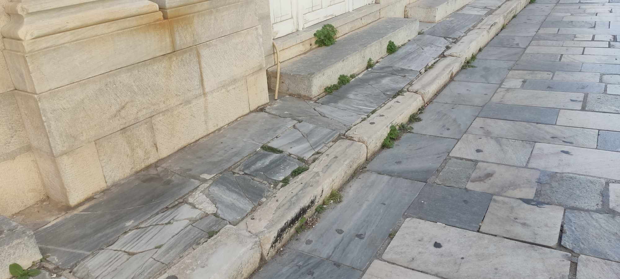 Σπασμένες πλάκες, αποκολλημένα μάρμαρα, μεγάλα τμήματα πεζοδρομίων που έχουν καταστραφεί και αποκόλληση πλακών, συνθέτουν την κακή εικόνα της ιδιαίτερης πόλης της Σύρου, την οποία περπατούν όχι μόνον οι κάτοικοί της αλλά και πολλοί επισκέπτες.