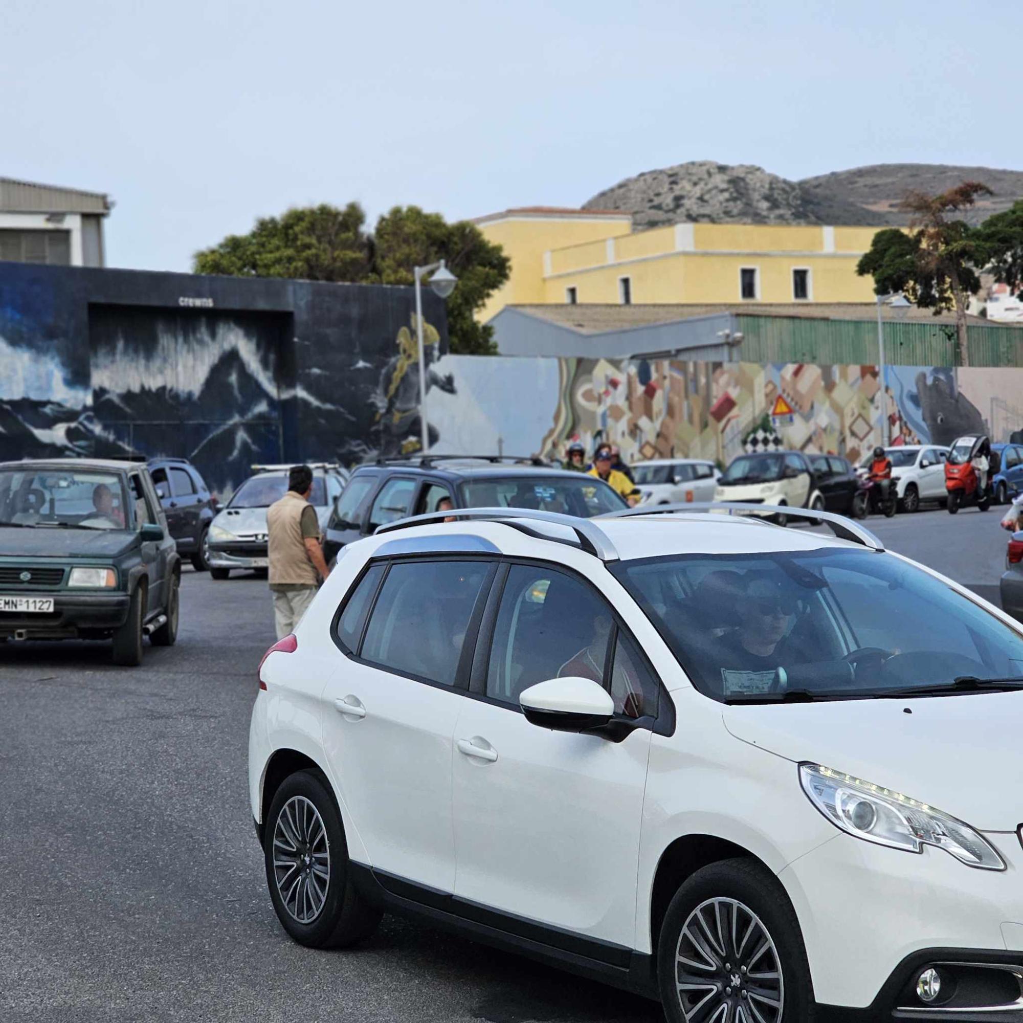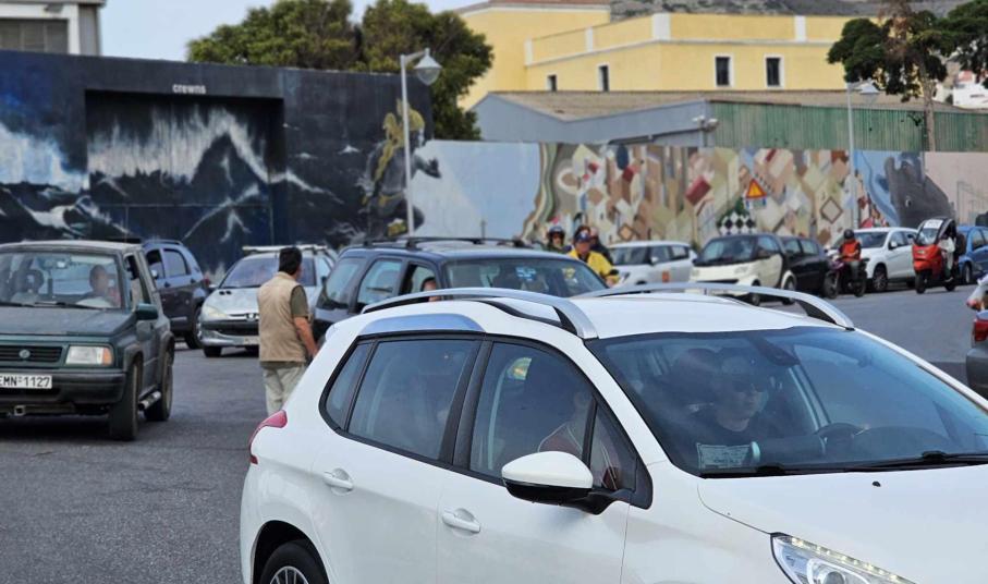 Ουρές οχημάτων αναμένουν να επιτραπεί η πρόσβαση για το πρώτο πλοίο που καταπλέει στην Ερμούπολη