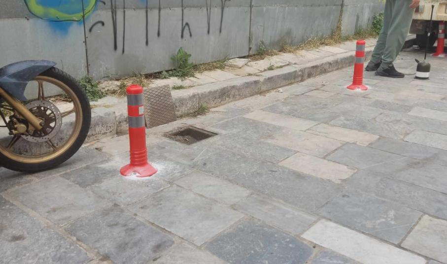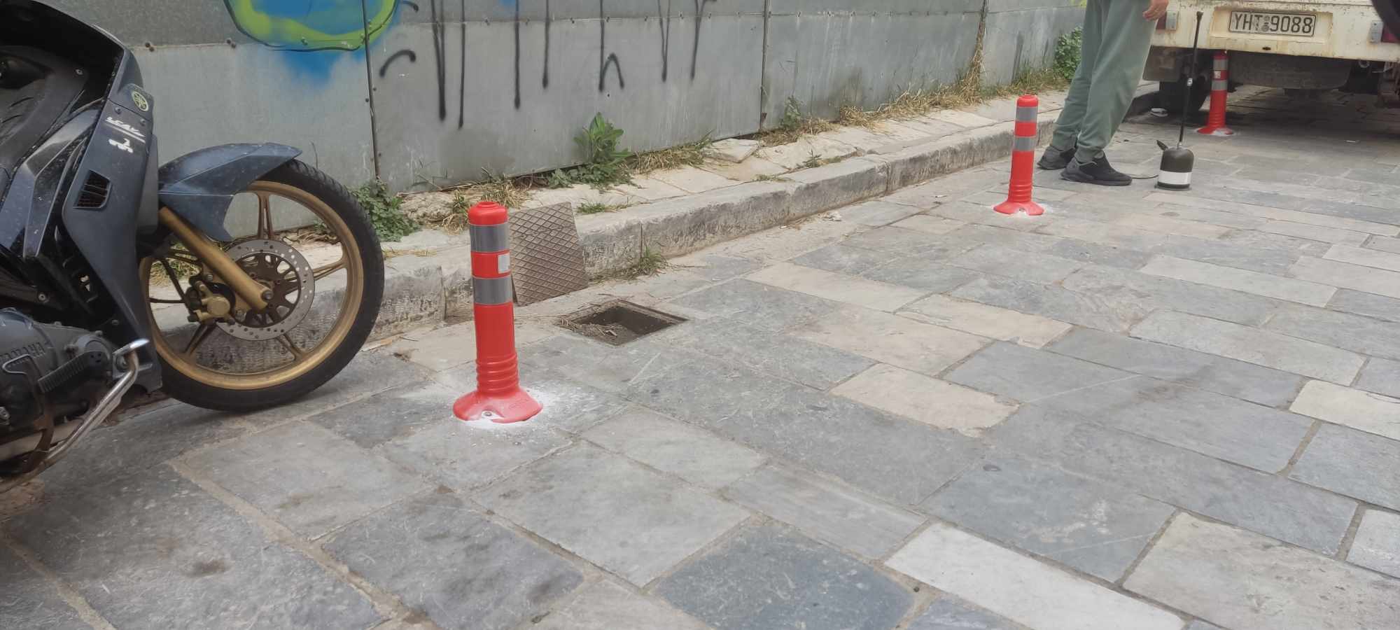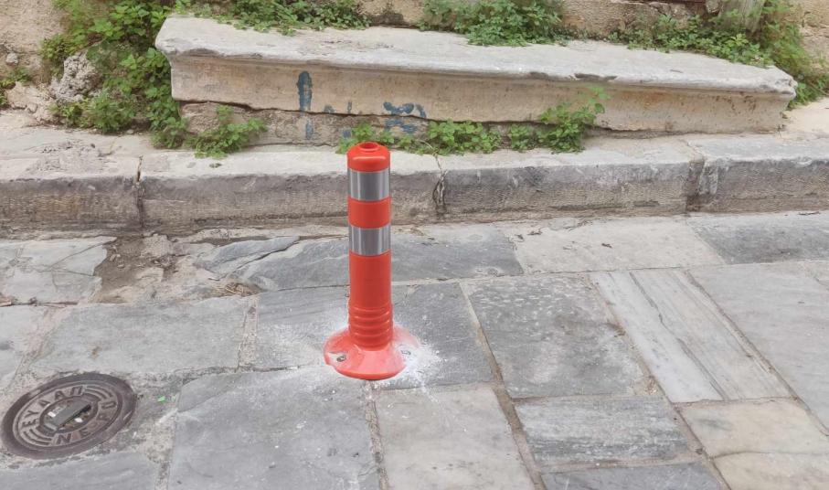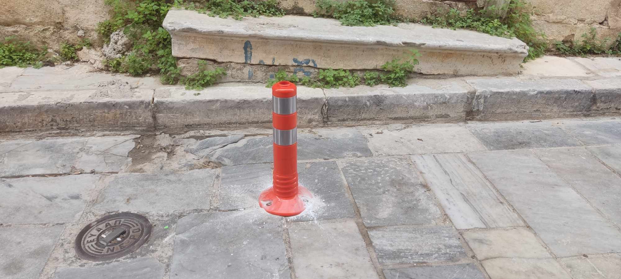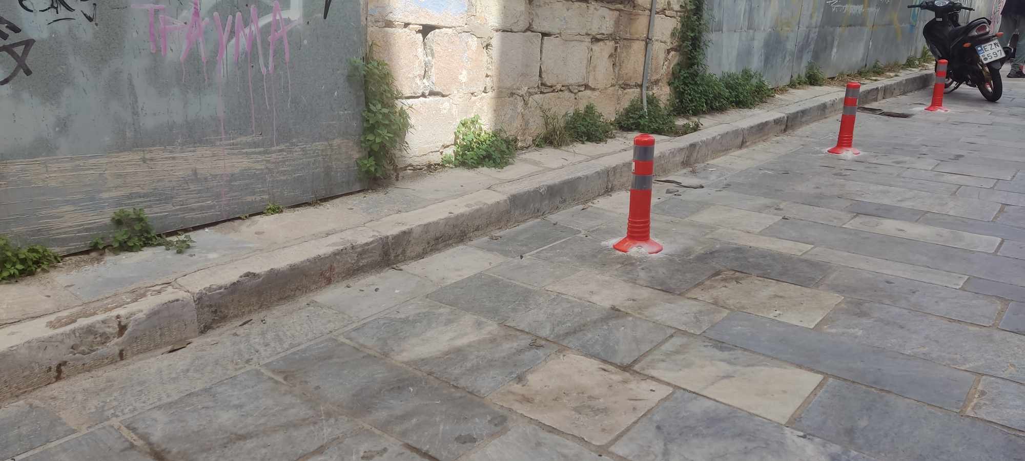 Γέμισε ασφυκτικά η οδός Απόλλωνος με πλαστικά κολωνάκια από χθες το πρωί, προκειμένου να εμποδίζεται η στάθμευση οχημάτων, σε έναν δρόμο ιδιαίτερα περιορισμένο σε πλάτος, που χρησιμοποιείται για την απομάκρυνση των οδηγών από το ιστορικό κέντρο.